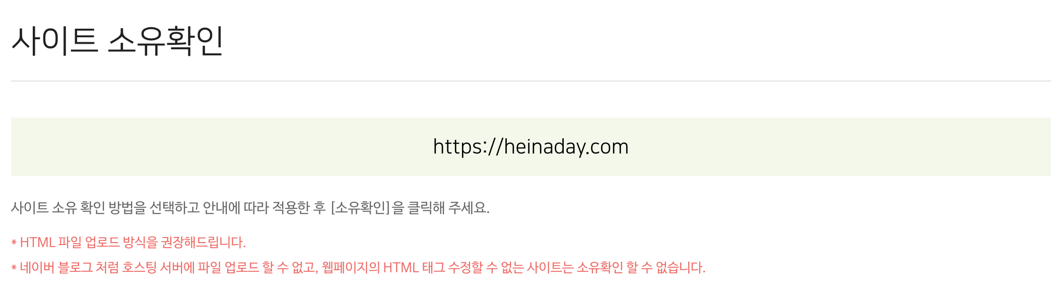 html 파일 업로드 방식을 권장한다고 하며, 호스팅 서버에 파일을 업로드 할 수 없고, 웹페이지의 html 태그 수정을 할 수 없는 사이트는 소유 확인이 불가능하다고 한다. 티스토리 블로그는 html 편집이 가능하기 때문에 소유확인이 가능하다.