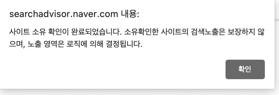 사이트의 소유 확인이 완료되었다는 팝업창이 뜬다. 소유확인한 사이트의 검색노출은 보장하지 않으며, 노출 영역은 로직에 의해 결정된다고 한다. 네이버 웹마스터 도구에 티스토리 사이트 등록이 완료되었다.