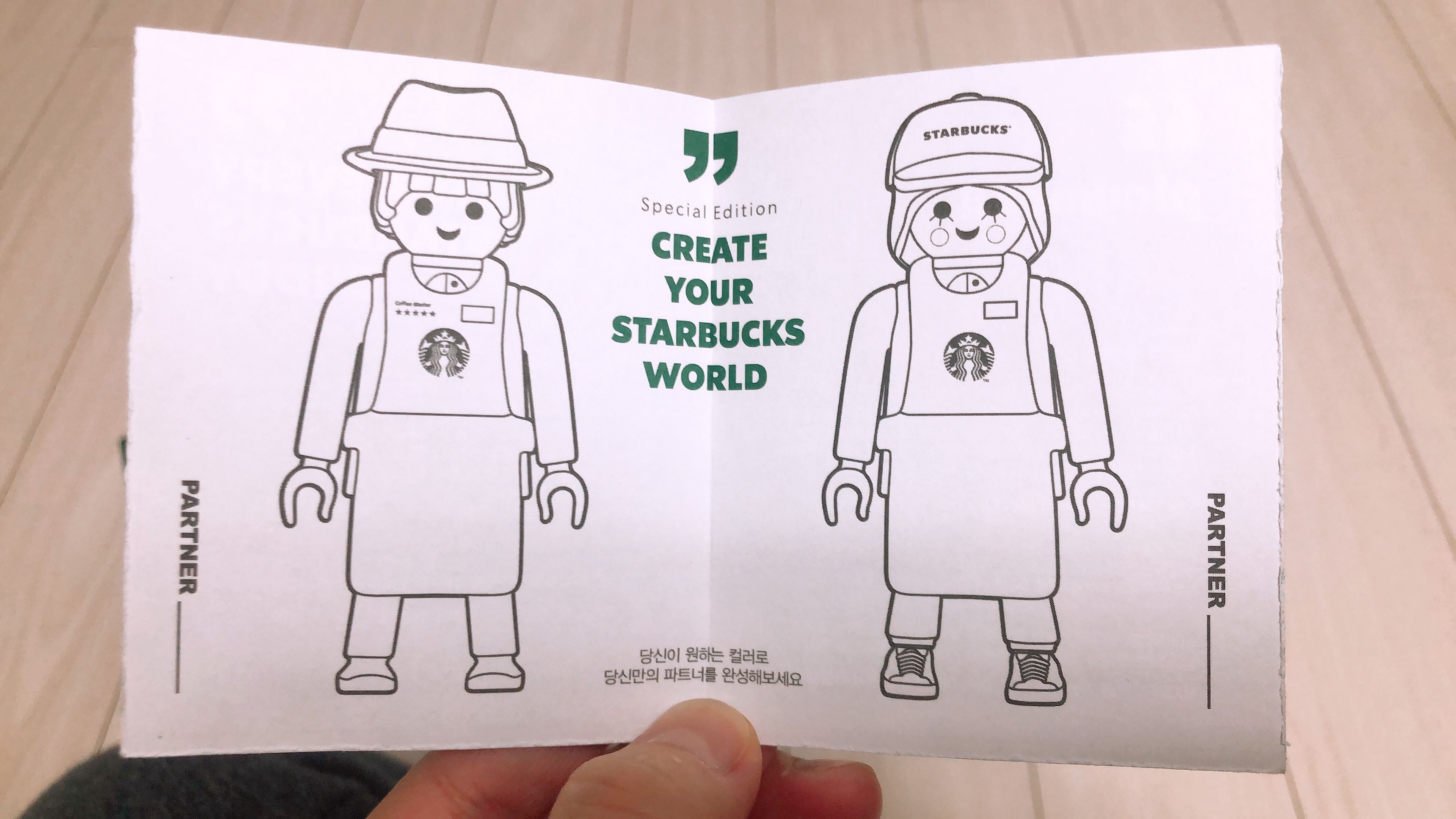종이 표지에는 "For every starbucks buddy" 라는 문구와 함께 프로젝트 소개 & 함께한 브랜드인 플레이모빌 소개가 적혀 있으며, 안 쪽에는 컬러링을 할 수 있도록 피규어 스케치가 그려져 있다. 무려 실제 피규어와 똑같은 실물크기이다.