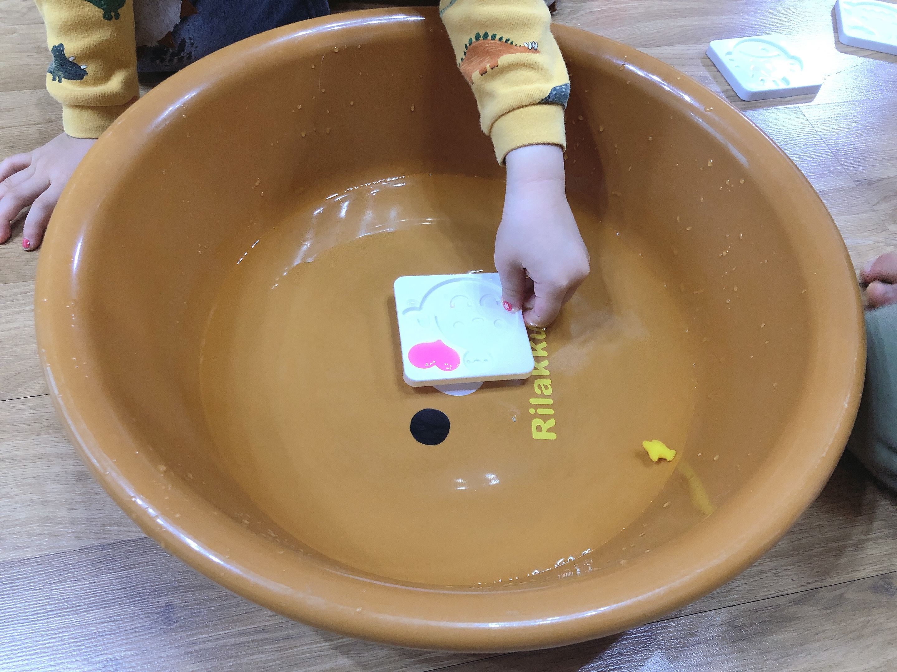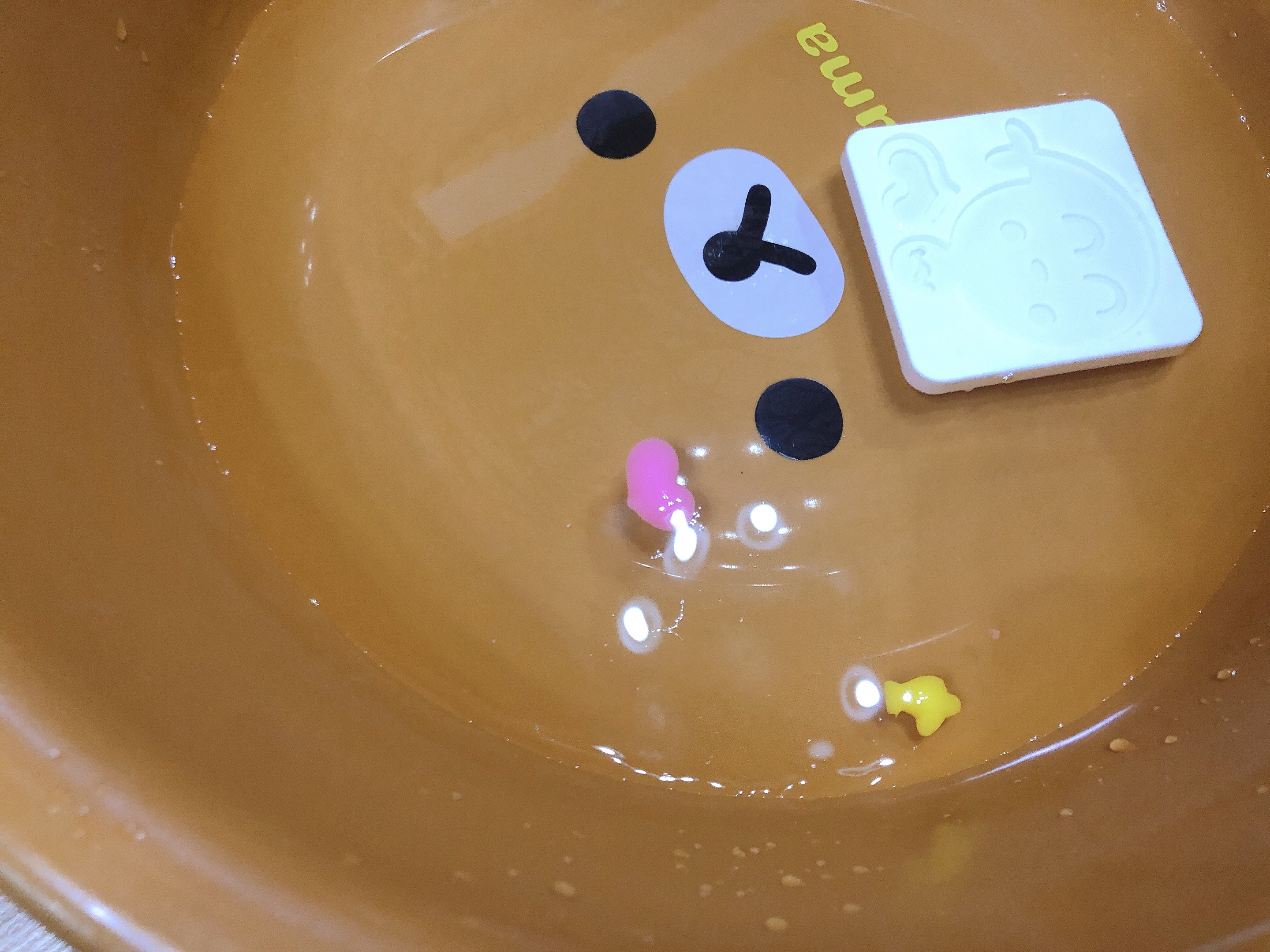 매직물감을 다 채웠다면 캐릭터 모형틀의 양 끝을 잡고 미니 수조 속에 넣어준다. 손을 좌, 우로 살살 흔들어주면 캐릭터 모형틀 안에서 매직물감이 모양대로 떨어져 물 속으로 들어간다. 직접 해보니 일단 수조 속에 넣고 30초~1분 정도 지나면 매직물감이 조금 줄어드는 것을 확인할 수 있는데, 억지로 분리하려고 하면 모양이 흐트러지니 시간에 맡기는 것이 더 나은 것 같다. 흔들어서 떨어뜨린다(X) ->떨어지려고 하면 흔들어서 분리되도록 도와준다(O) 이런 느낌으로 만들어 주어야 한다.