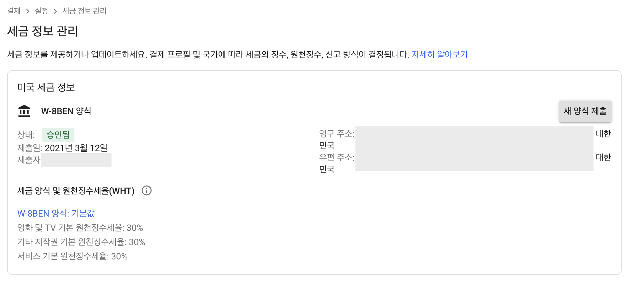 W-8BEN 양식의 세금 정보가 제대로 등록된 것을 확인할 수 있다. 원천징수세율(WHT)이 30% 나 되지만 나의 애드센스는 미국에서 발생하는 수익이 거의 없다고 봐도 무방하므로 크게 걱정할 필요는 없어 보인다. 이 포스팅이 많은 분들에게 도움이 되었으면 좋겠다.