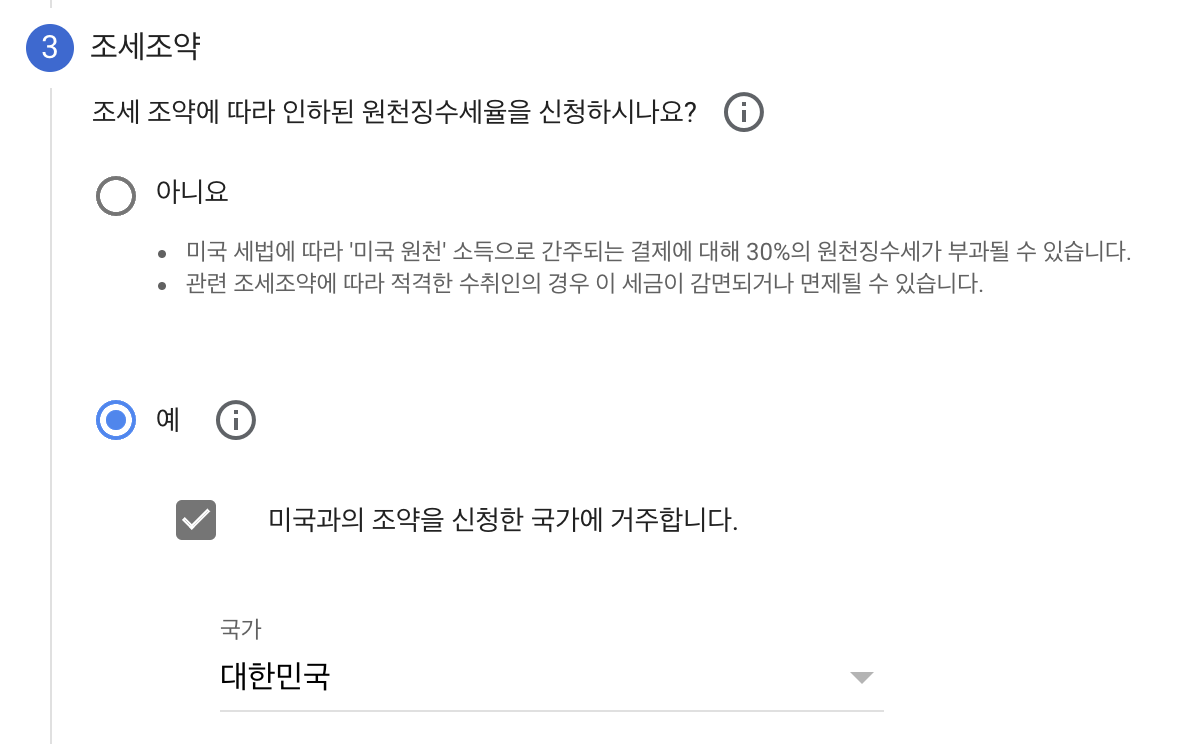 세번째 작성 항목은 조세조약에 따라 인하된 원천징수세율을 신청하겠냐는 질문이다. 대한민국은 미국과의 조약을 신청한 국가이다. 하지만 사업자가 아닌 개인은 '아니요'를 선택해야 한다.