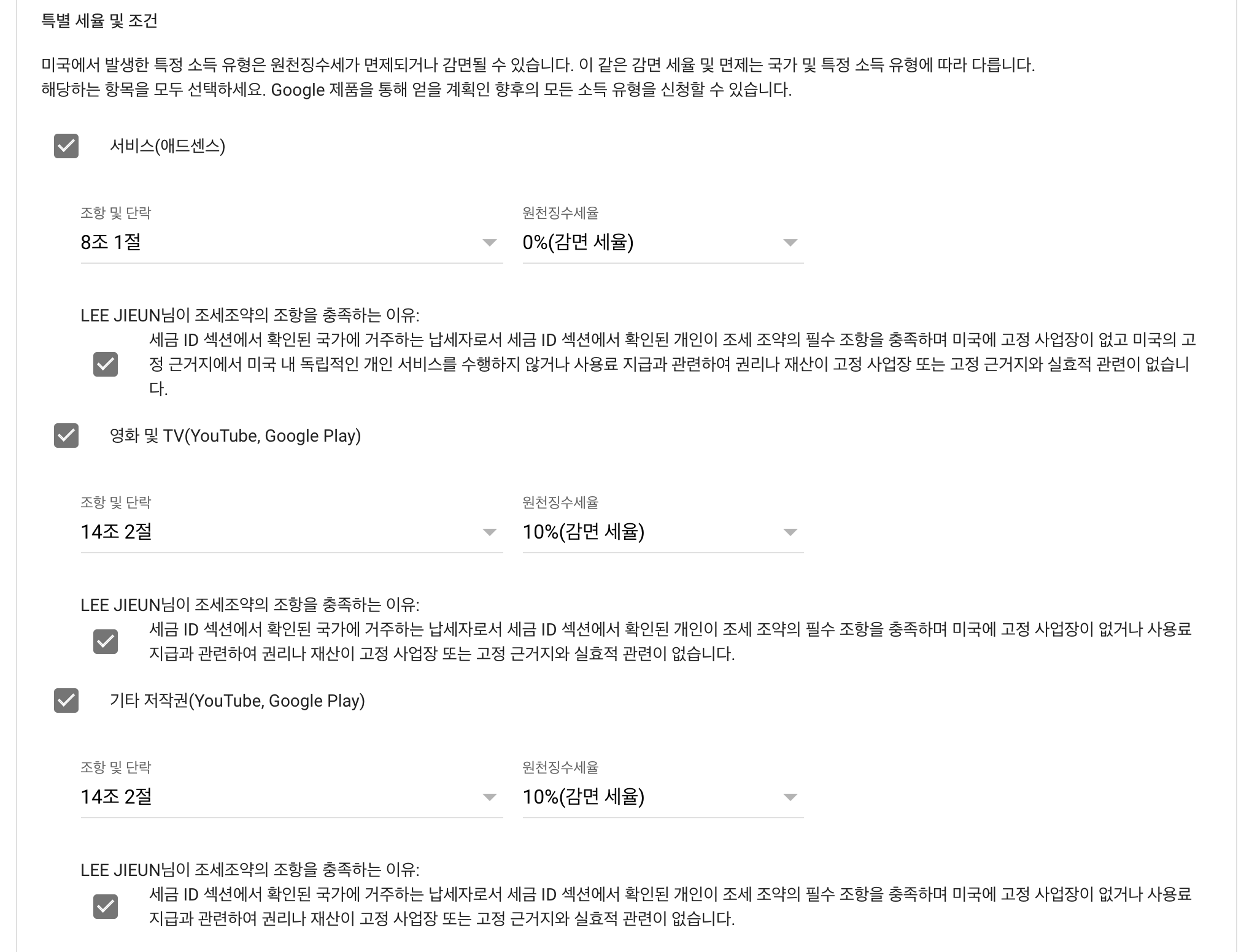 참고로 사업자의 경우에는 아래와 같이 선택하면 된다. (원천징수세율 신청 - 네 / 대한민국 선택, 특별세율 체크박스 모두 체크하고 감면 세율을 선택)