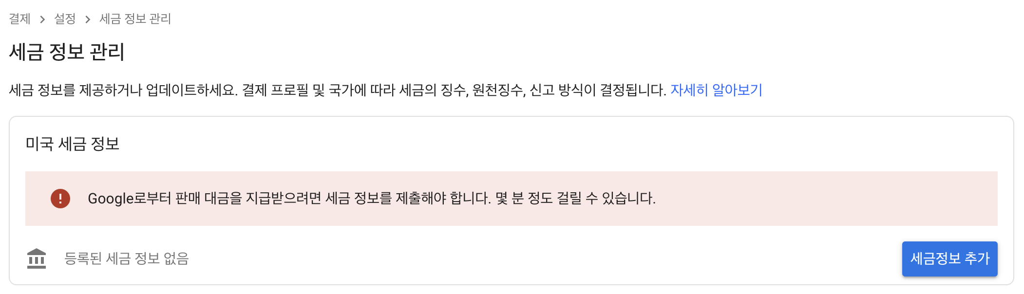 구글로부터 판매 대금을 지급받으려면 세금 정보를 제출해야 한다는 안내 메세지가 나온다. 세금정보 추가 버튼을 클릭하자.