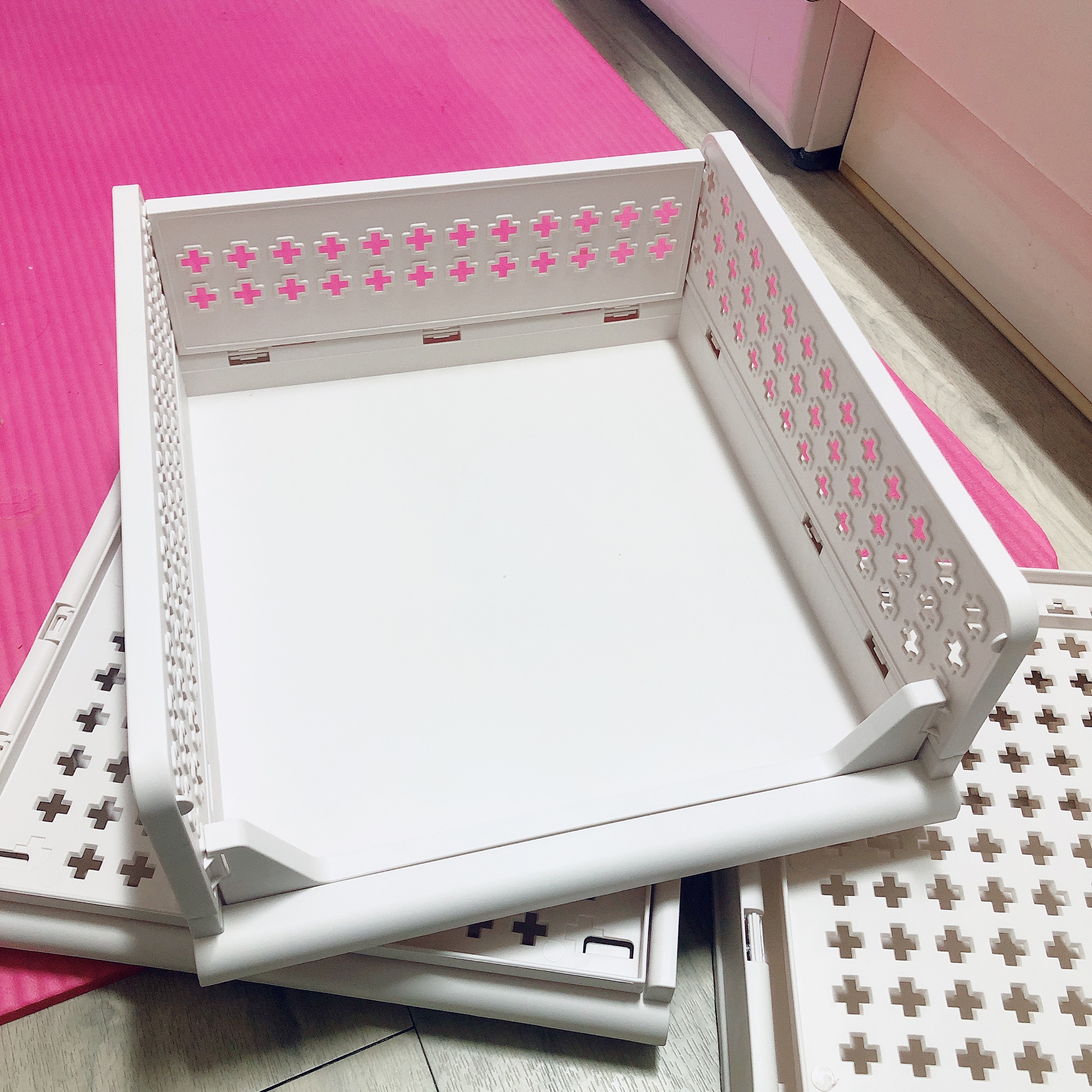 왼쪽부터 차례대로 중형, 대형, 특대형이다. 누구나 쉽게 조립을 하거나 해제할 수 있어서 공간활용도가 높다. 사용하지 않는 리빙박스는 다시 접어서 틈새에 쏙 넣어 보관하다가 다시 필요할 때 조립하면 된다.