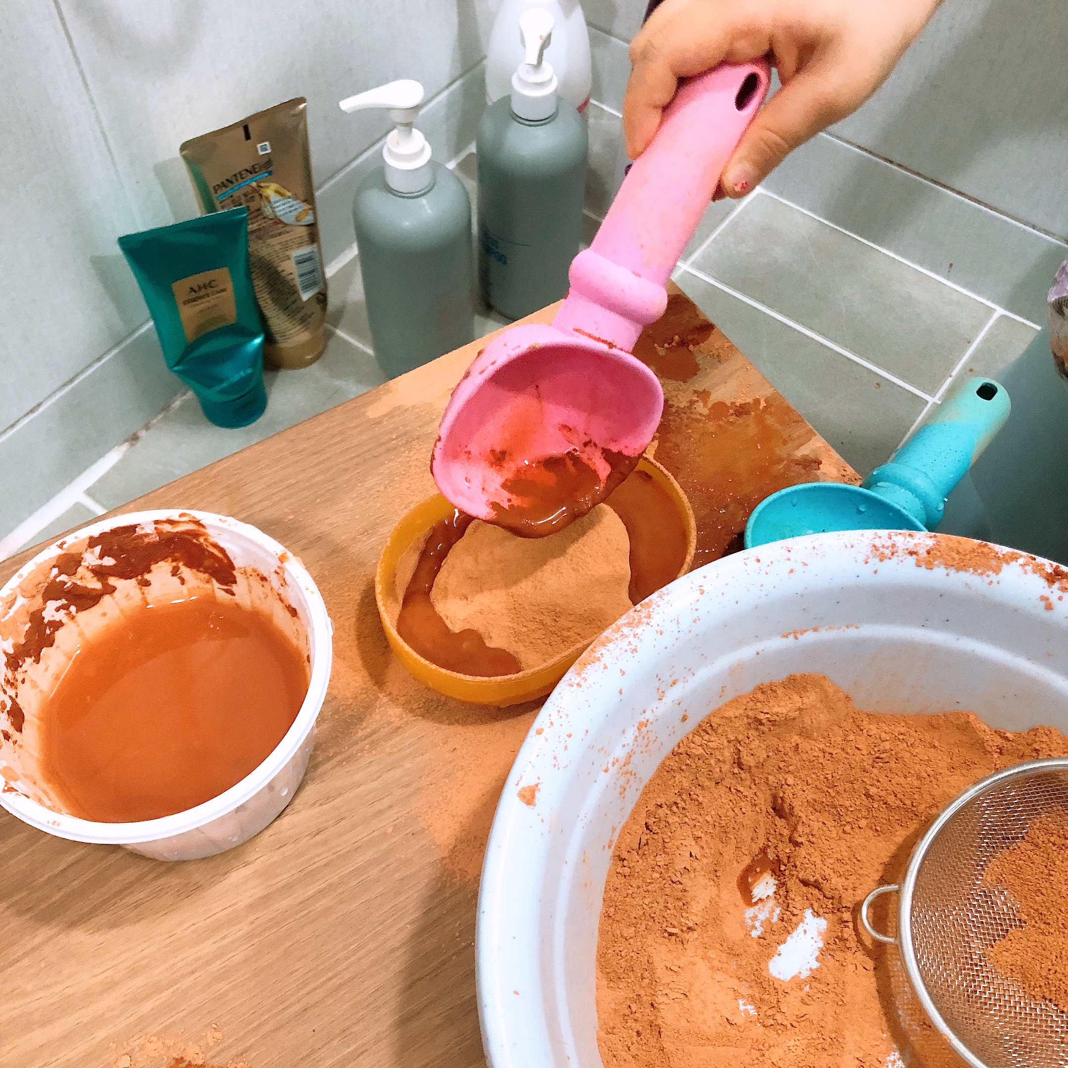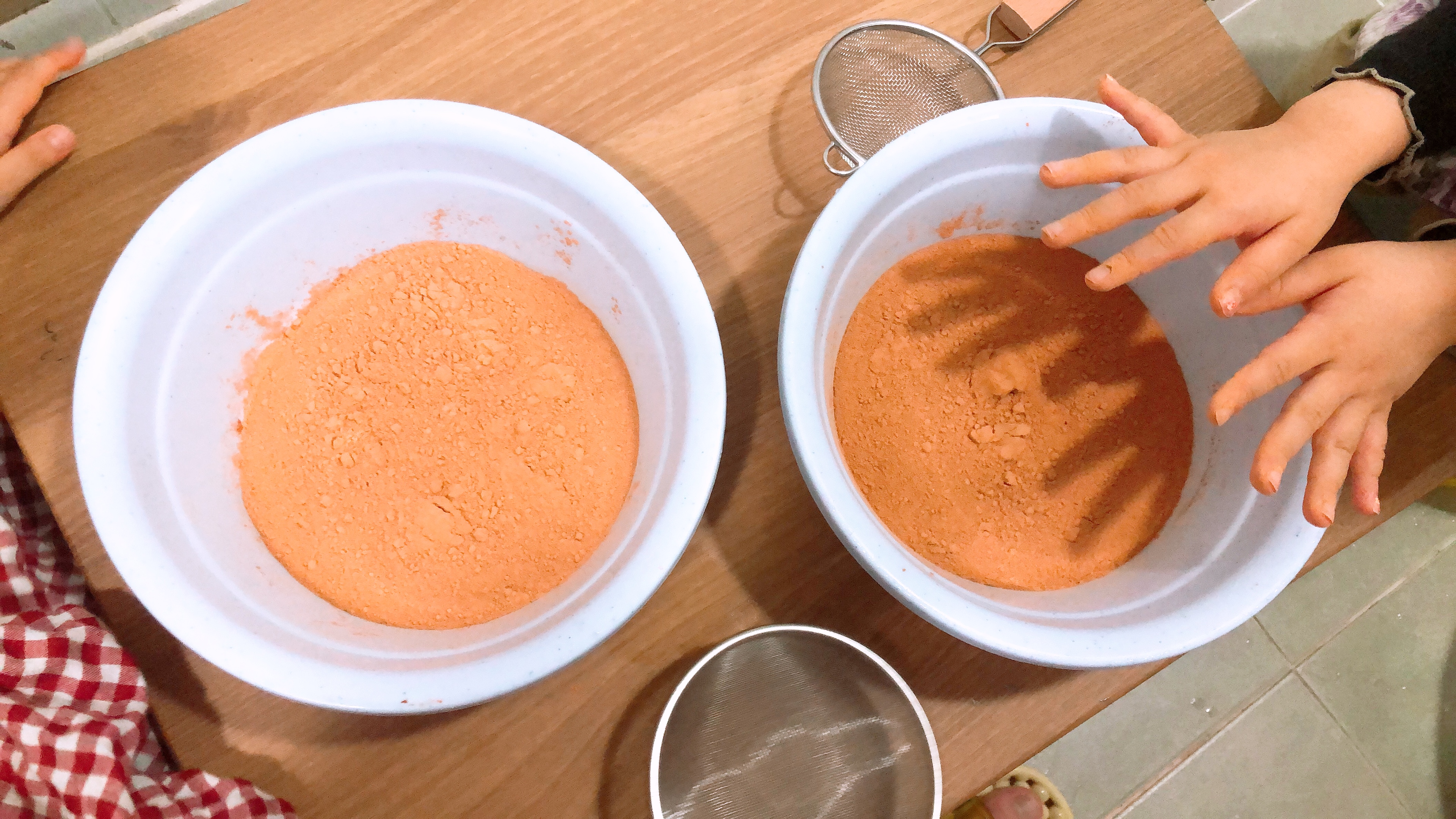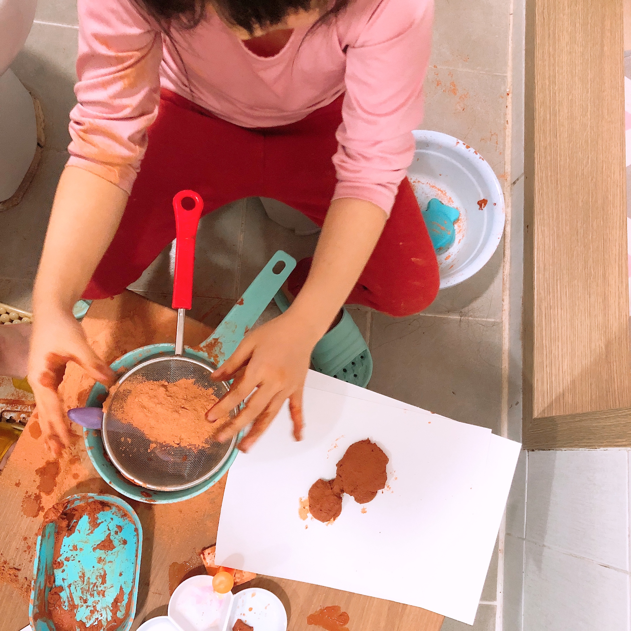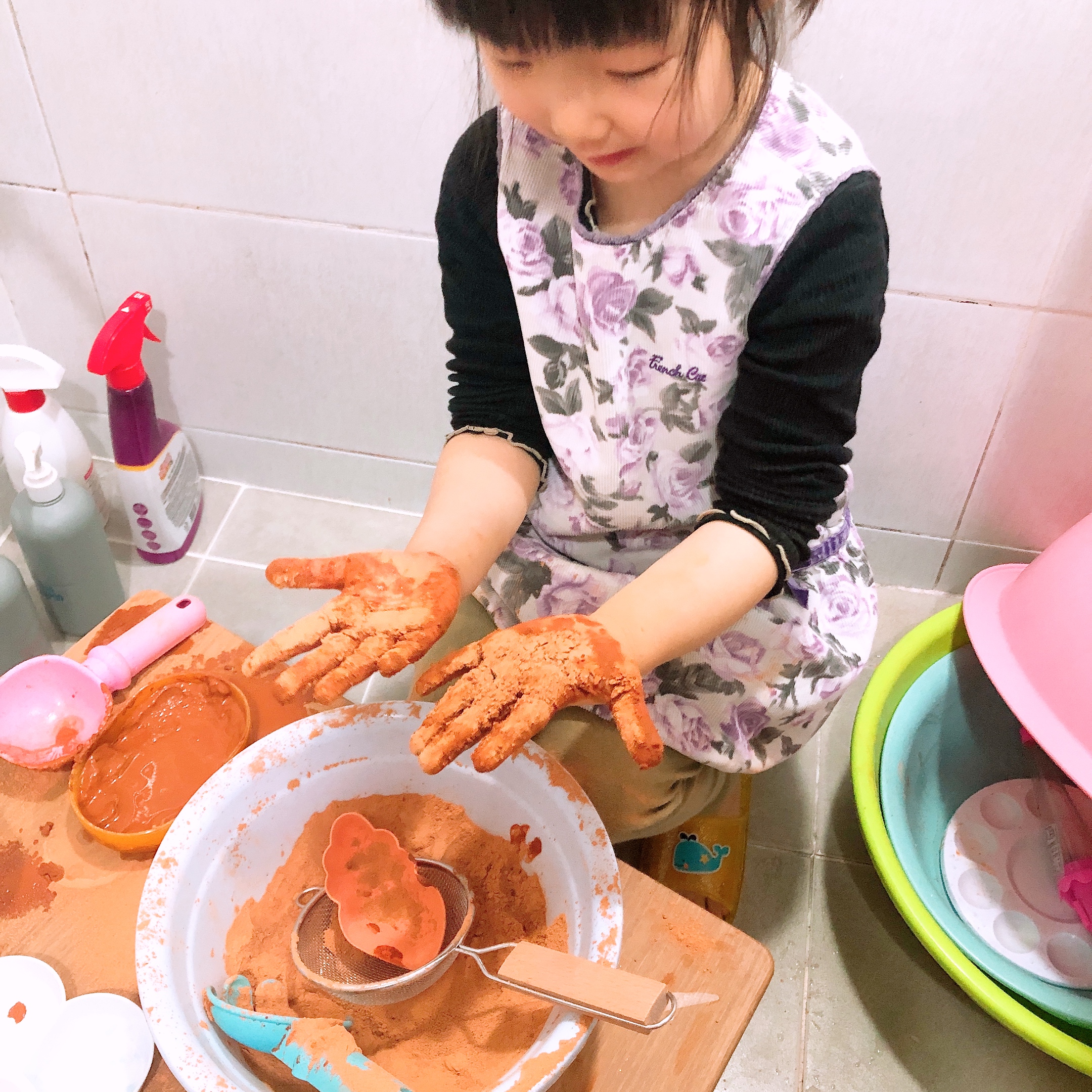 황토가루놀이는 처음 해보는 우리 아이들~ 뜰채와 모래놀이 도구를 이용하여 일단 가루를 탐색한다. 유치원 놀이터에서 뜰채로 고운 모래를 만들며 놀았다고 하는데 역시 황토가루도 뜰채로 내려 고운 가루를 만들어 촉감을 살펴본다. (가루가 손에 묻는 걸 싫어하는 아이의 경우 도구를 이용해 황토놀이를 시작하면 훨씬 수월하게 접근할 수 있다.)