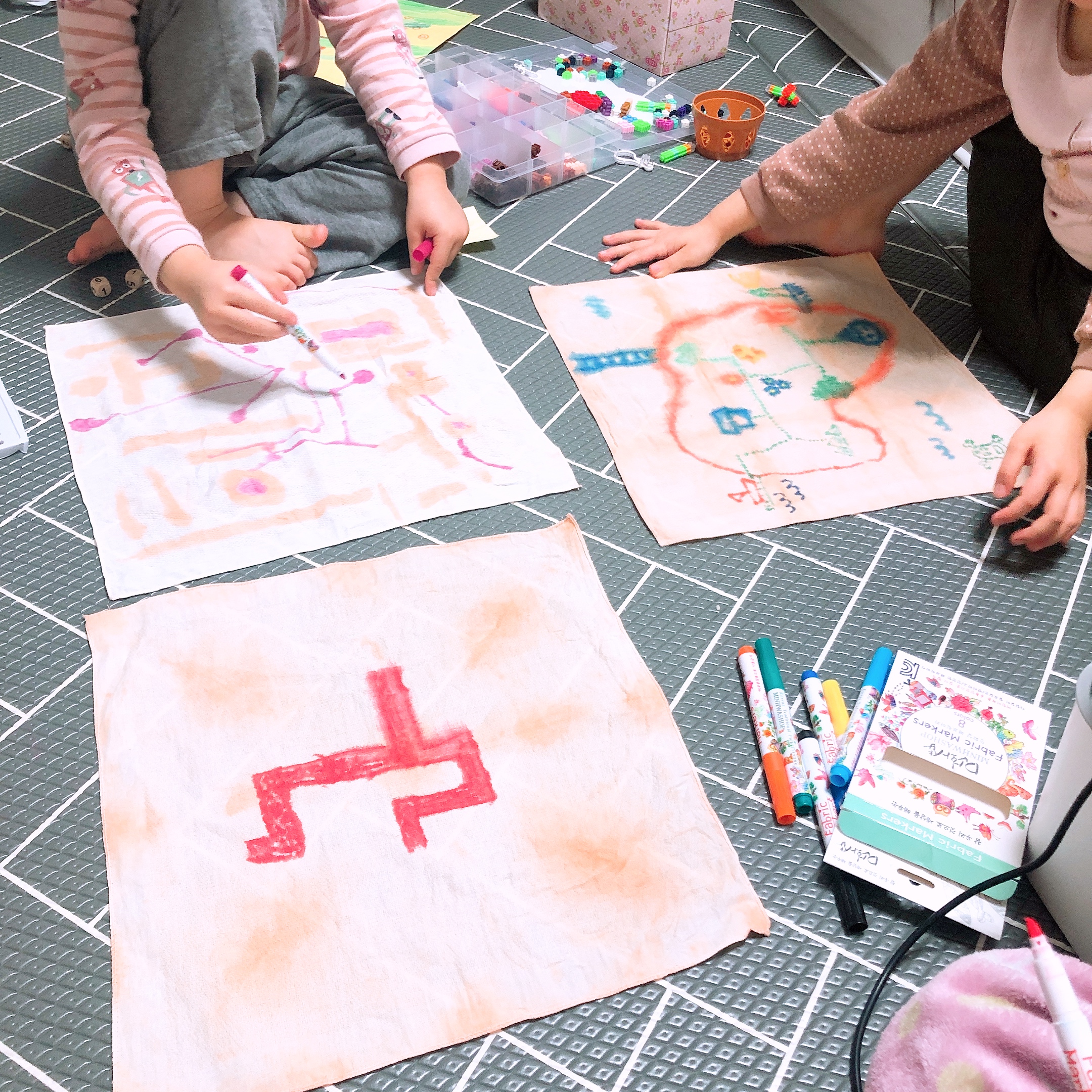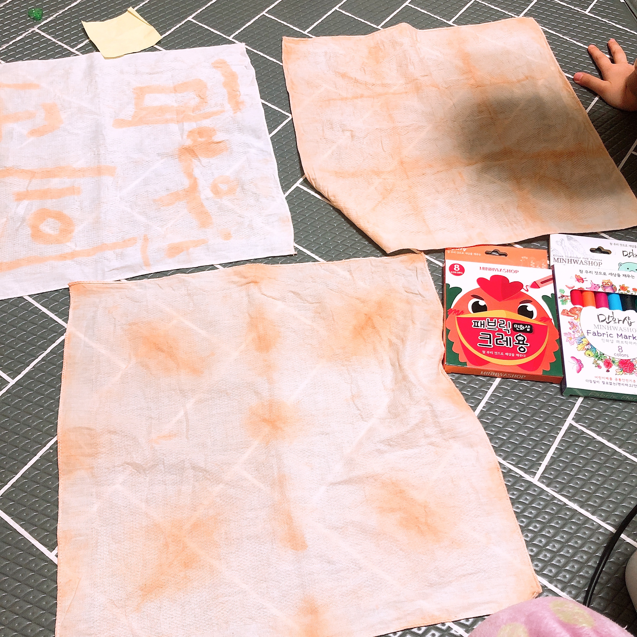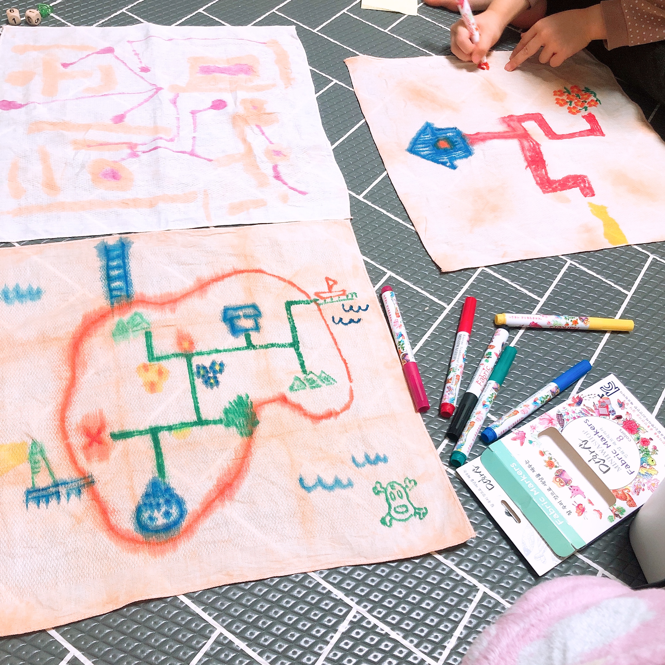 황토물에 염색한 손수건을 말렸는데 아이들 눈에는 오래된 종이처럼 보였던 모양이다. 보물지도를 만들어야 한다고 밤에 자기전에 손수건에 그림을 그렸다. 손수건에 그림을 그리는 도구로는 민화샵의 패브릭 크레용, 패브릭 마카를 사용했다. 하루종일 황토가루를 이용해서 정말 알차게 논 느낌이다.
