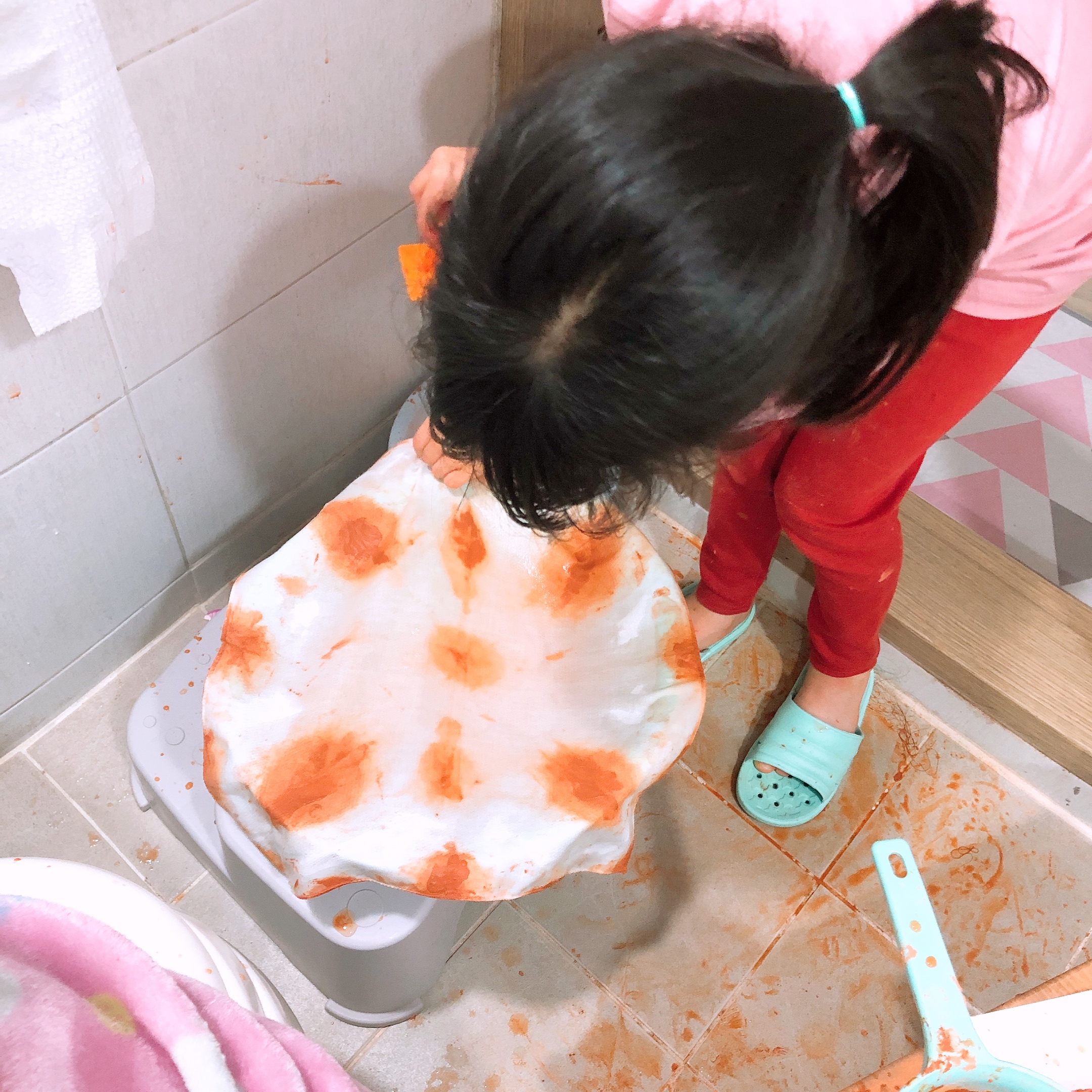 고무줄은 염색 패턴을 만들 때 사용하는 데 우리 아이들은 그냥 손수건을 접어서 황토물에 담그는 걸로 충분했다. 있으면 좋지만 없으면 굳이 구입할 필요는 없을 듯 하다. 오감매트는 나중에 바닥청소를 쉽게 하기 위한 것인데, 큰 비닐이나 돗자리 등으로 대체가 가능하고 우리집에는 매트가 없어서 그냥 화장실에서 놀이했다.