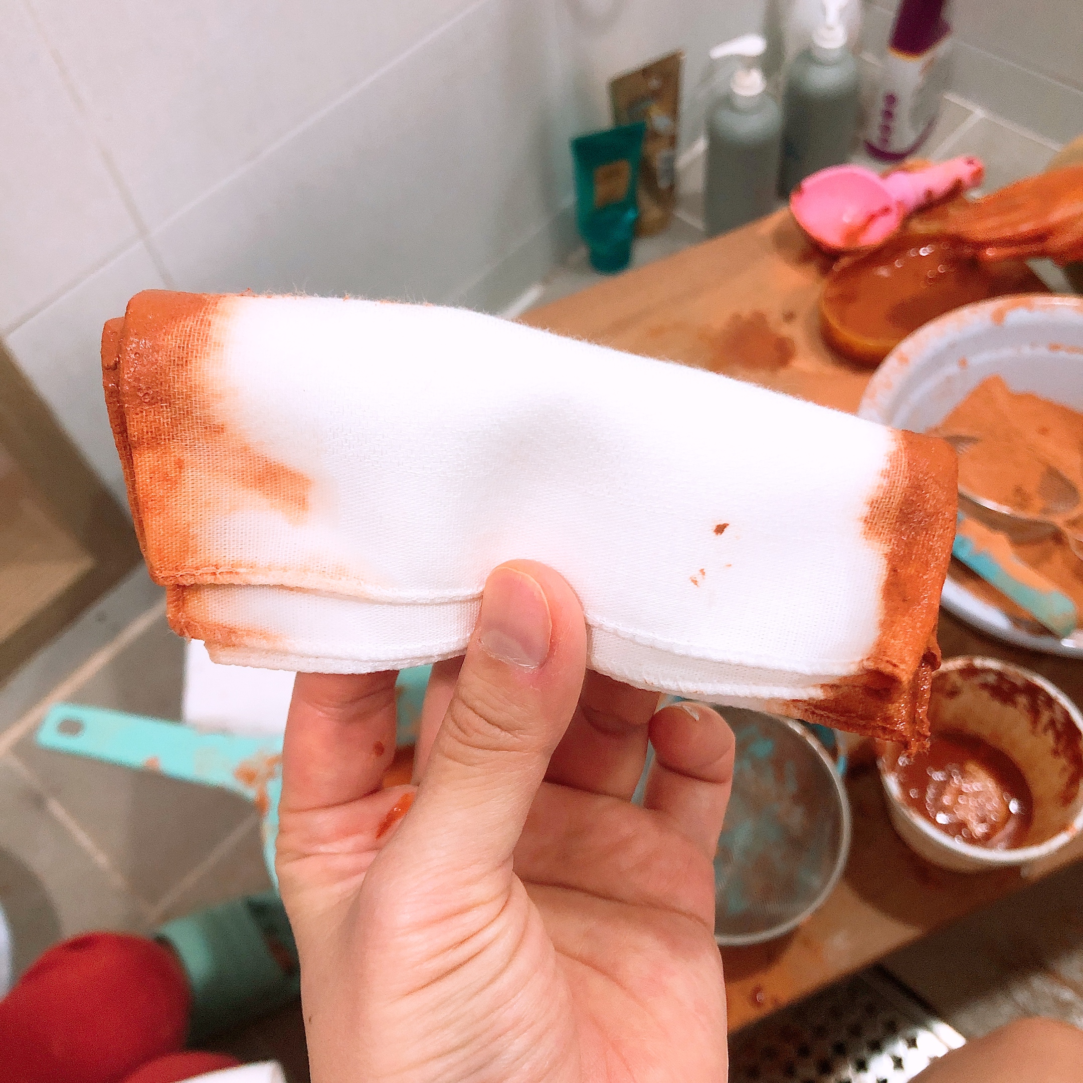 손수건을 접어서 (나는 세모, 하요미는 네모) 황토물에 가장자리를 담갔다 빼니 멋진 패턴을 가진 손수건이 되었다.