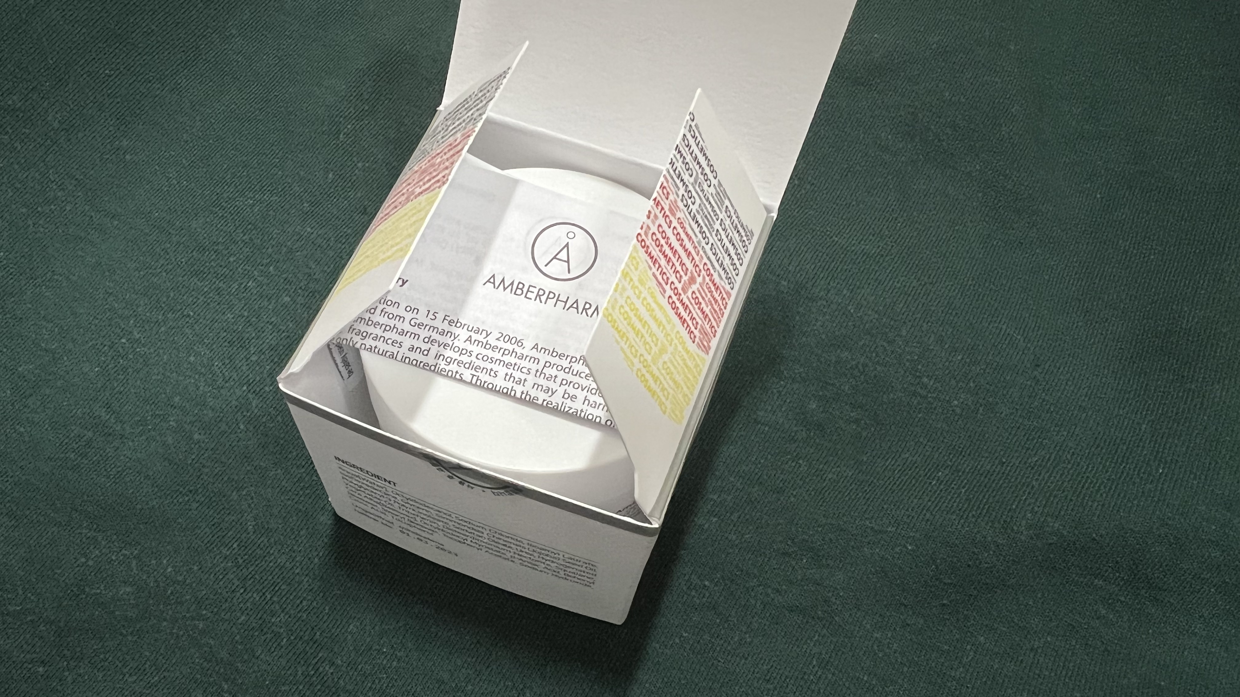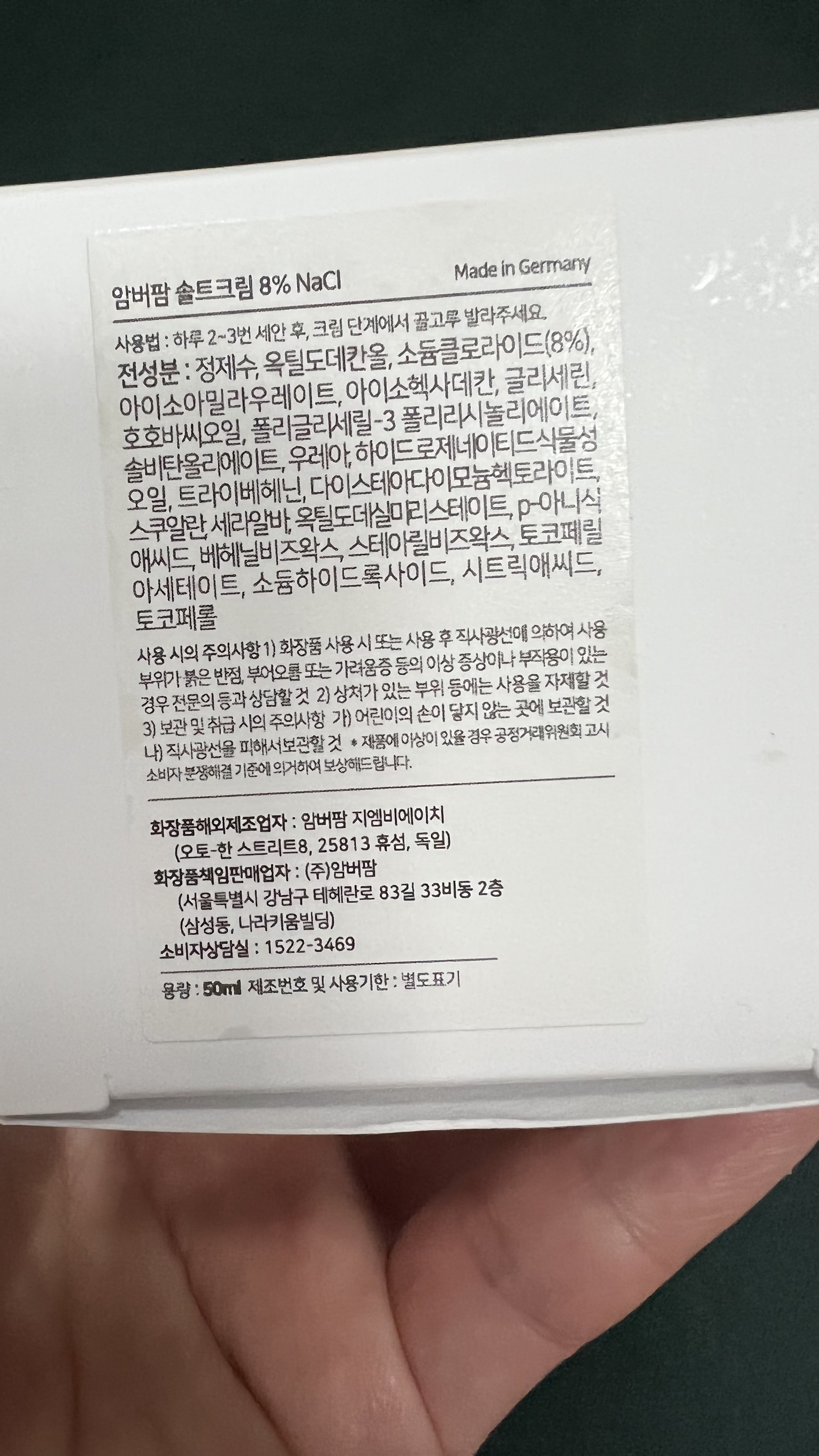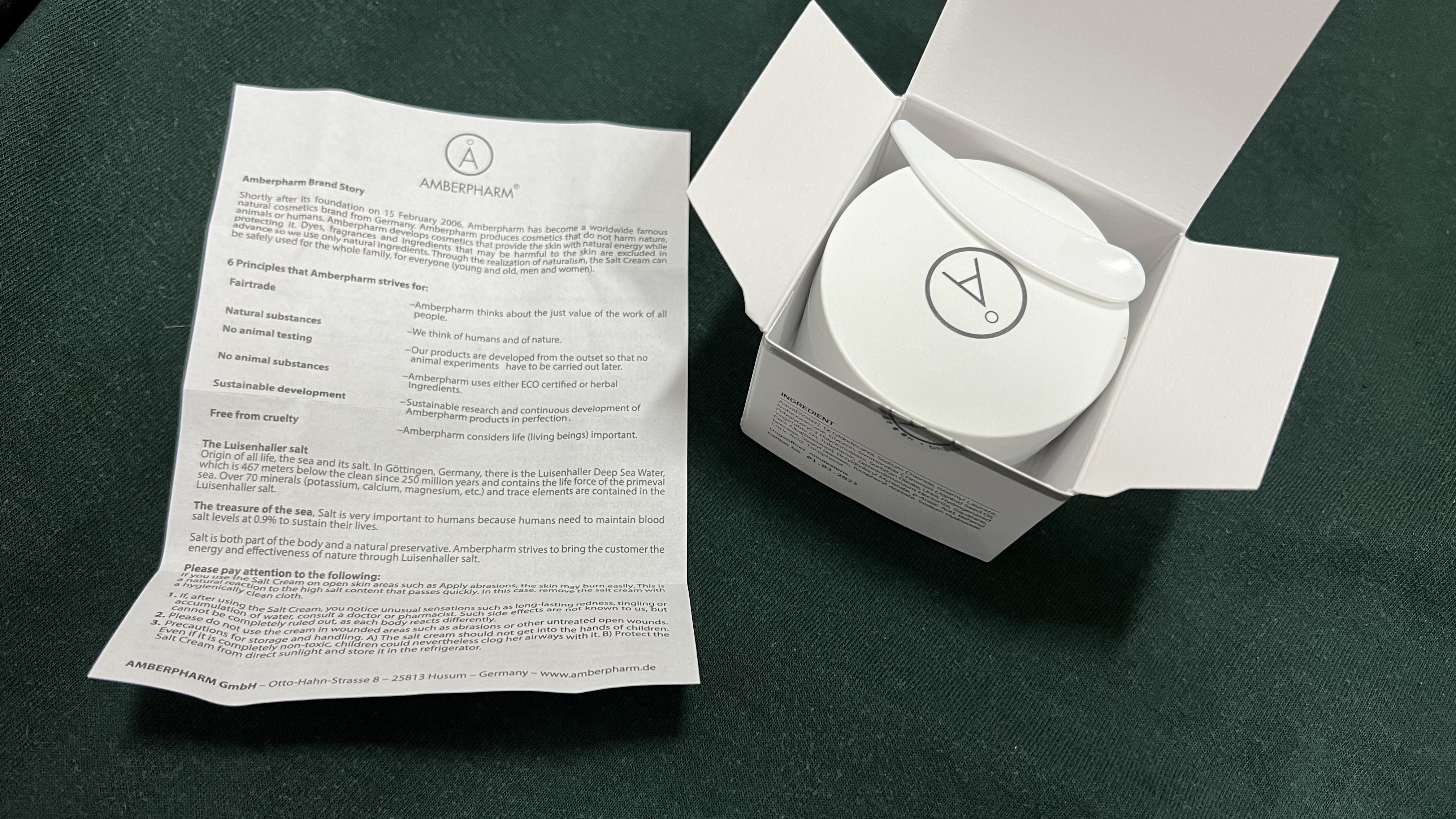 박스를 열면 설명서와 스파츌러가 함께 들어있다. 암버팜 솔트크림에는 루이젠할 솔트, 스쿠알란, 호호바씨 오일, 우레아 등의 성분이 함유되어 있다. 그 중에서도 가장 눈여겨 볼만한 성분은 루이젠할 솔트이다. 약 2억 5천만년 전 동안 오염되지 않은 원시 자연 그대로의 청정지역, 원시바다의 생명력을 품고 있는 심층 염천수의 소금을 사용하는데, 일반 바다의 염분은 6%인 반면에 루이젠할 염천수는 27%의 고농도로 피부의 유해한 환경으로부터 피부를 보호하는 바이오막 역할을 한다. 암버팜 솔트크림에는 8%의 루이젠할 솔트가 들어있어 깊은 보습감을 느낄 수 있는 것이다.
