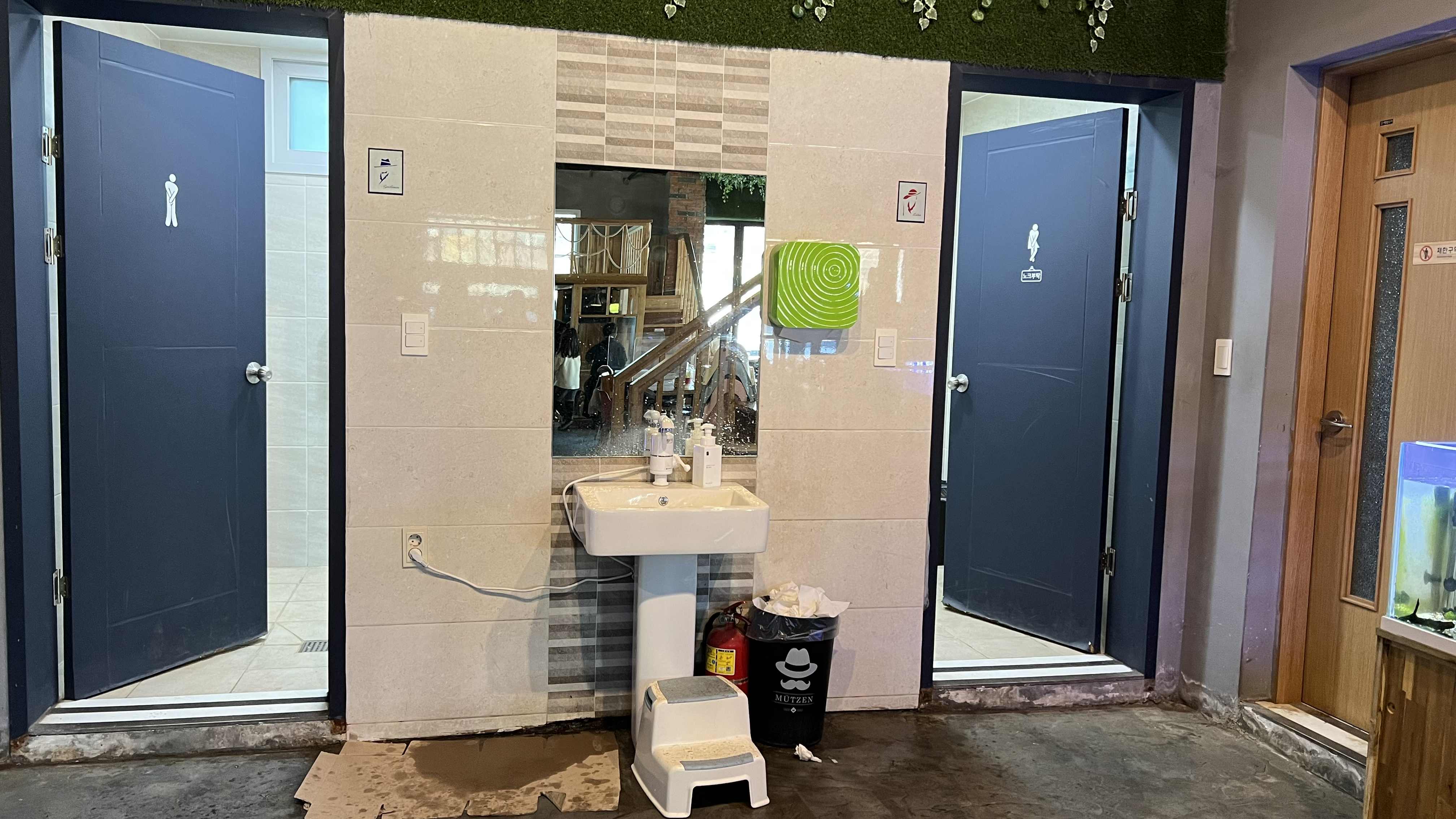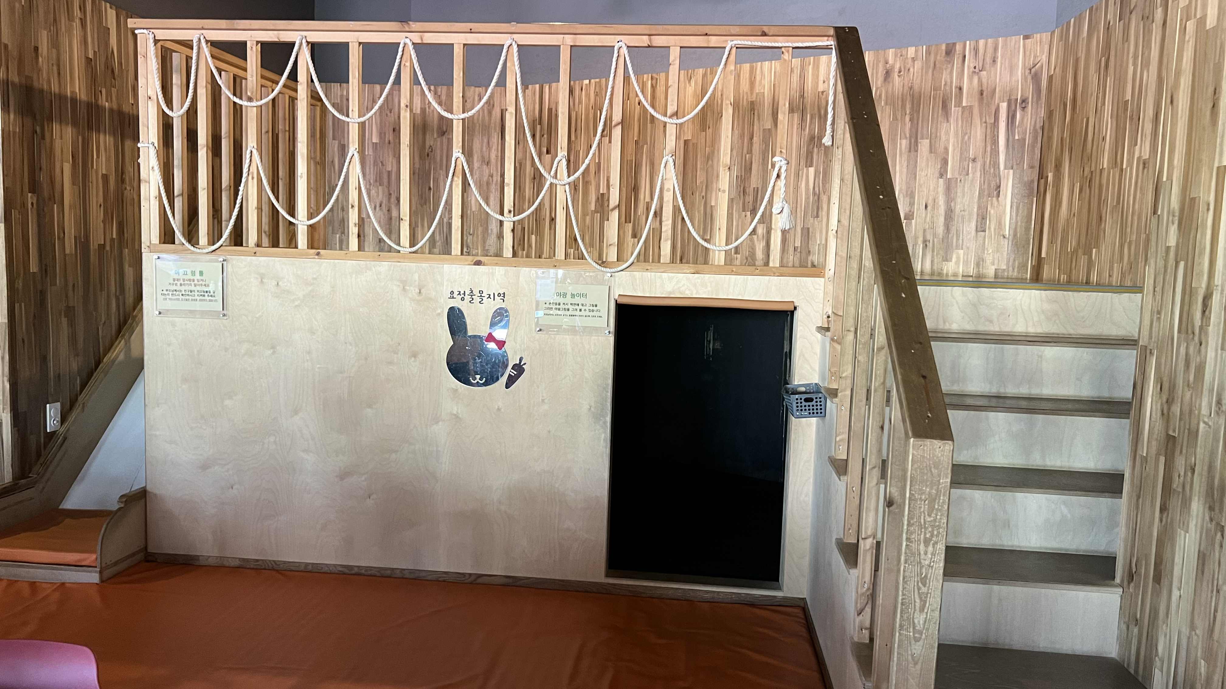 아이들이 놀 수 있는 작은 미끄럼틀과 그 아래에는 야광놀이터존이 마련되어 있다. 야광놀이터는 나도 처음보는 거였는데 손전등을 켜서 벽면에 대고 그림을 그리면 야광그림을 그려 볼 수 있는 곳이었다. 정말 신기했다. 멀리 가지 않아도 카페 안에 화장실, 손 씻을 수 있는 세면대가 있어서 편리했던 것 같다.