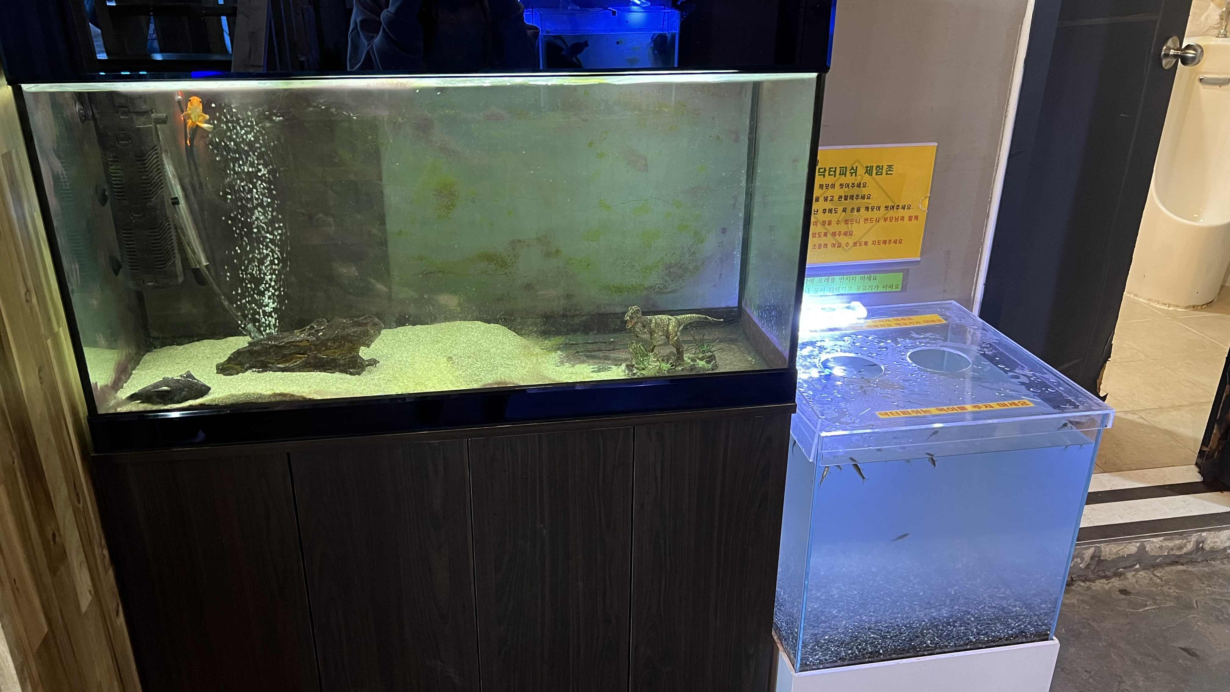 카페를 한바퀴 둘러보았다. 작은 금붕어 두마리가 살고 있는 어항? 수족관?과 그 옆에는 닥터피쉬 체험존이 있었다. 손을 넣으면 닥터피쉬들이 몰려든다고 하는데 물고기들이 내 손에는 관심을 갖지 않았다. (왜지-_-) 반대쪽 수족관에선 거북이, 작은 새우 등이 살고 있었다.