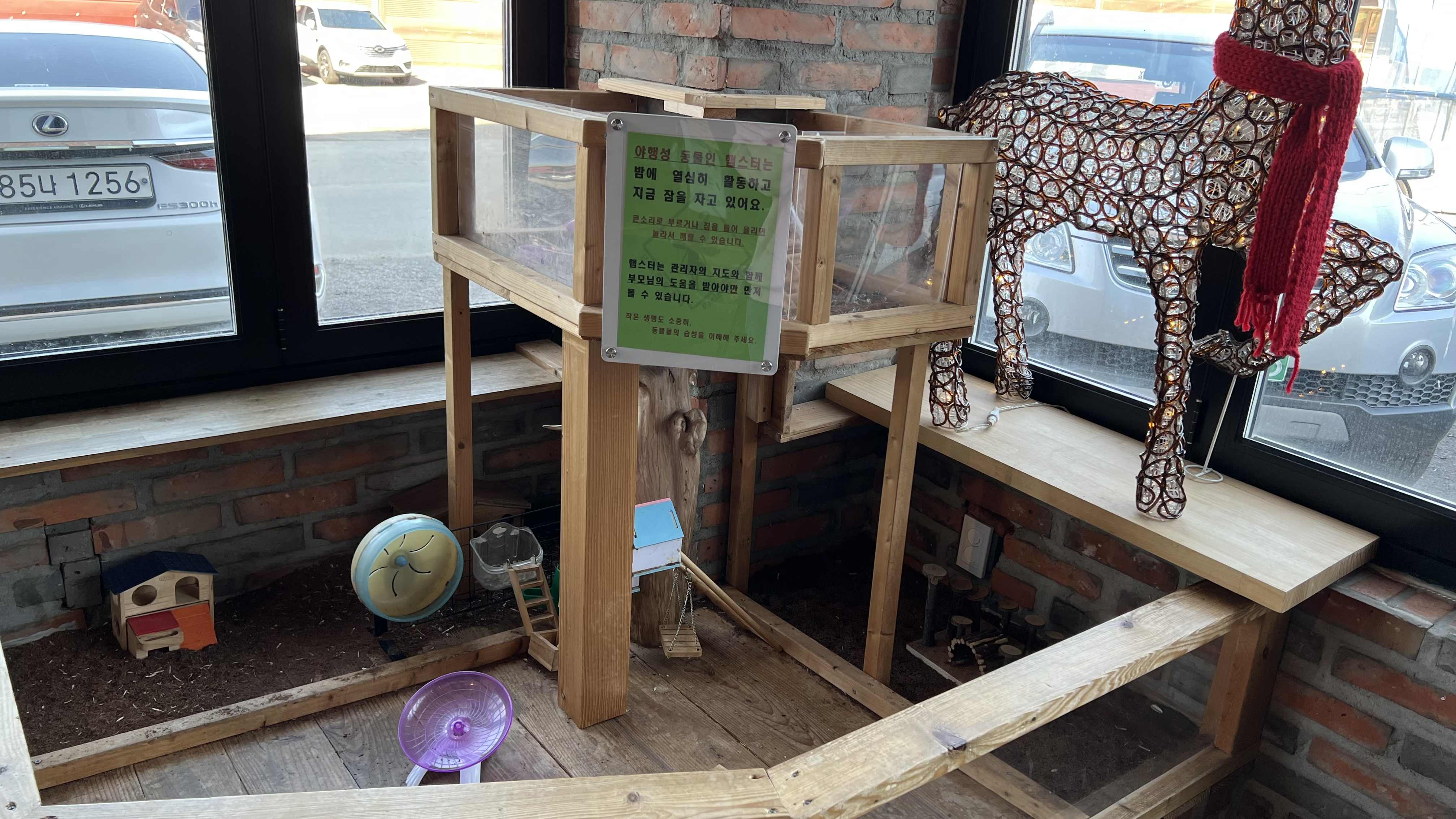 햄스터도 있었는데 자는 중이어서 만나지는 못했다. 햄스터는 야행성 동물이라서 관리자의 지도가 있어야 만져볼 수 있다고 한다. 가볍게 카페 구경을 마치고 이제 본격적으로 토끼에게 먹이주기 시작!