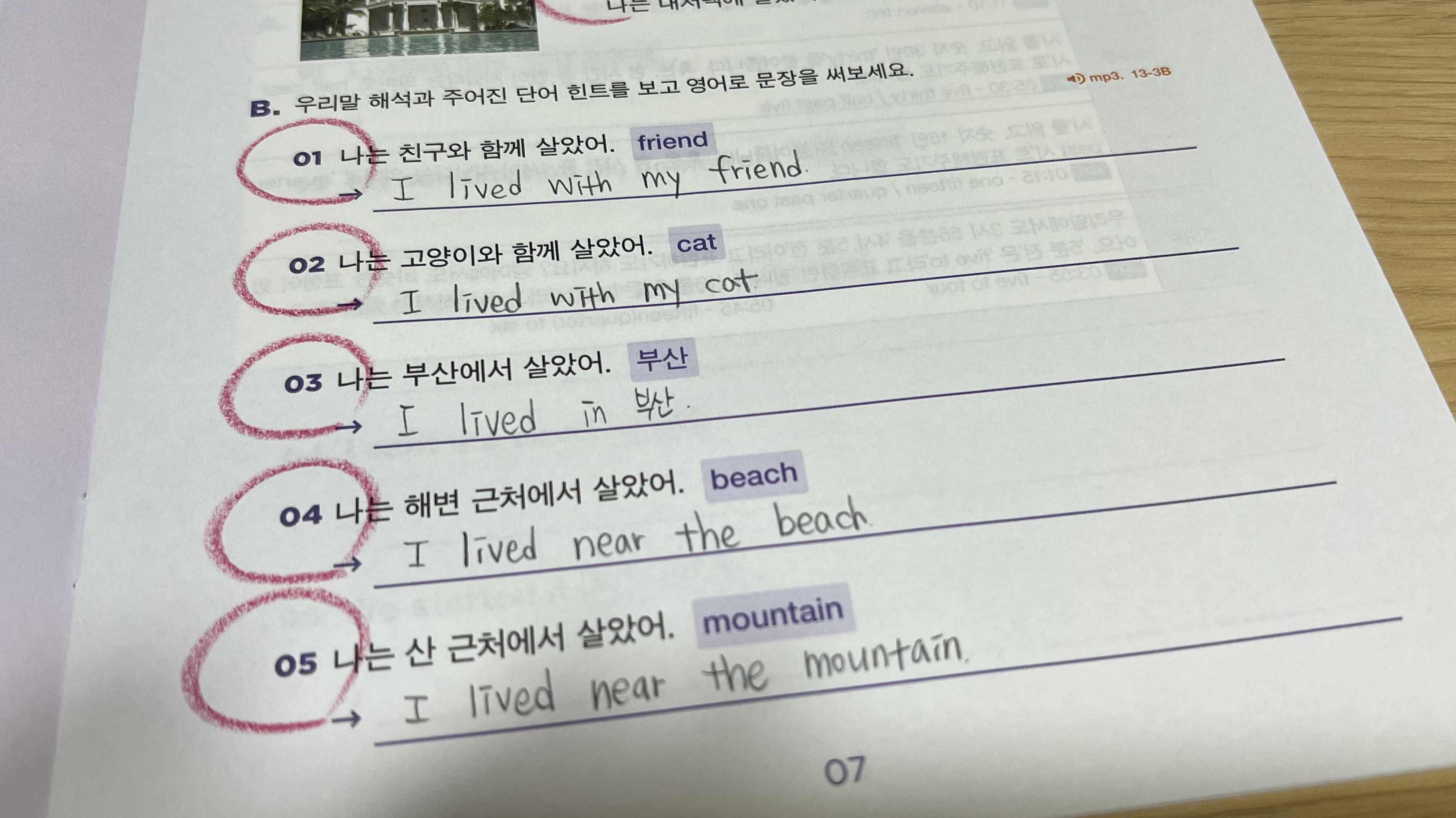 기본 문장은 'I lived with ~'로 누구와 함께 살았는지 알려주는 것이지만 기본 문장을 응용하여 어디에서 살았는지, 어디 근처에 살았는지, 또 무엇을 마시고, 무엇을 계획했는지 등 다양한 과거시제 문장을 말해볼 수 있다.