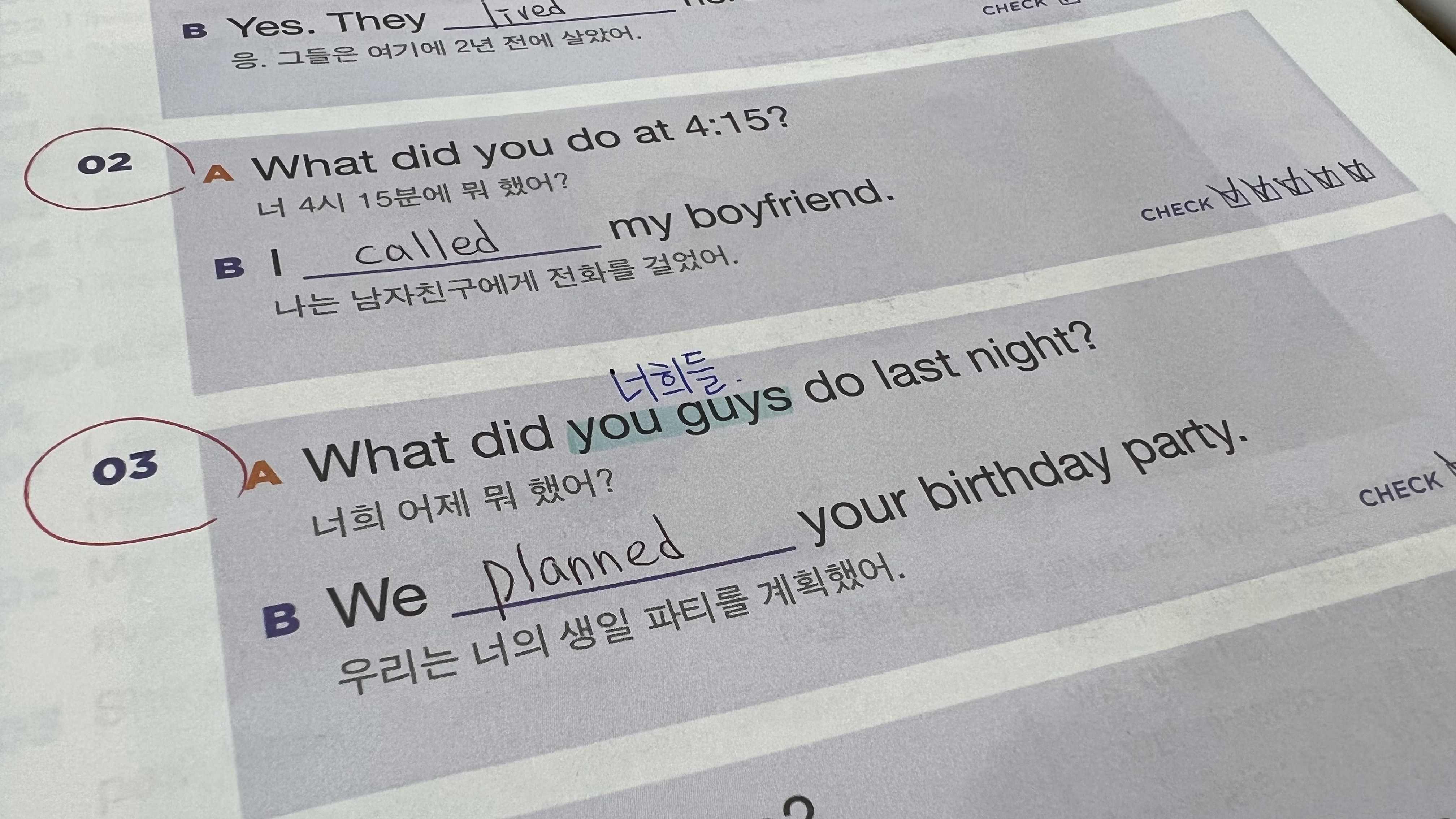물론 커리큘럼이 모두 달라서 완벽하다고 할 순 없지만, 그래도 가벼운 영어 학습지에서 다루는 내용이 일상 회화에 두루 쓰이는 문장이 많은 것 같다. 예전에는 과거, 현재, 미래를 말하는 게 너무 헷갈렸는데 조금씩 머리속에서 정리가 되어가는 기분이라 뿌듯하다.