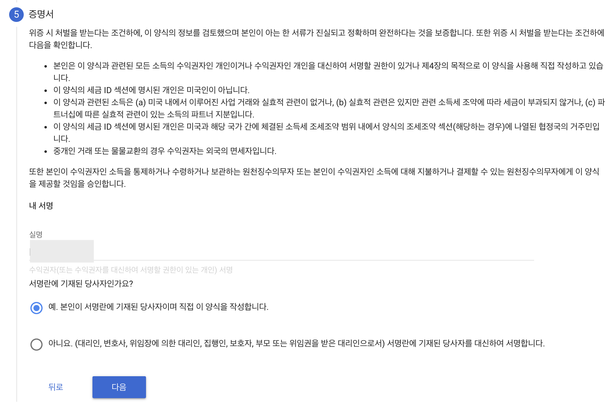 세번째 작성 항목은 조세조약에 따라 인하된 원천징수세율을 신청하겠냐는 질문이다. 대한민국은 미국과의 조약을 신청한 국가이다. 하지만 사업자가 아닌 개인은 '아니요'를 선택해야 한다.