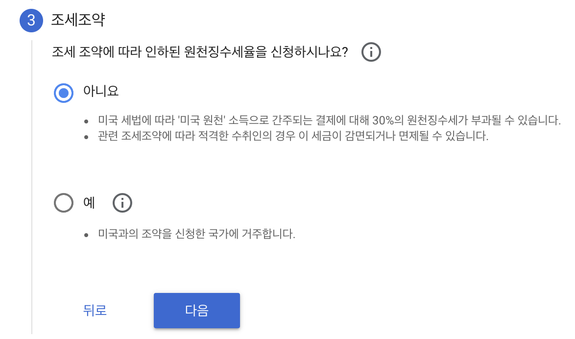 미국 시민 또는 거주자인가요? 역시 해당하는 곳에 체크하면 된다. 나는 한국인이므로 '아니요'에 체크했다.