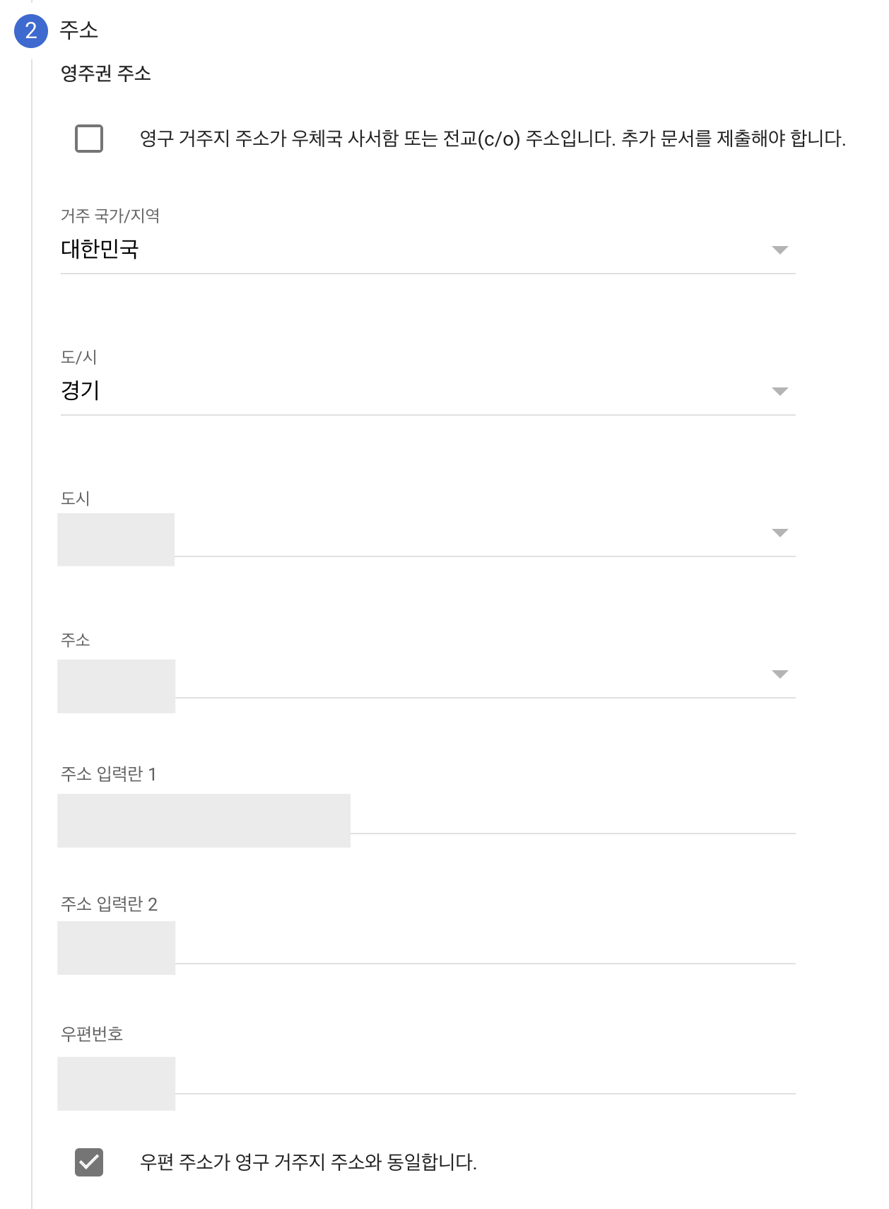 거주 국가/지역부터 나머지 상세주소까지 순서대로 작성하면 된다. 영문 주소 입력이 어렵다면 검색 포털에 '영문 주소 변환기'를 검색하여 도움을 받을 수 있다. 우편 주소가 영구 거주지 주소와 동일하다면 아래 체크박스에도 체크해 준다.