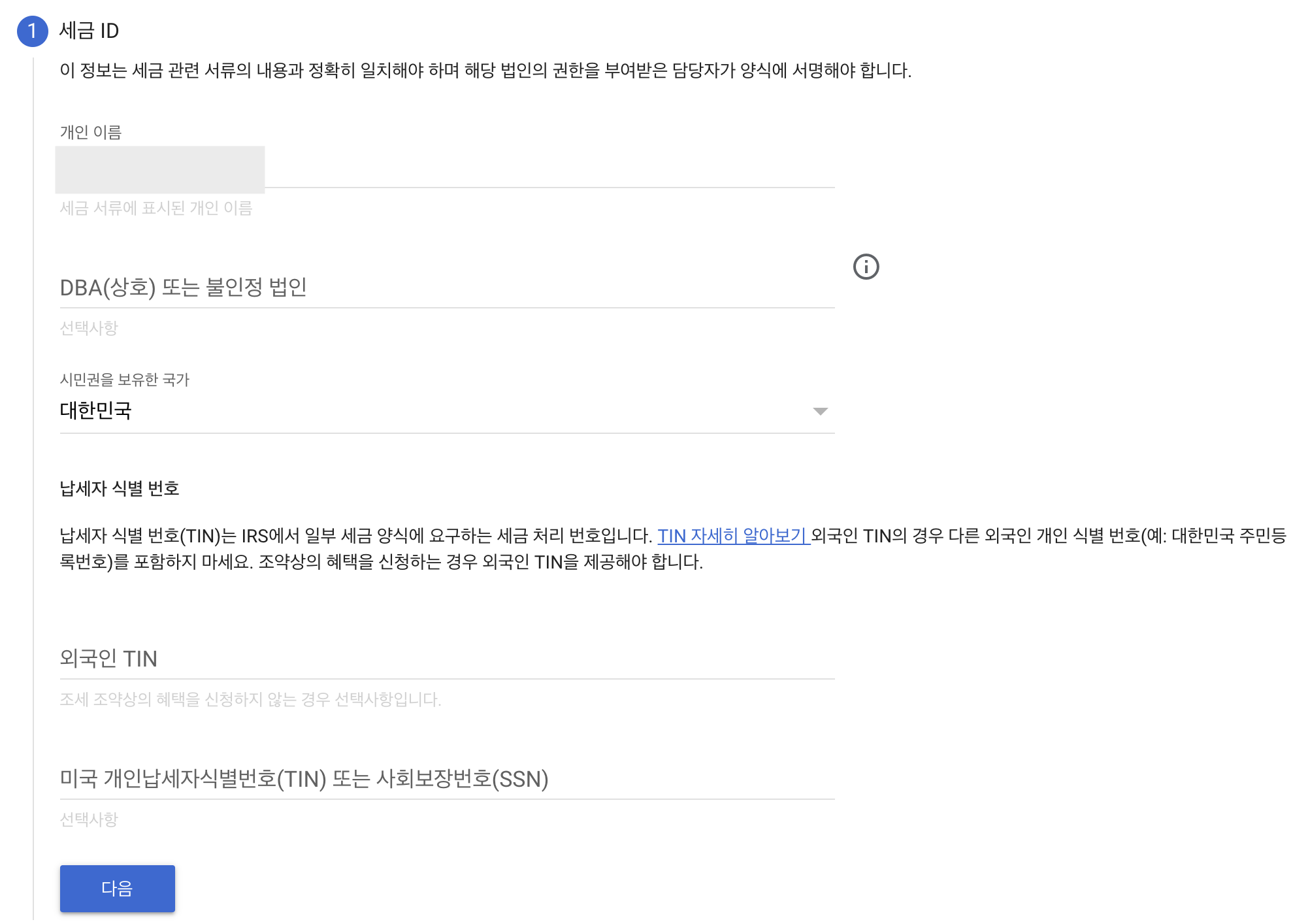 - 외국인 TIN : 사업자번호가 있는 경우 10자리를 입력하면 된다. 나는 개인이라서 이 부분도 생략했다. ★주민등록번호 아님 주의★
