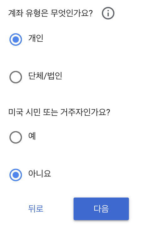 미국 시민 또는 거주자인가요? 역시 해당하는 곳에 체크하면 된다. 나는 한국인이므로 '아니요'에 체크했다.