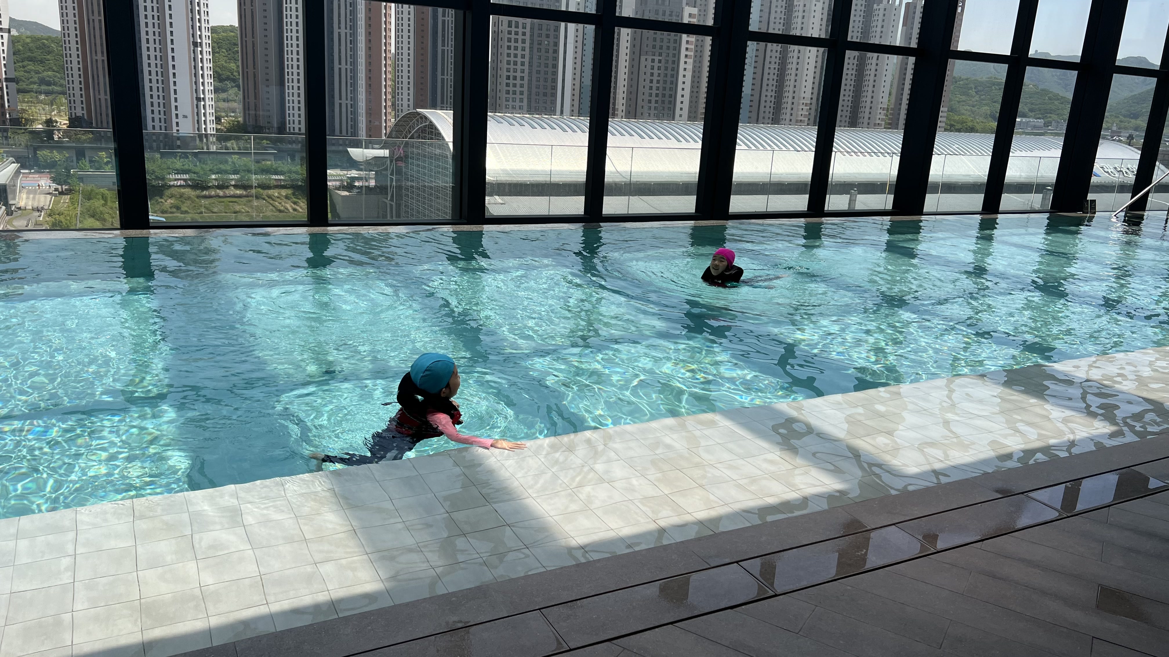 호캉스를 하며 아이들이 가장 기대했던 것이 바로 인피니티풀 수영장이었다. 아마도 물놀이를 싫어하는 아이들은 없을 테니까... 입실하는 순간부터 수영장에 언제 가냐며 노래를 불렀다.