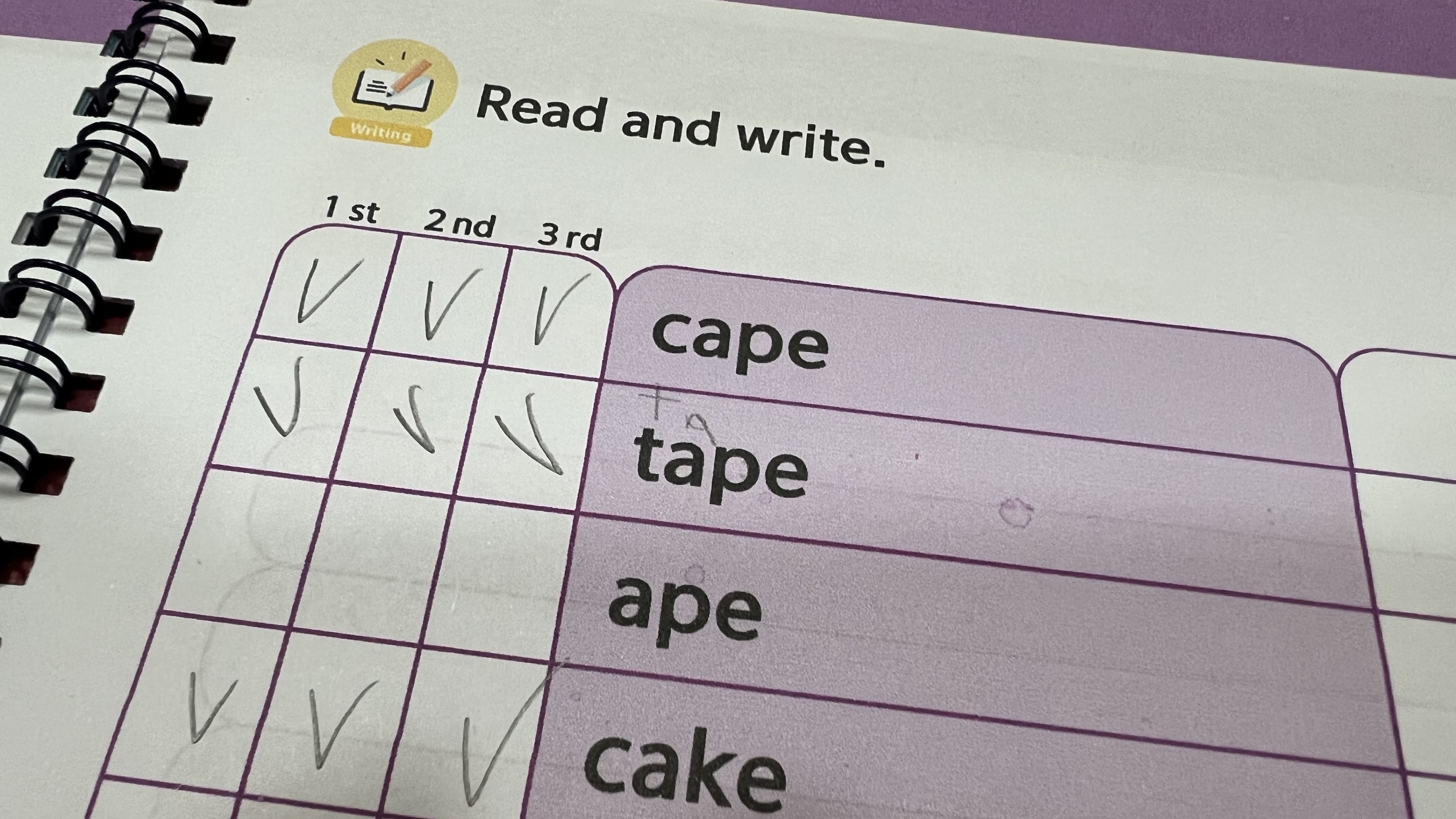 며칠 전 숙제를 하고 있는데 단어를 읽고 쓰는 페이지가 있었다. 아직 잘 모르는 단어들이 많아서 발음하는 것을 옆에서 지켜보고 도와주어야 한다. tape라는 단어를 보며 한참을 멈춰 있길래 '테이프'라고 말해 주었더니 이건 '테이프'가 아니라고 한다. 음? 그럼 진짜 '테이프'는 어떤 것이지?