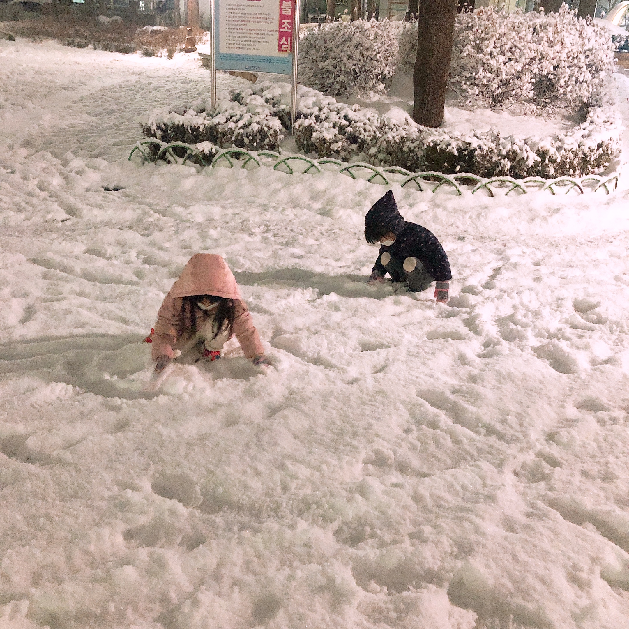 처음에는 주먹만했던 작은 눈덩이가 커지니 신이 난 아이들은 정말 열정적으로 눈밭을 뛰어다녔다. 공원에 우리밖에 없을거라 생각했는데 다들 아이들과 눈 구경을 나와 즐거운 시간을 보내고 있었다. 코로나19 사회적 거리두기로 누군가를 만날 기회도 웃을 일들도 별로 없는 요즘, 공원에 삼삼오오 나온 사람들이 모두 같은 기분일 거라 생각하니 오랜만에 마음이 따뜻해졌다.