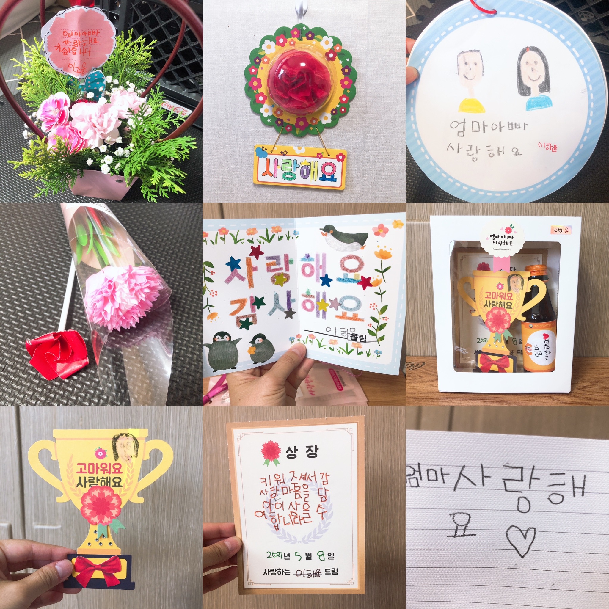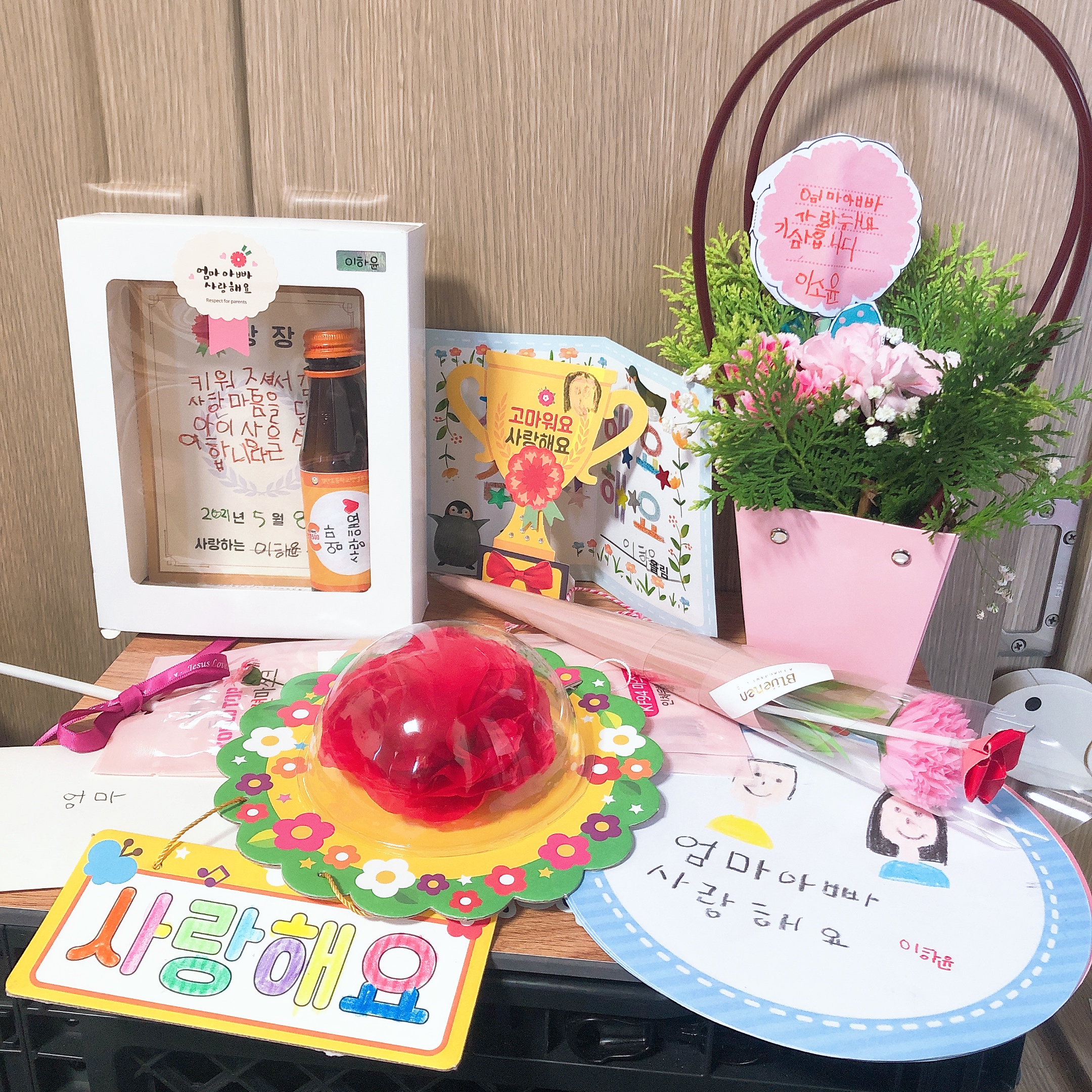 우리 일곱살 첫째의 생일은 5월 8일, 어버이날이다. 예정일을 하루, 이틀 넘기고 그 날만은 아니길 바랬는데...ㅋㅋㅋ 딱 자정 넘어가면서부터 진통을 시작해서 점심시간이 조금 지났을 무렵 태어났다. 작년까지만 해도 흐지부지 넘겼었는데 올해에는 어버이날의 의미를 이해하고 있는 것 같길래 "엄마가 케잌이랑 선물을 준비할 테니까, 너도 엄마한테 무언가를 주어야 해." 라고 말했다. 그랬는데 세상에나~ 무슨 팬미팅 하는 줄~ 완전 열일하는 유치원🤭이 정도면 거의 이틀동안 어버이날 선물만 만들었을 거 같다.