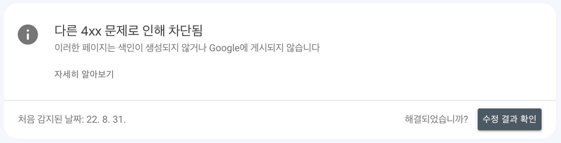역시 잘 모르겠다. 구글을 더 찾아보았는데, 다른 블로거분이 작성한 포스팅에서 이유를 알 수 있었다. 제출된 URL이 다른 4xx 문제로 인해 차단된 경우, 해당 사이트에 들어가보고 만약 사이트에 접속이 원활하게 되고 있다면, 본인이 무언가를 잘못 설정한 것이 아니라고 한다. 그저 구글이 일시적으로 인식을 못하는 것이다. 그러니 아무것도 하지 않아도 되며, 그냥 시간이 가길 기다리면 자동적으로 해결될 것이다.