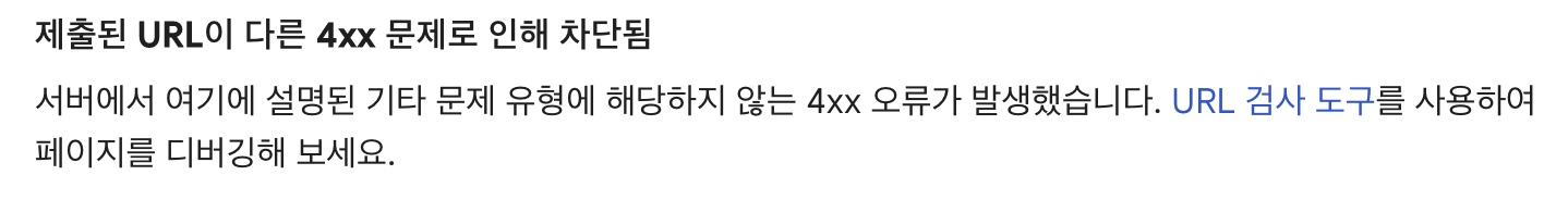역시 잘 모르겠다. 구글을 더 찾아보았는데, 다른 블로거분이 작성한 포스팅에서 이유를 알 수 있었다. 제출된 URL이 다른 4xx 문제로 인해 차단된 경우, 해당 사이트에 들어가보고 만약 사이트에 접속이 원활하게 되고 있다면, 본인이 무언가를 잘못 설정한 것이 아니라고 한다. 그저 구글이 일시적으로 인식을 못하는 것이다. 그러니 아무것도 하지 않아도 되며, 그냥 시간이 가길 기다리면 자동적으로 해결될 것이다.