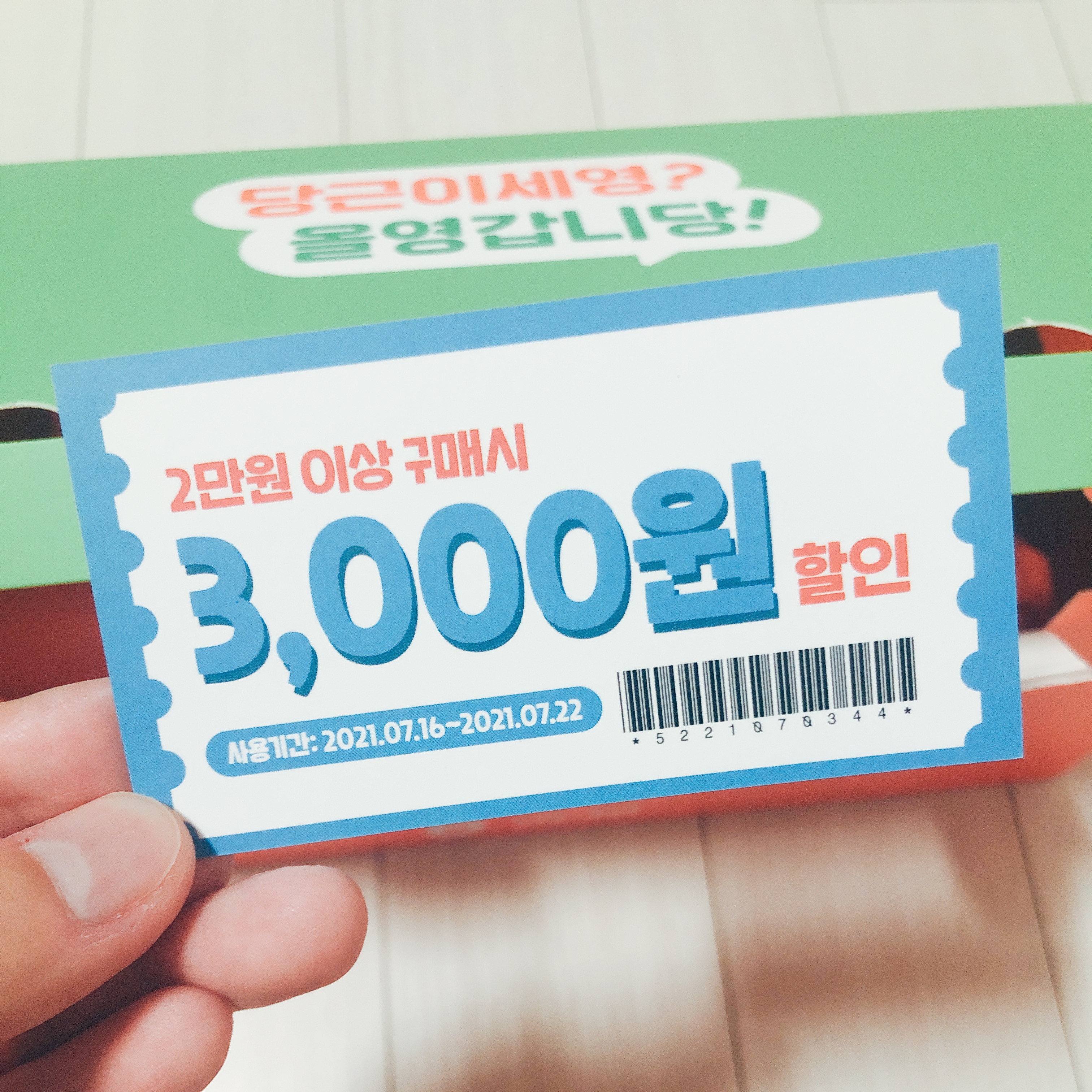 처음에 박스를 받아보고, 박스 윗면에 적혀있는 “당근이세영 올영갑니당” 멘트 센스에 감탄했다. 올리브영과 당근마켓의 브랜드 아이덴티티를 나타내는 색상이 두개 모두 절묘하게 사용되었다는 생각이 들었다. 올리브영에서 사용할 수 있는 3,000원 쿠폰도 함께 받을 수 있어 더 좋았다. 선스프레이를 살 계획이 있는데 조만간 한번 더 방문해야겠다.