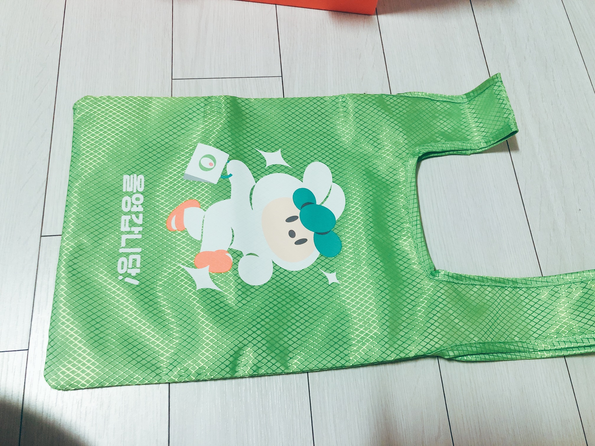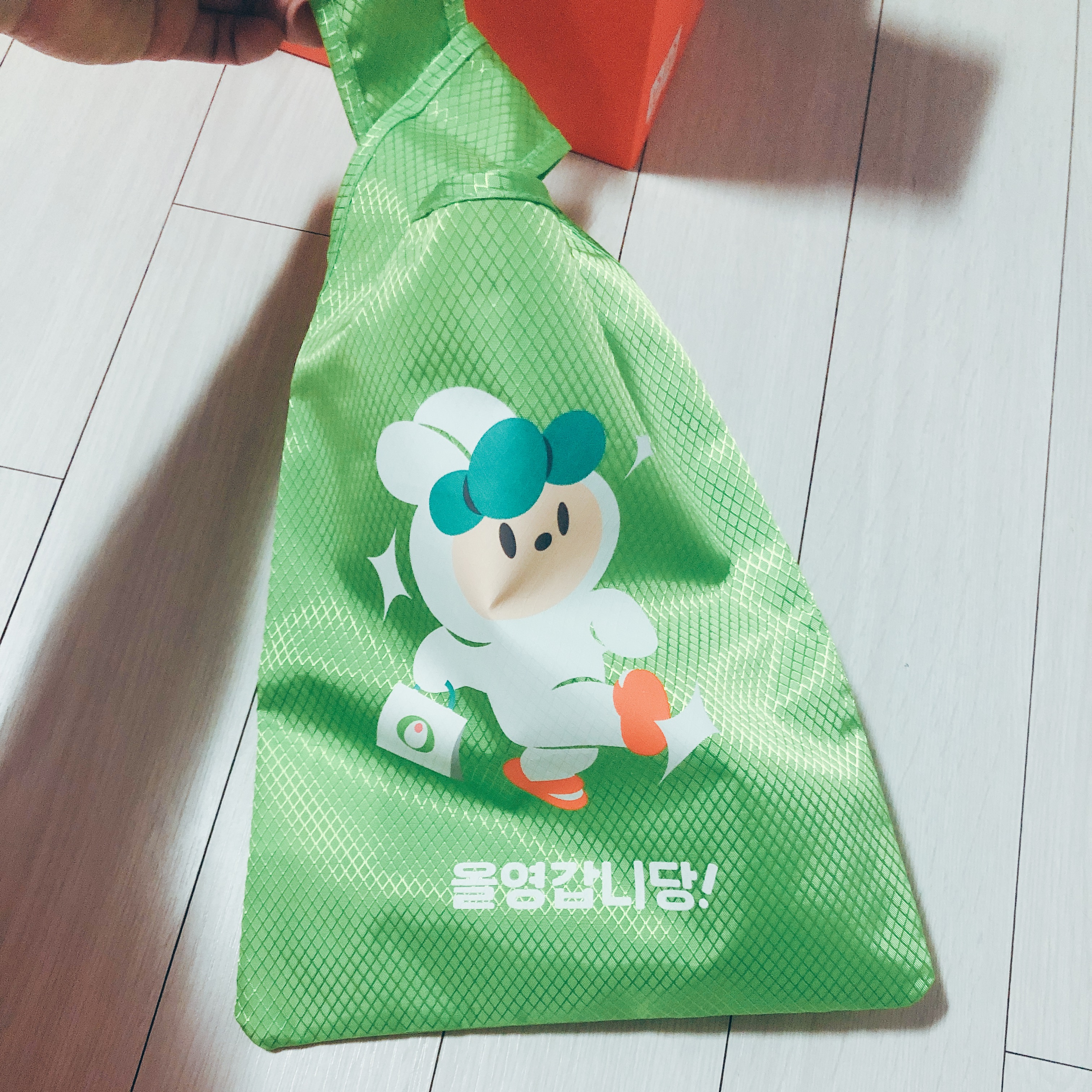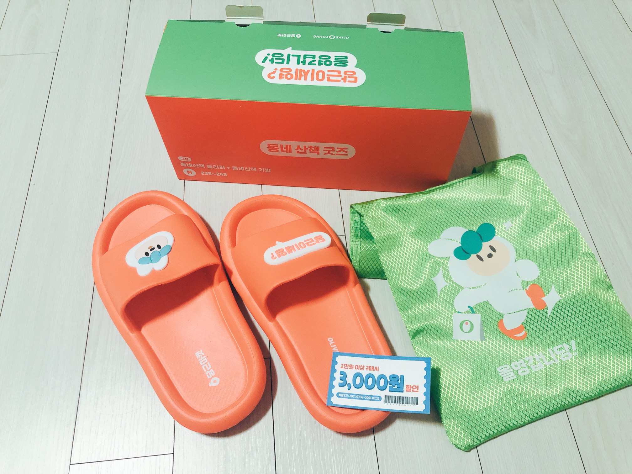 동네 산책 굿즈 박스를 열면, 쨍한 주황색 슬리퍼와 가방이 가지런히 접혀서 들어있다. 개인적으로 슬리퍼보다는 가방을 더 기대하고 있었기 때문에, 가방부터 꺼내서 살펴 보았다.