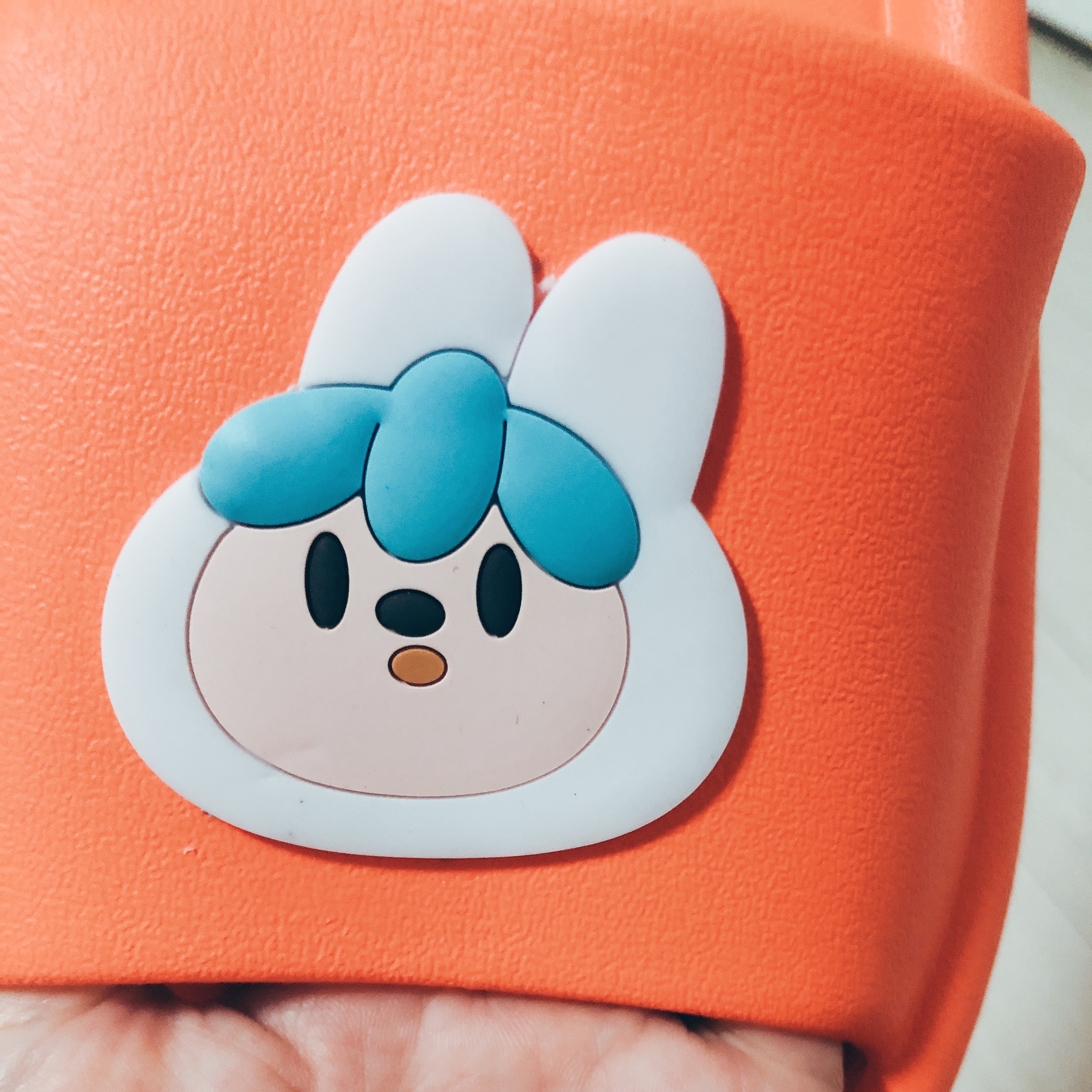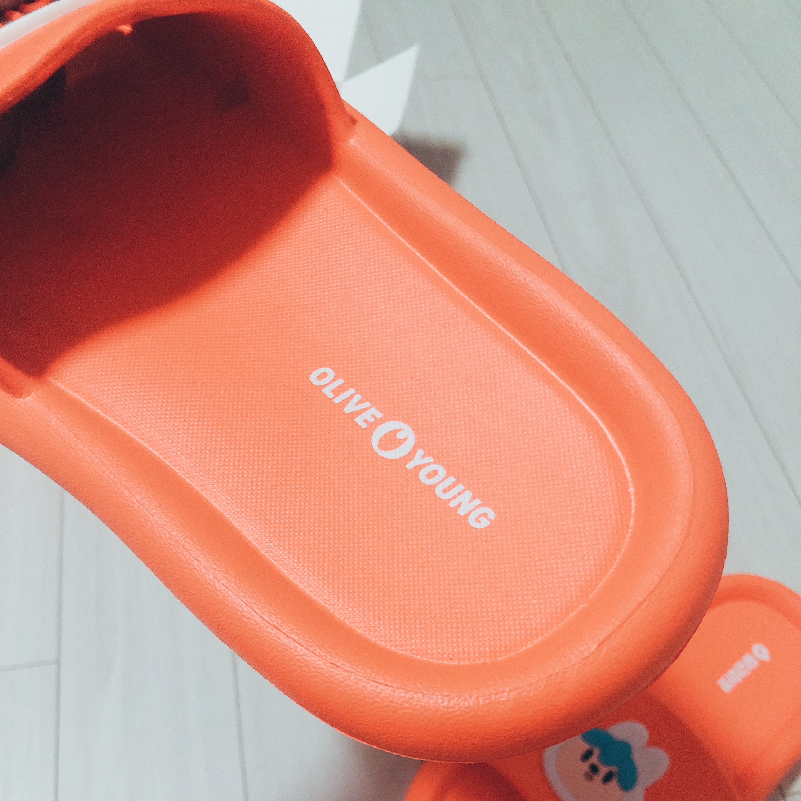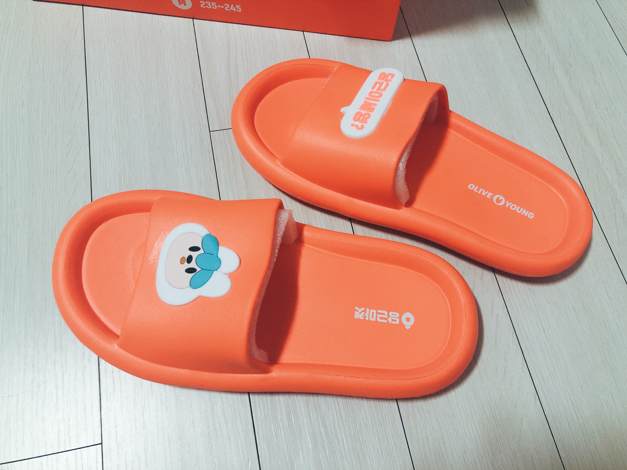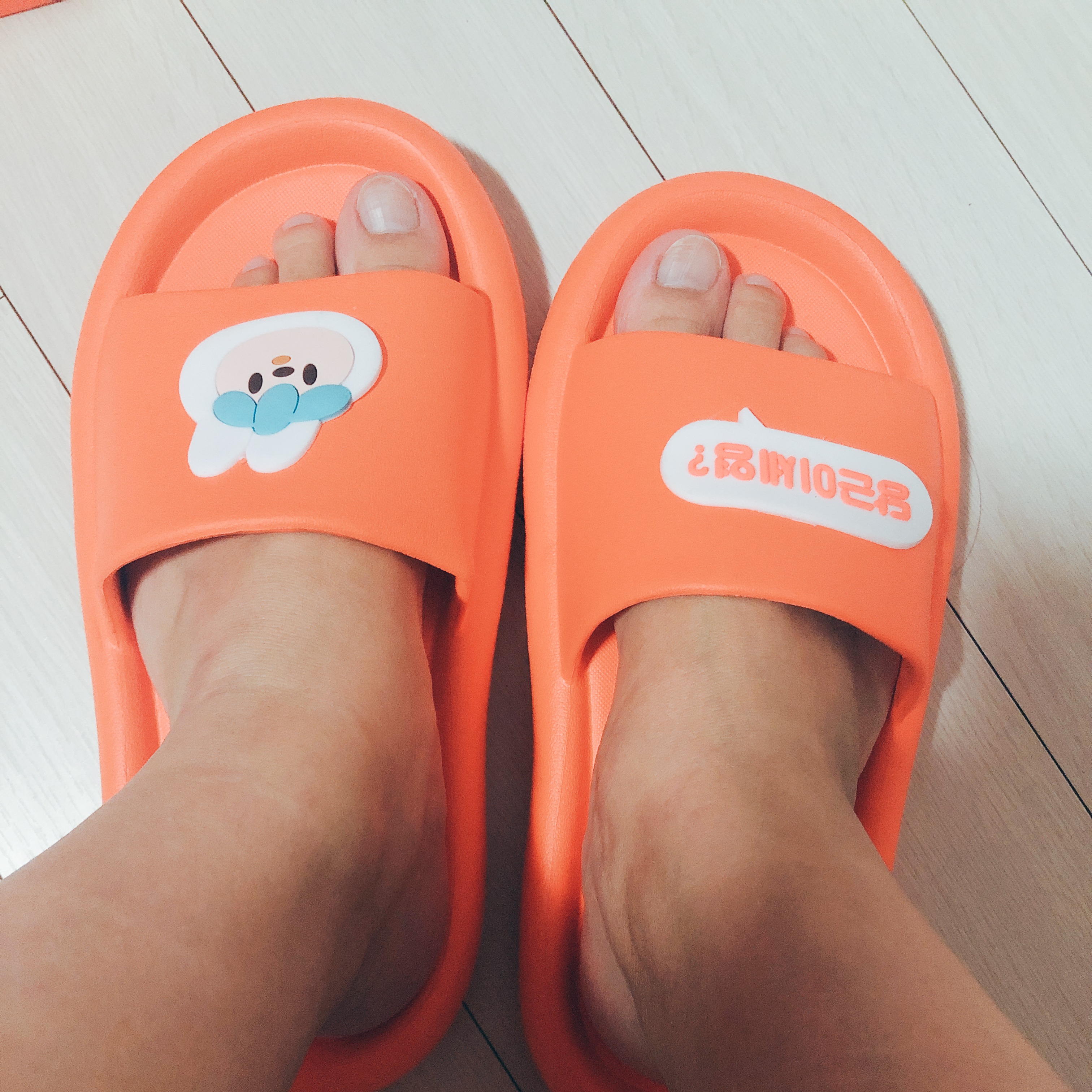 왼쪽 슬리퍼에는 당근이 캐릭터가 붙어있고 오른쪽 슬리퍼에는 '당근이세영?'이라고 적혀있는 말풍선이 붙어 있다. 견고하게 붙어있지는 않아서 테두리를 좀 더 튼튼하게 붙여주어야 할 것 같다.