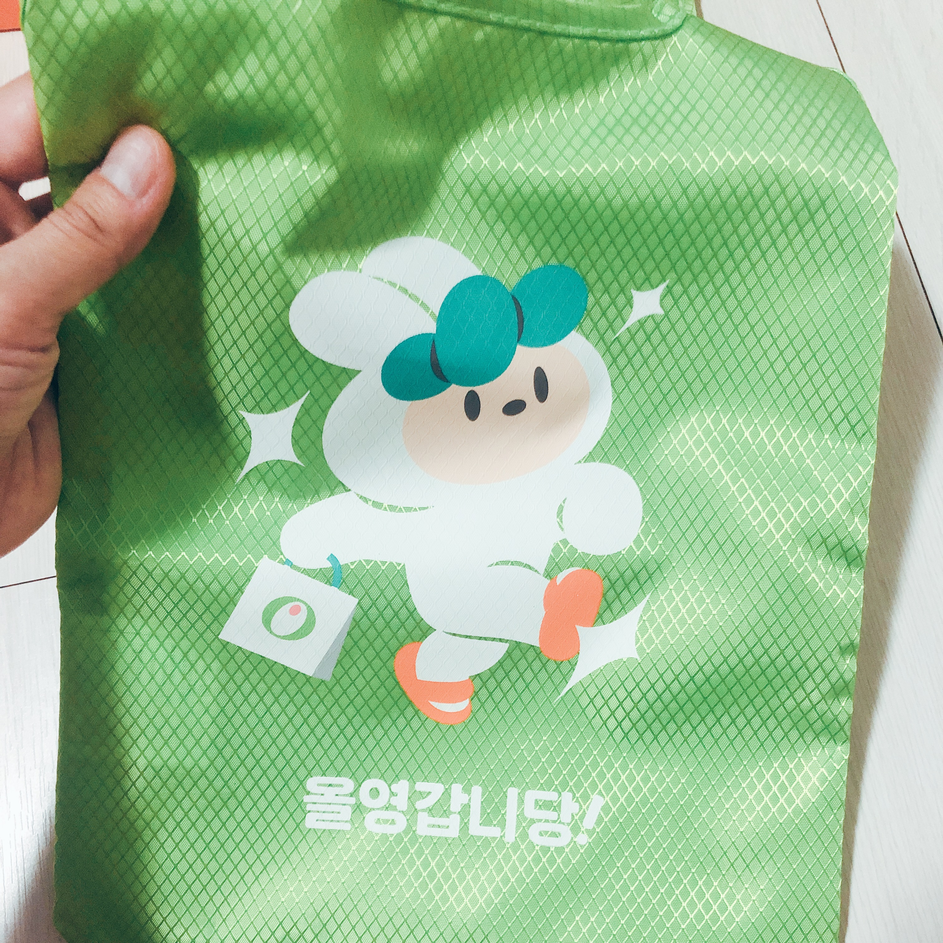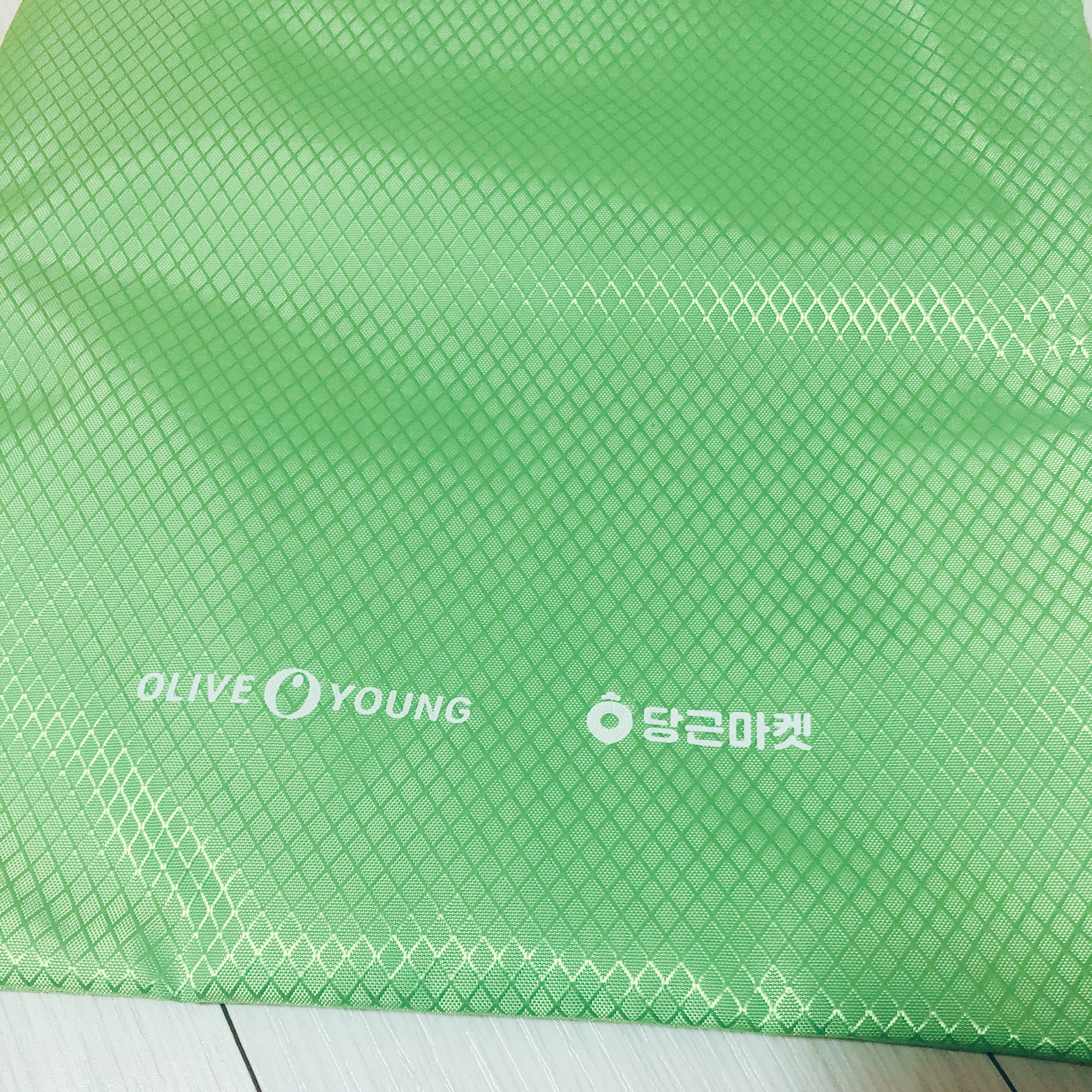뒷면에는 올리브영과 당근마켓의 로고가 나란히 새겨져 있다. 쉽게 오염되지 않는 약간 미끌거리는 재질이다. 그리고 사이즈가 그리 크지 않아서 장바구니로 사용하기에는 어려울 것 같은데, 개인적으로는 장바구니 사이즈가 아니라서 더 마음에 들었다. 동네 슈퍼에서 간단하게 간식 몇가지만 사오고 싶을 때, 출퇴근길에 읽을 책을 넣을 가방이 필요할 때, 올리브영에서 화장품 구입하고 담아올 때 등 - 작은 사이즈의 가방이 훨씬 편리하고 효율적인 순간들도 많다.