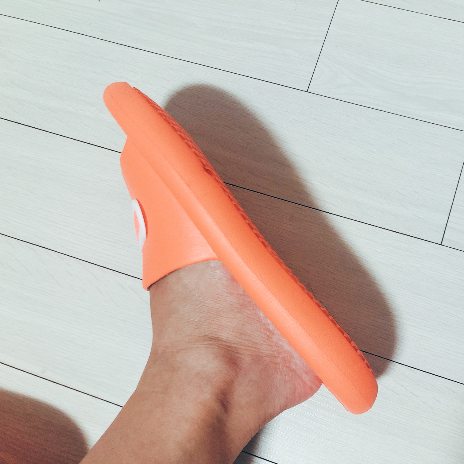 슬리퍼 테두리가 높고 안쪽이 상대적으로 움푹 패여 있는 디자인이라서 신고 있으면 발이 보호받고 있는 듯한 기분이 든다. 발등도 비교적 잘 잡아주는 편이라 바다에 놀러 가서 신으면 딱 좋겠다는 느낌적 느낌이 들었다.
