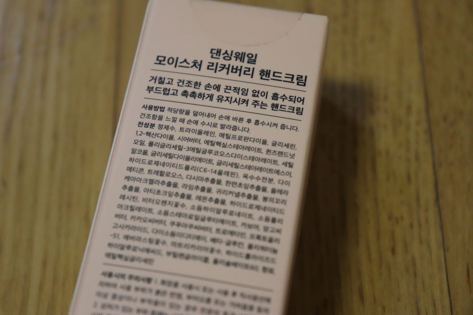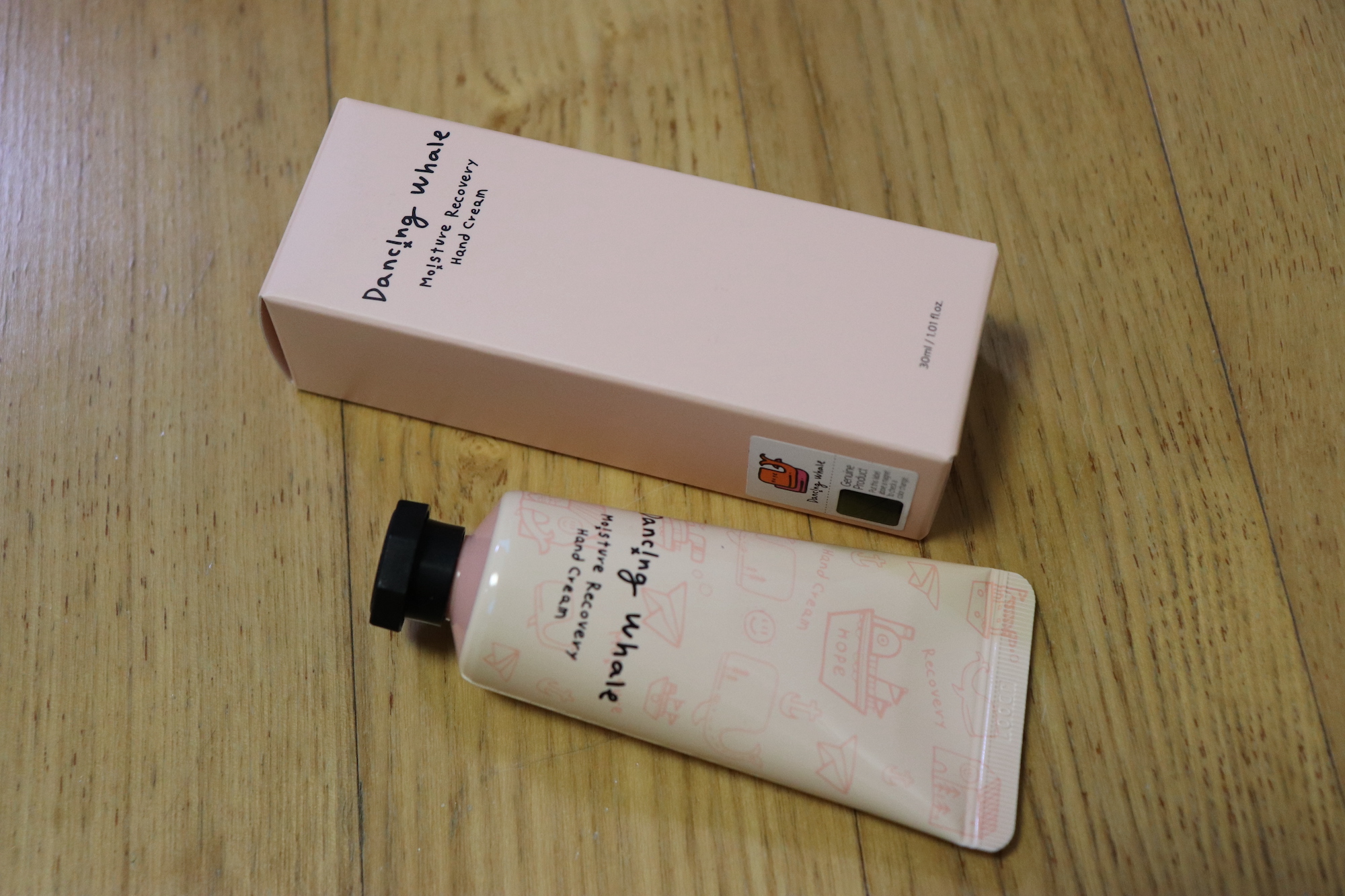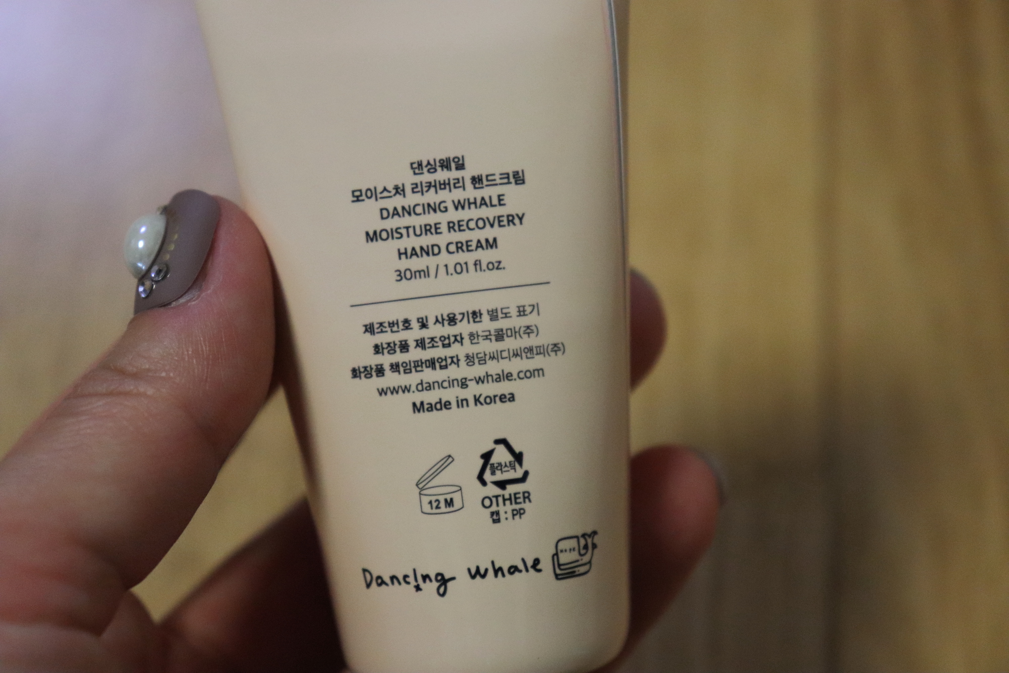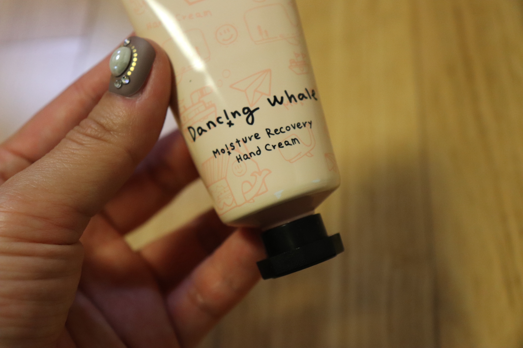 댄싱웨일 모이스처 리커버리 핸드크림이다. 패키지 겉면에 "거칠고 건조한 손에 끈적임 없이 흡수되어 부드럽고 촉촉하게 유지시켜 주는 핸드크림"이라고 적혀있다.