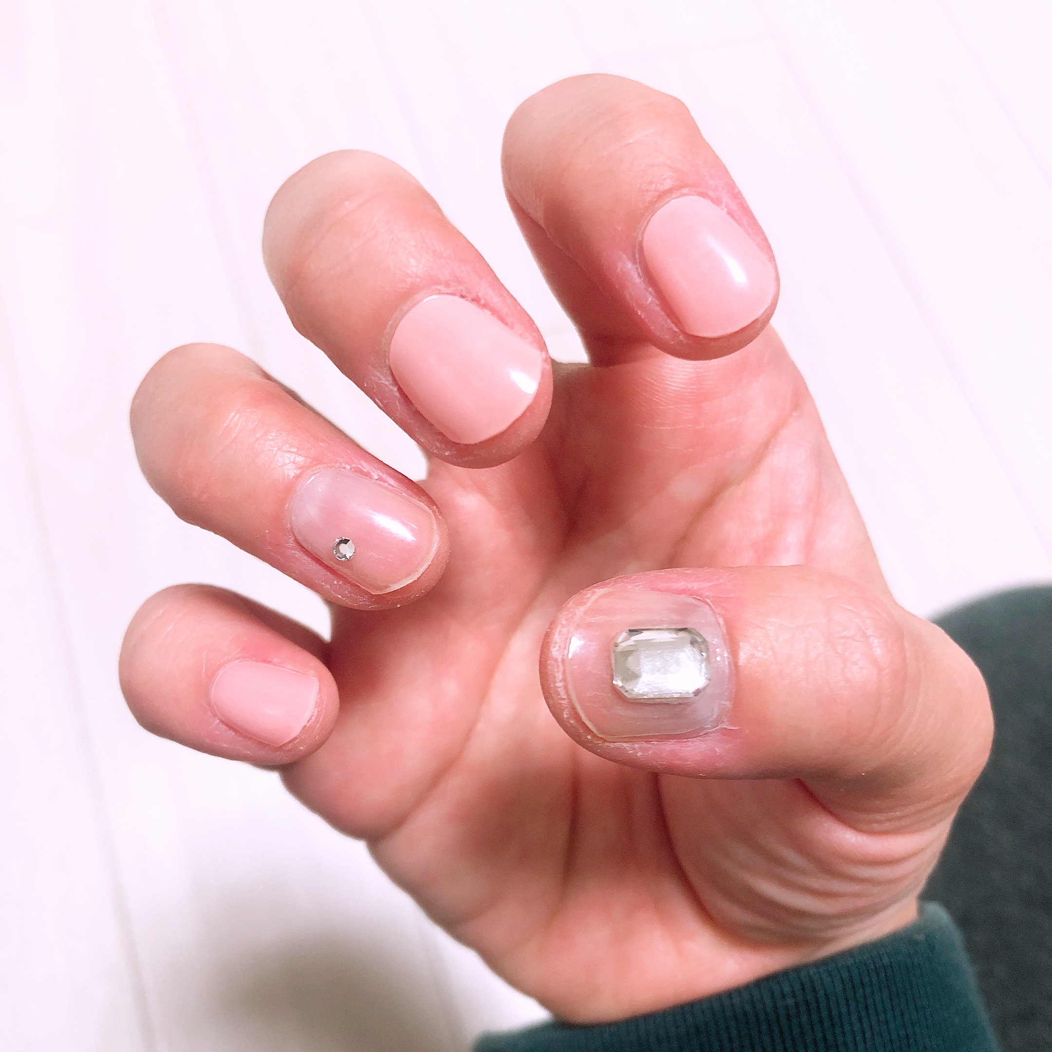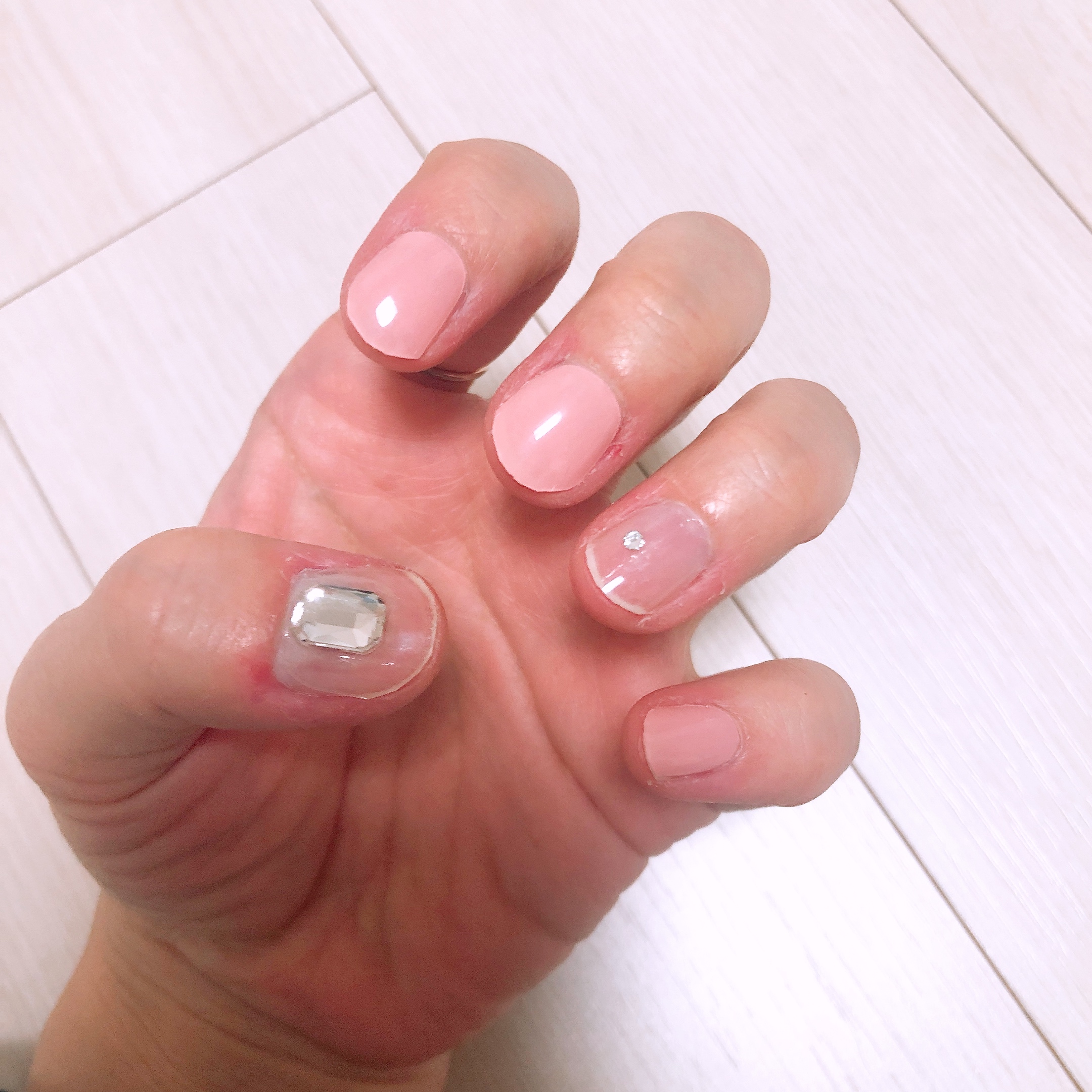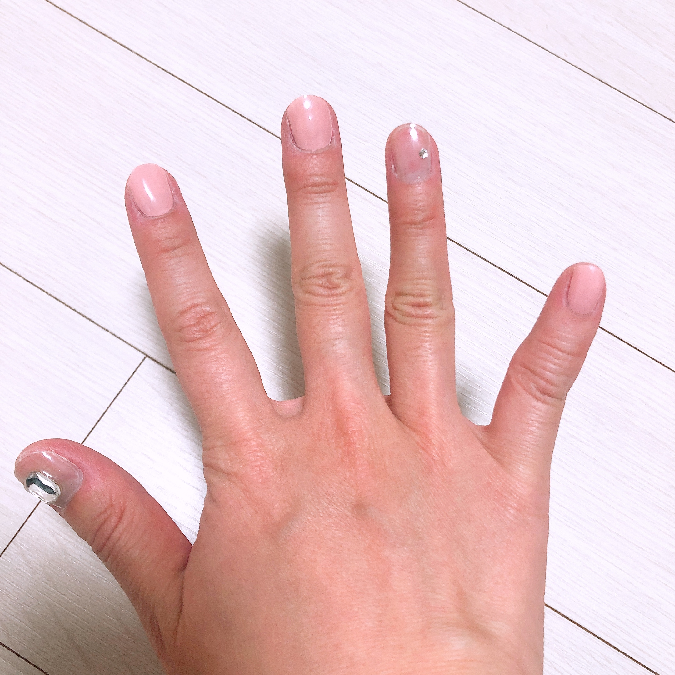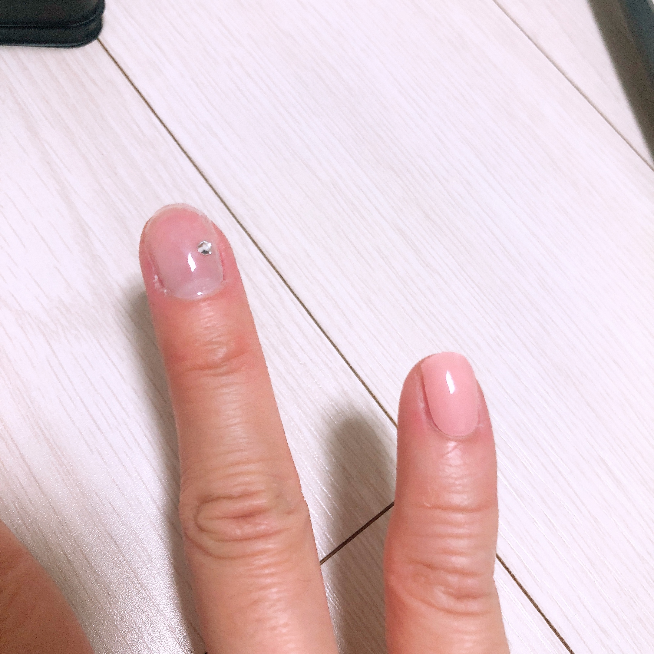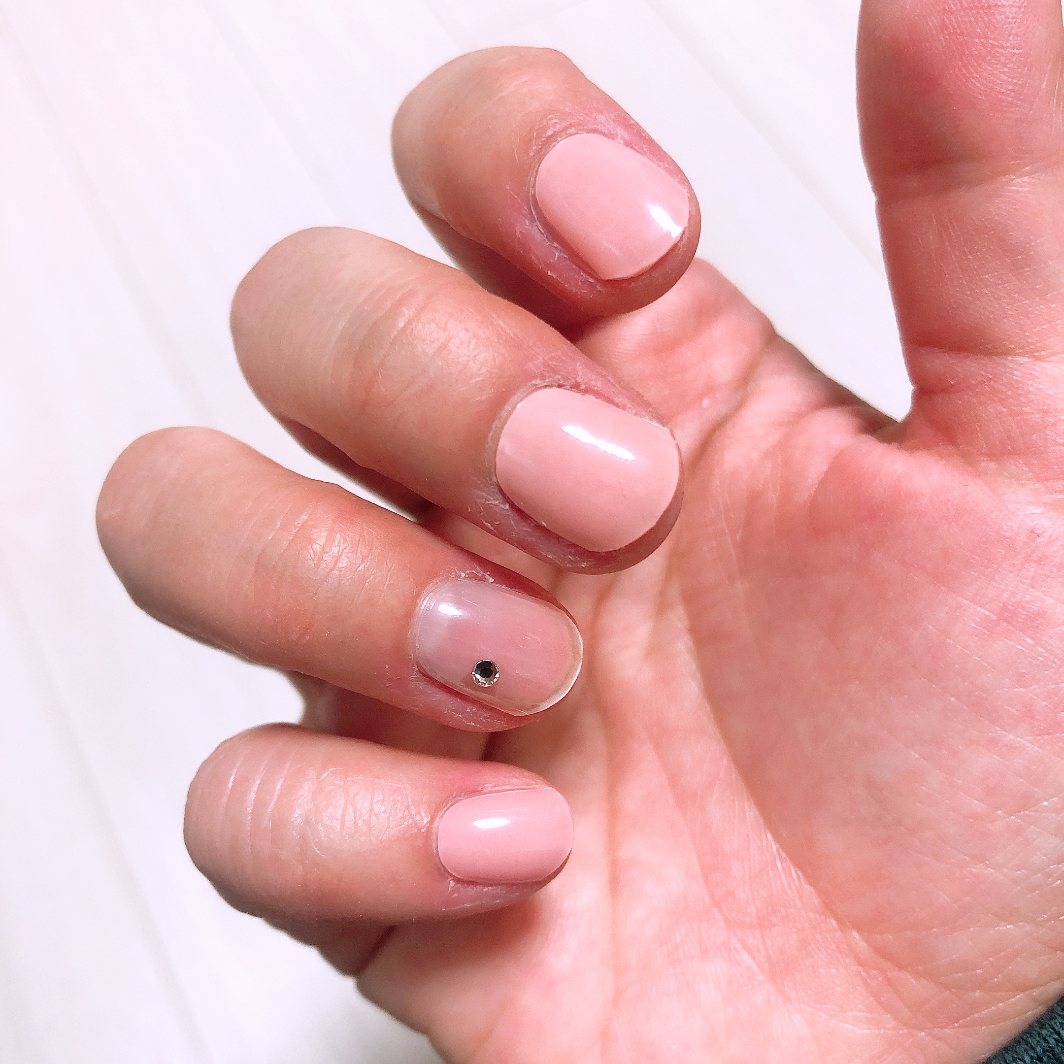 경화 후에 네일파일을 이용하여 한번 더 정리를 해 줄 예정이므로 지금은 끝이 매끄럽지 않아도 된다. 적당히 손톱깎이로 길이만 맞추어 잘랐다. 투명한 샤인 위 아 스트립은 피치 베일과 정말 찰떡같이 잘 어울렸다. 이거 한 다섯개 정도 사가지고 쟁여놔야 할 것 같다-_-;
