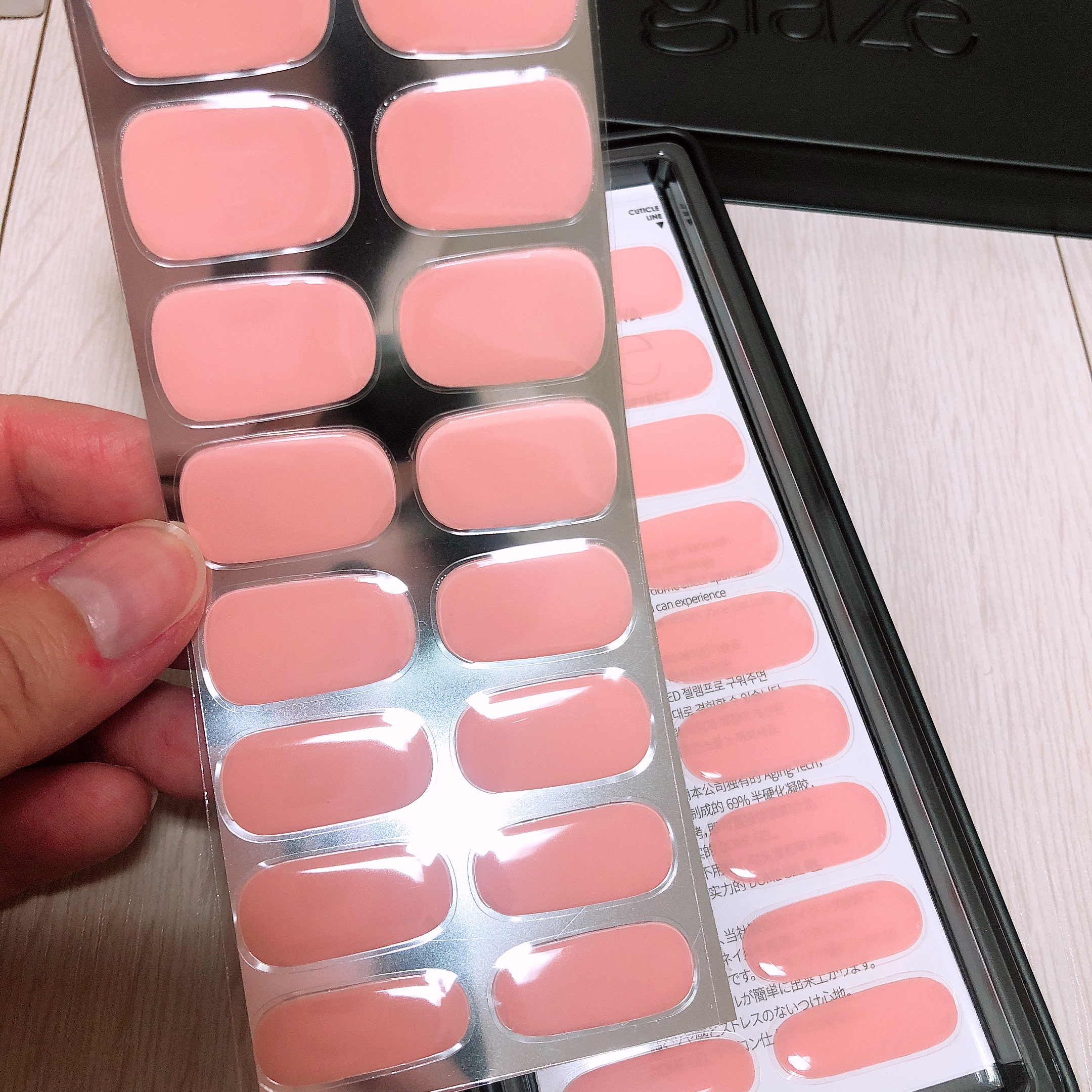 늘 그렇듯 사이즈에 맞추어 미리 젤네일 스트립을 모두 잘라 두었다. 젤네일은 빛에 약하기 때문에 다음에 사용할 것들은 빨리 정리하여 빛이 들어오지 않는 상자 안에 넣어두는 것이 좋다. 데싱디바 상자를 개봉하면 센스있게 검정 패키지 안에 한번 더 포장되어 있기 때문에 다시 그 패키지 안에 보관할 수 있어 편리하다.
