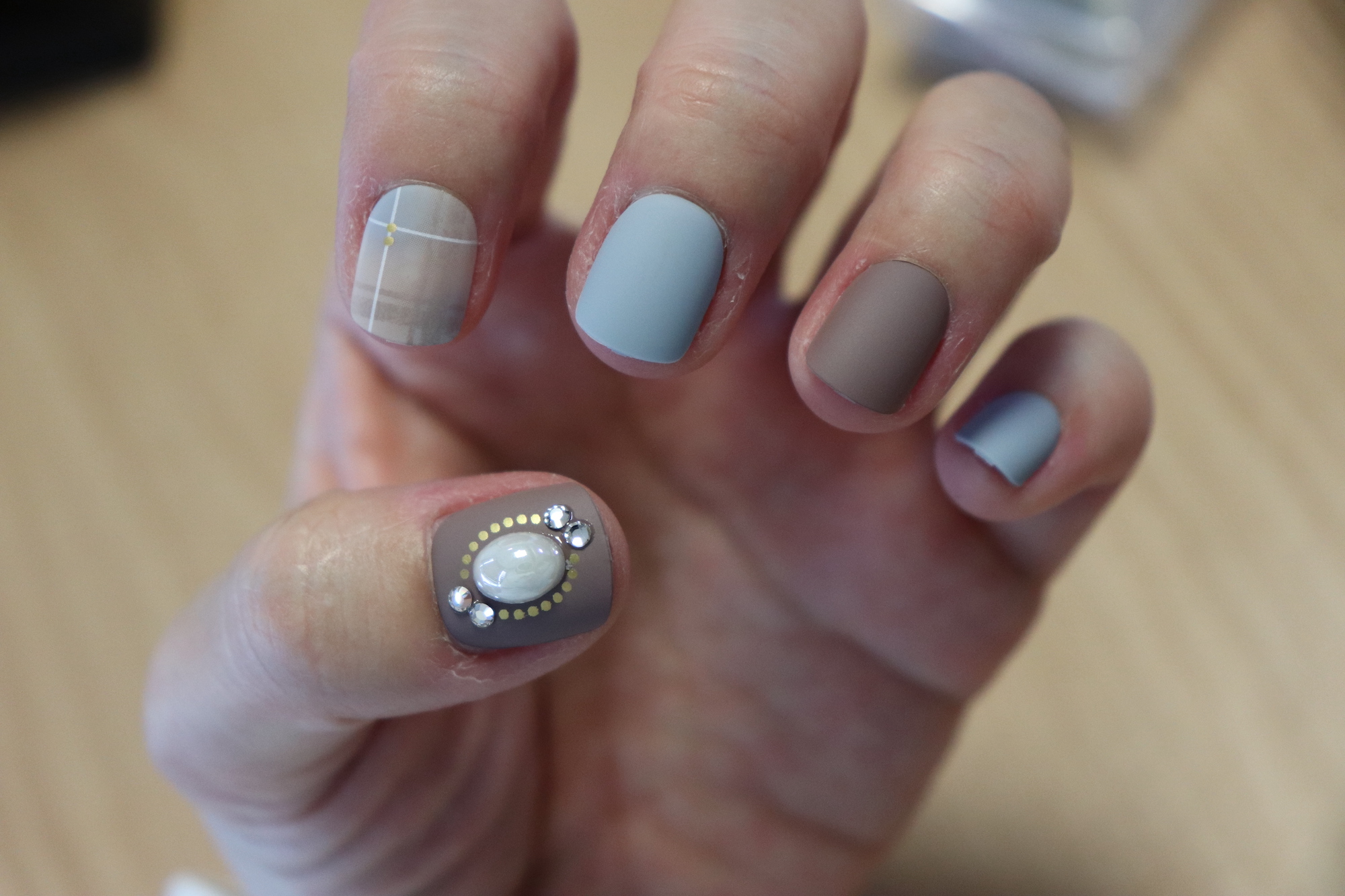 광택 네일팁이 반짝반짝 빛나고 화려해 보이는 장점이 있다면, 무광택 네일팁은 또 그만의 매력이 있다. 차분해 보이는 원색과 체크무늬 패턴이 안어울리는 듯 하면서도 또 묘하게 어울린다.