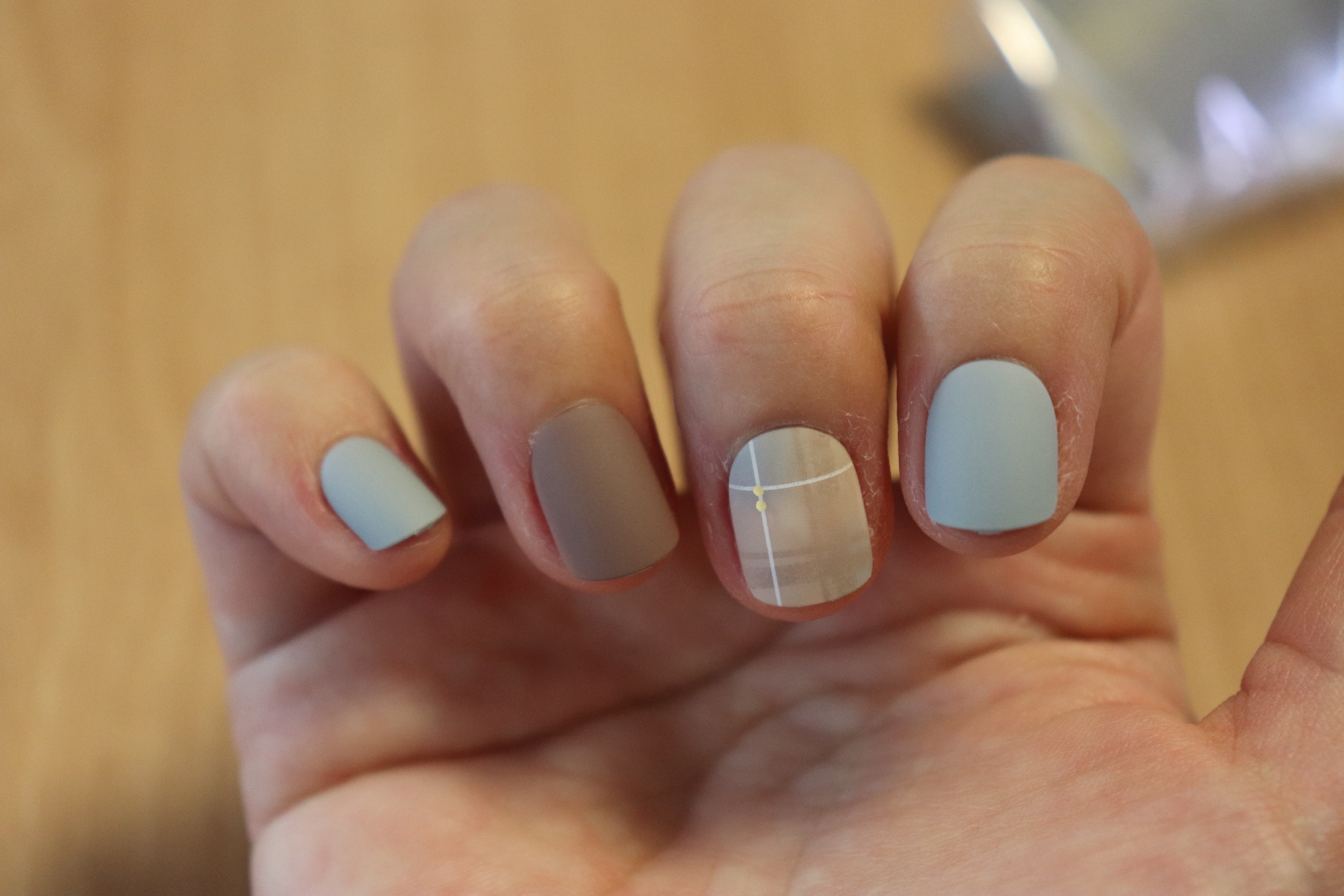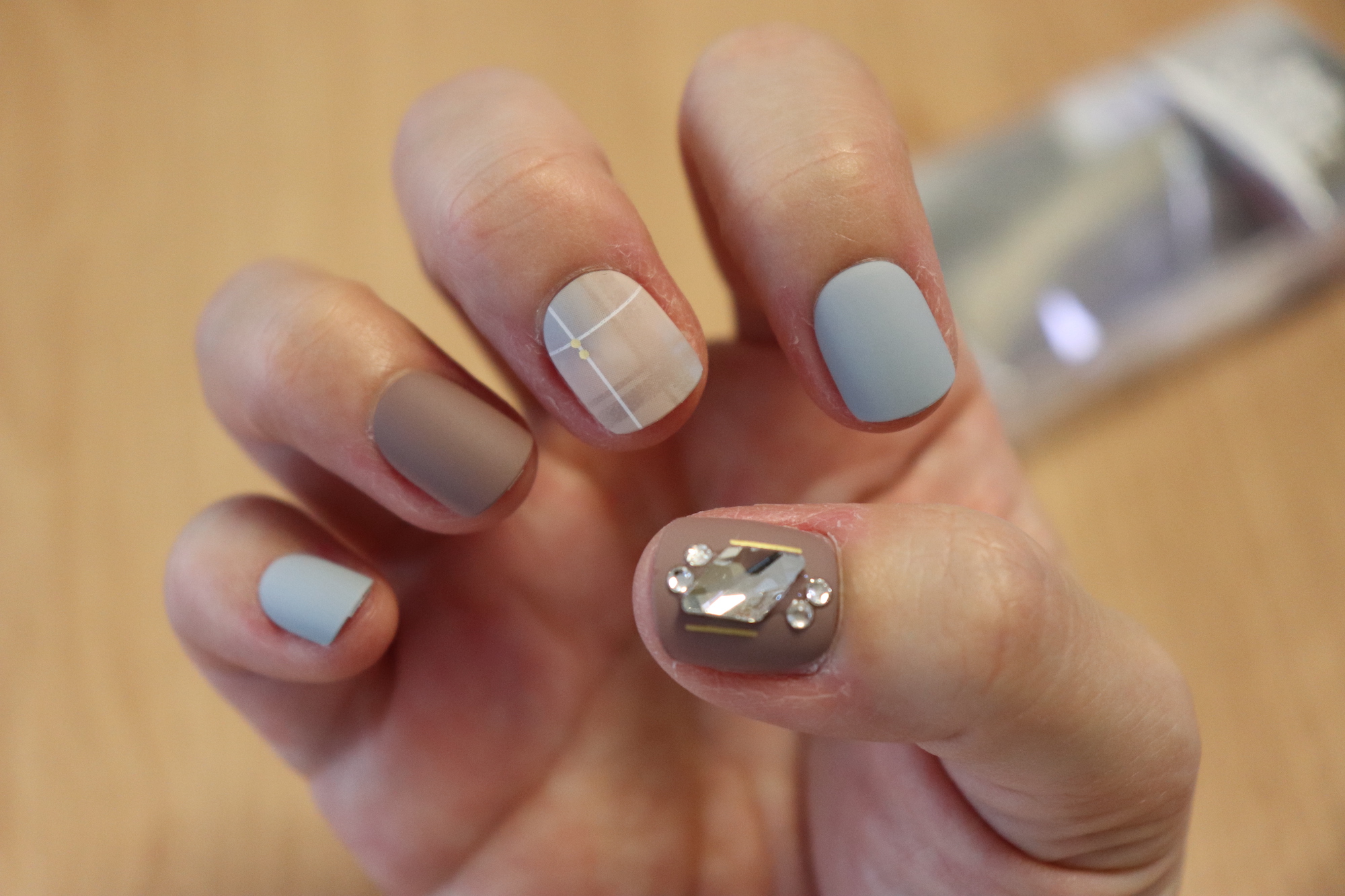 광택 네일팁이 반짝반짝 빛나고 화려해 보이는 장점이 있다면, 무광택 네일팁은 또 그만의 매력이 있다. 차분해 보이는 원색과 체크무늬 패턴이 안어울리는 듯 하면서도 또 묘하게 어울린다.