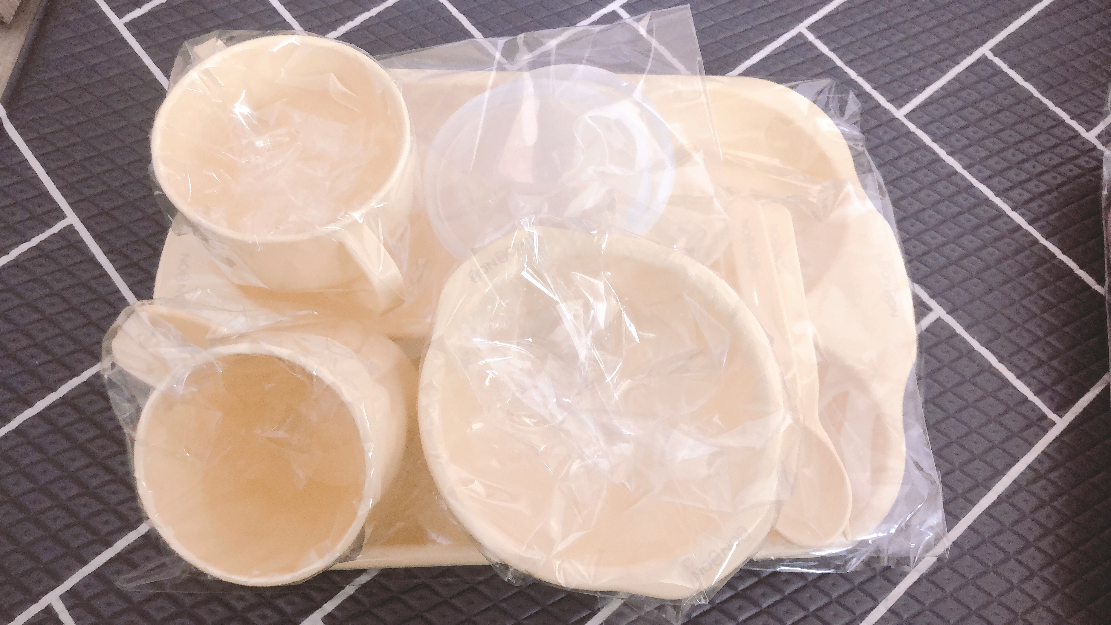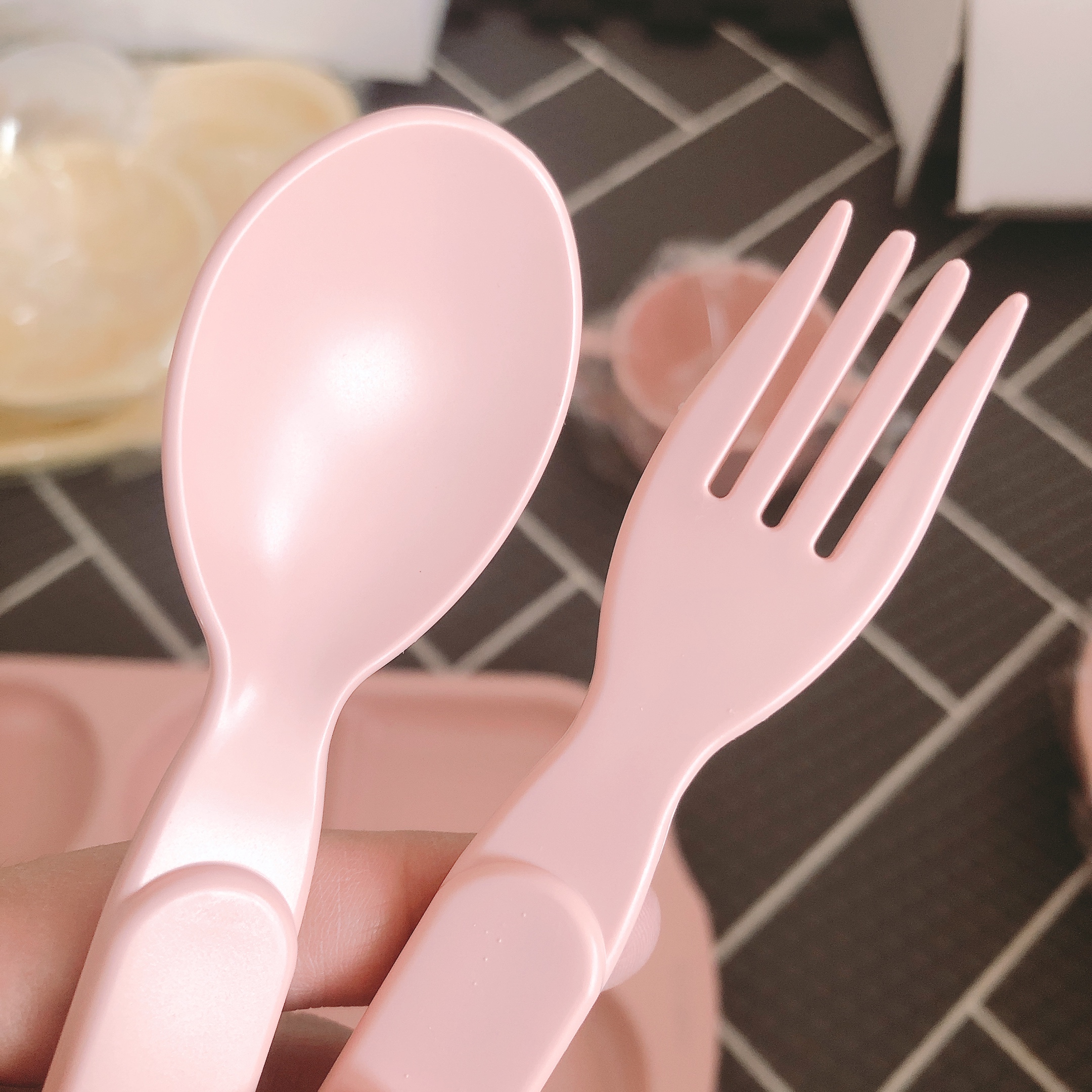 식판(옥수수 플레이트)은 299 x 210 x 27mm 로 사이즈와 깊이 모두 넉넉하다. 수저세트는 스푼(Spoon)과 포크(Fork)로 이루어져 있는데 젓가락 옵션이 없는 점은 조금 아쉽다. 길이는 140mm 정도이다.