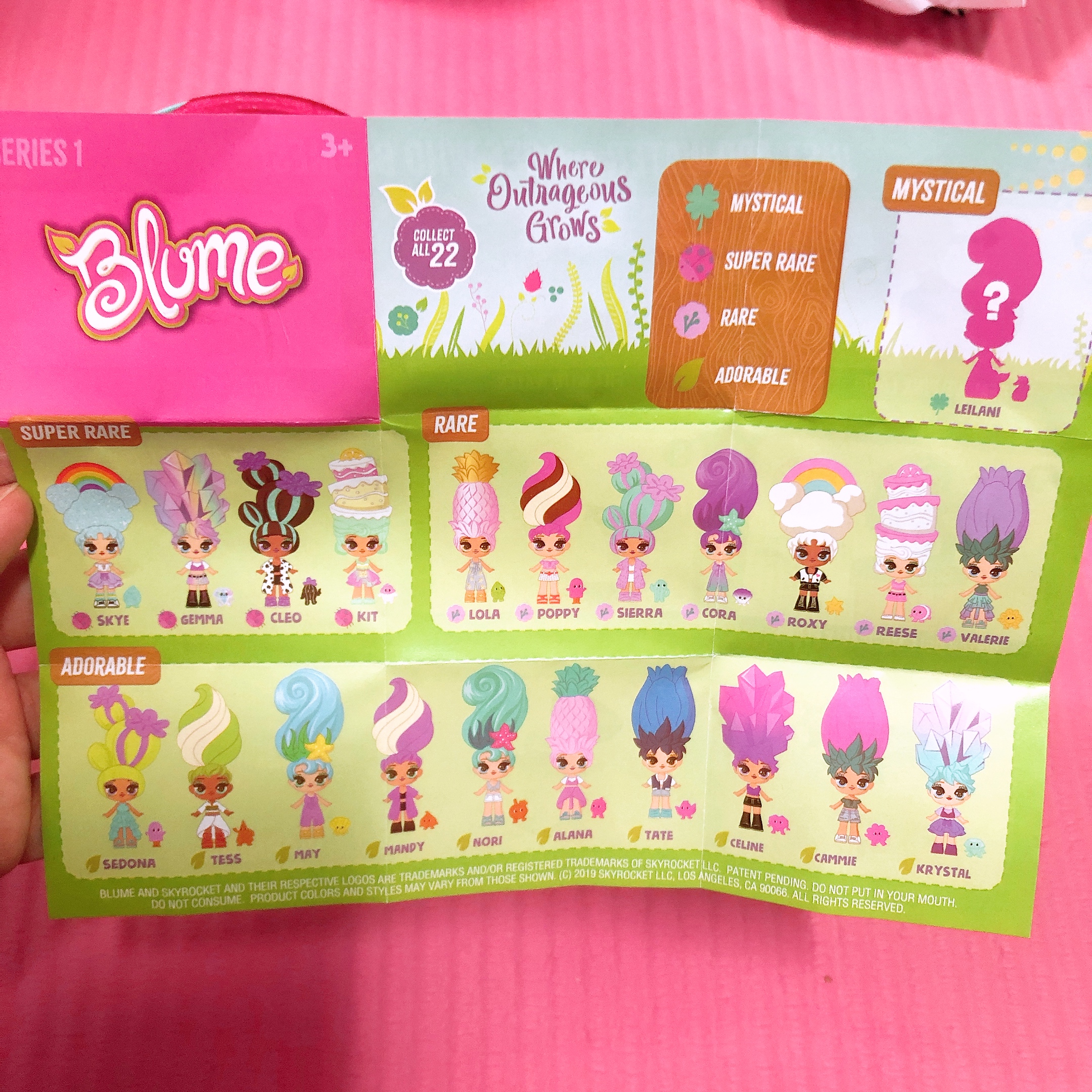 또 반대쪽 면에는 블룸돌즈 화분에서 랜덤으로 나오는 다양한 캐릭터 종류가 소개되어 있었다. 블룸돌즈 캐릭터는 4레벨로 나뉘어 있는데 미스티컬 1명, 수퍼레어 4명, 레어 7명, 어도러블 10명 -> 총 22명이다. 화분에 물방울을 떨어뜨리기 전에는 안에 어떤 피규어가 들어있는지 전혀 알 수 없기 때문에, 화분을 여는 순간이 더욱 흥미진진하고 스릴있다.