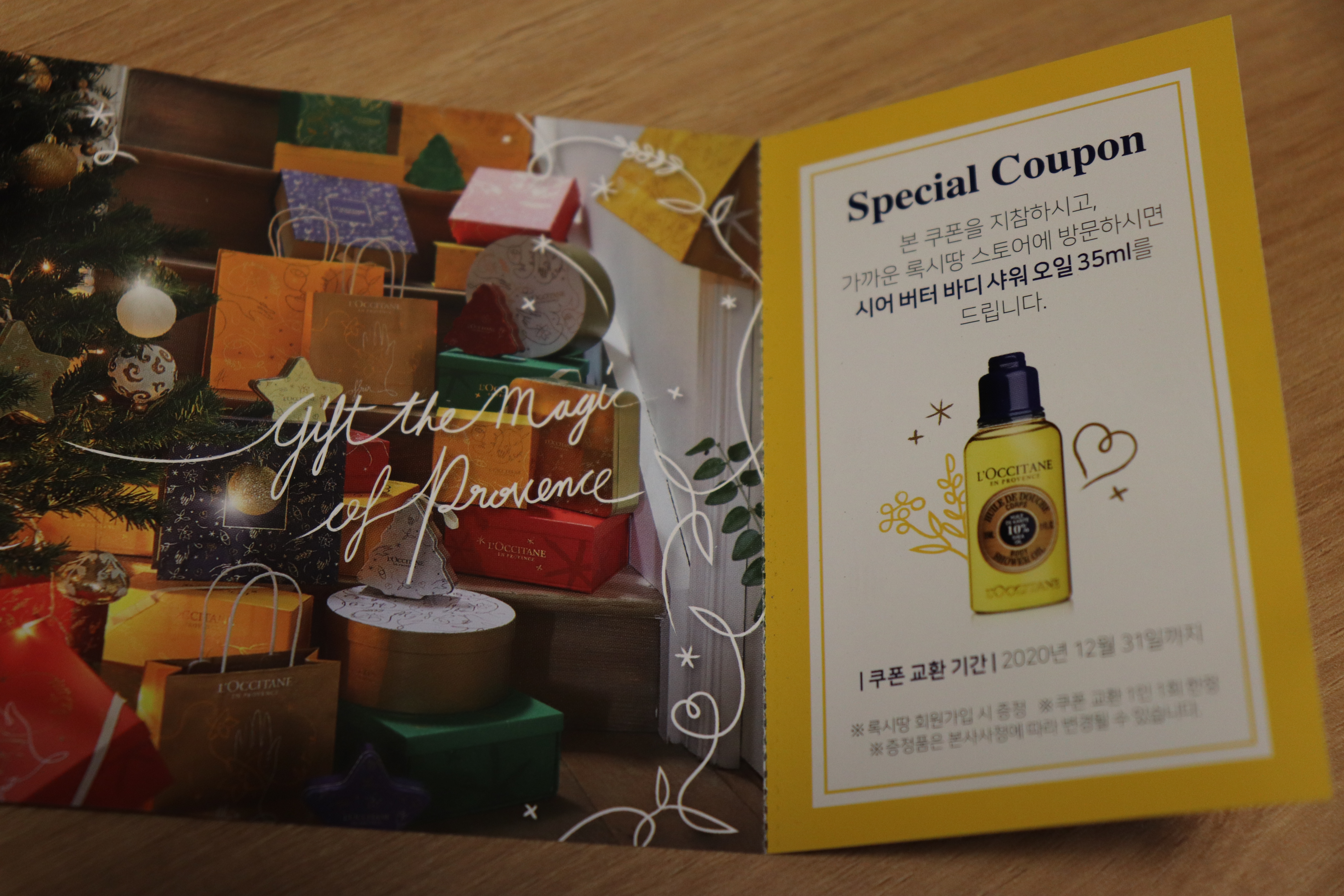 연말까지 가까운 록시땅 스토어에 방문하면 시어 버터 바디 샤워 오일 35ml를 받을 수 있는 쿠폰 한 장이 동봉되어 있다. 이번에 산 핸드크림을 다 쓰면 오프라인 샵에 가져가서 바디 샤워 오일도 받고 핸드크림도 추가로 구입해야 겠다.