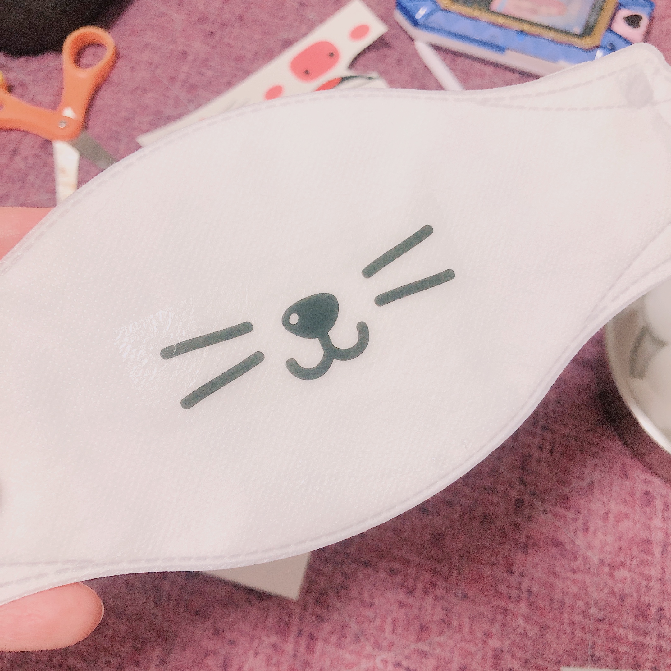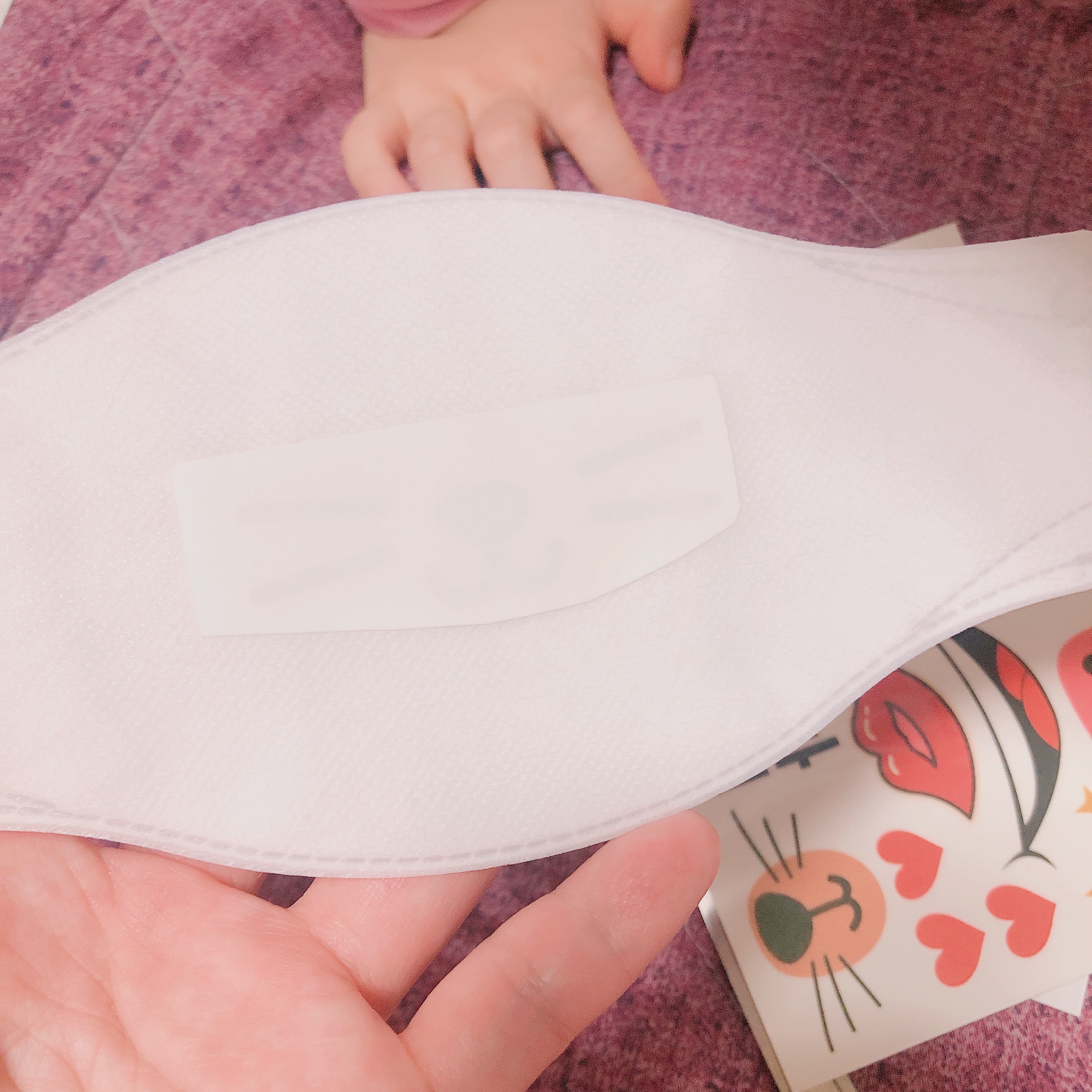 4. 조심스럽게 종이를 떼어내면 끝! 마스크에 판박이가 예쁘게 부착된 것을 확인할 수 있다.