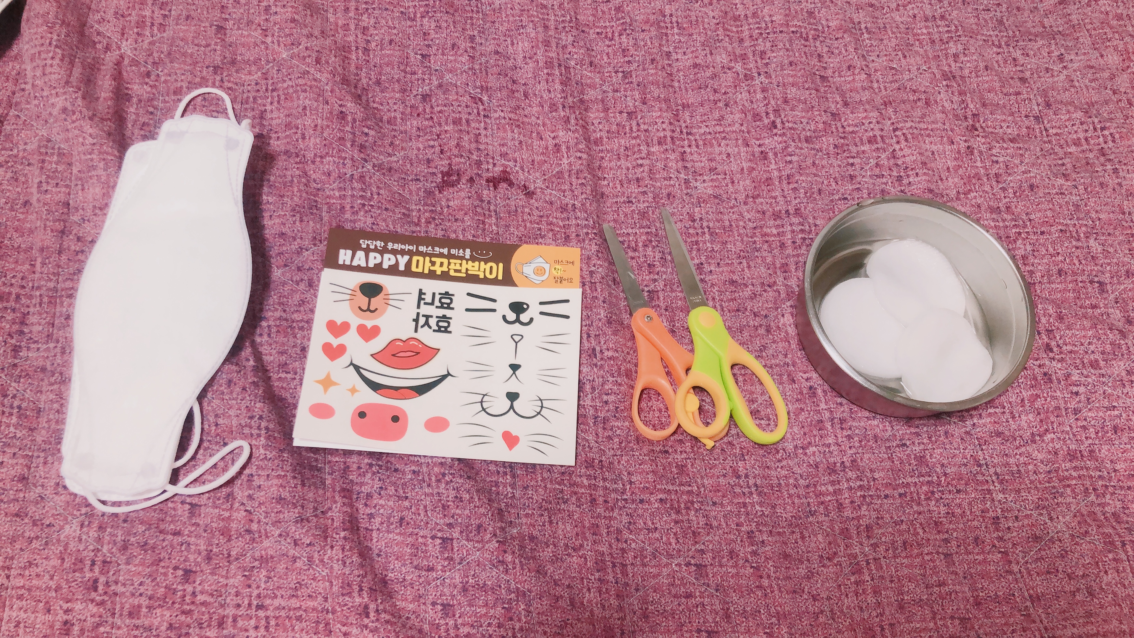 준비물은 초초초 간단하다. 마스크, 마꾸스티커, 가위, 물 - 이렇게 딱 네가지만 있으면 된다. 나는 물에 화장솜을 적셔서 사용했는데 다 하고나서 생각해보니 물티슈로 하면 좀 더 쉬웠을 것 같다.