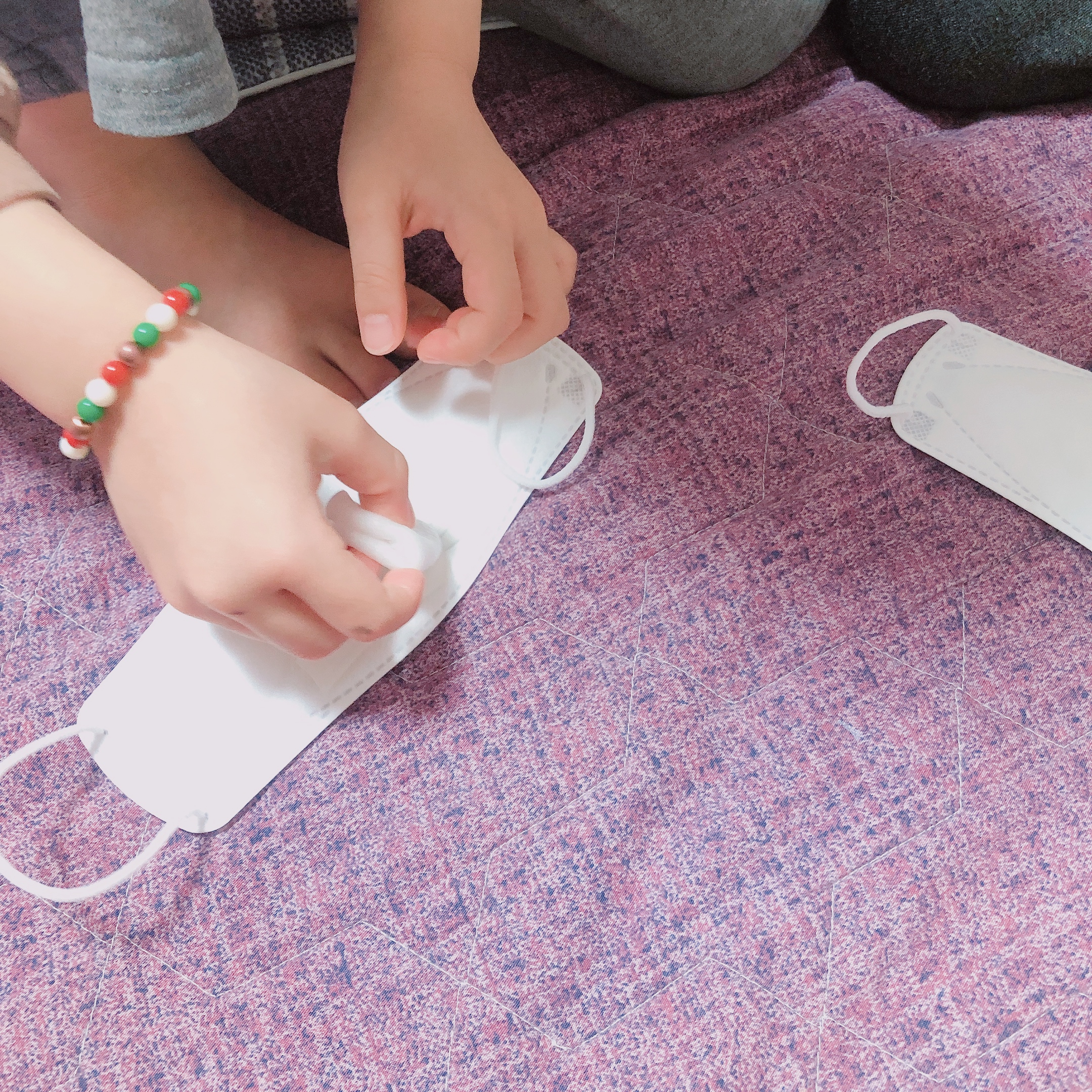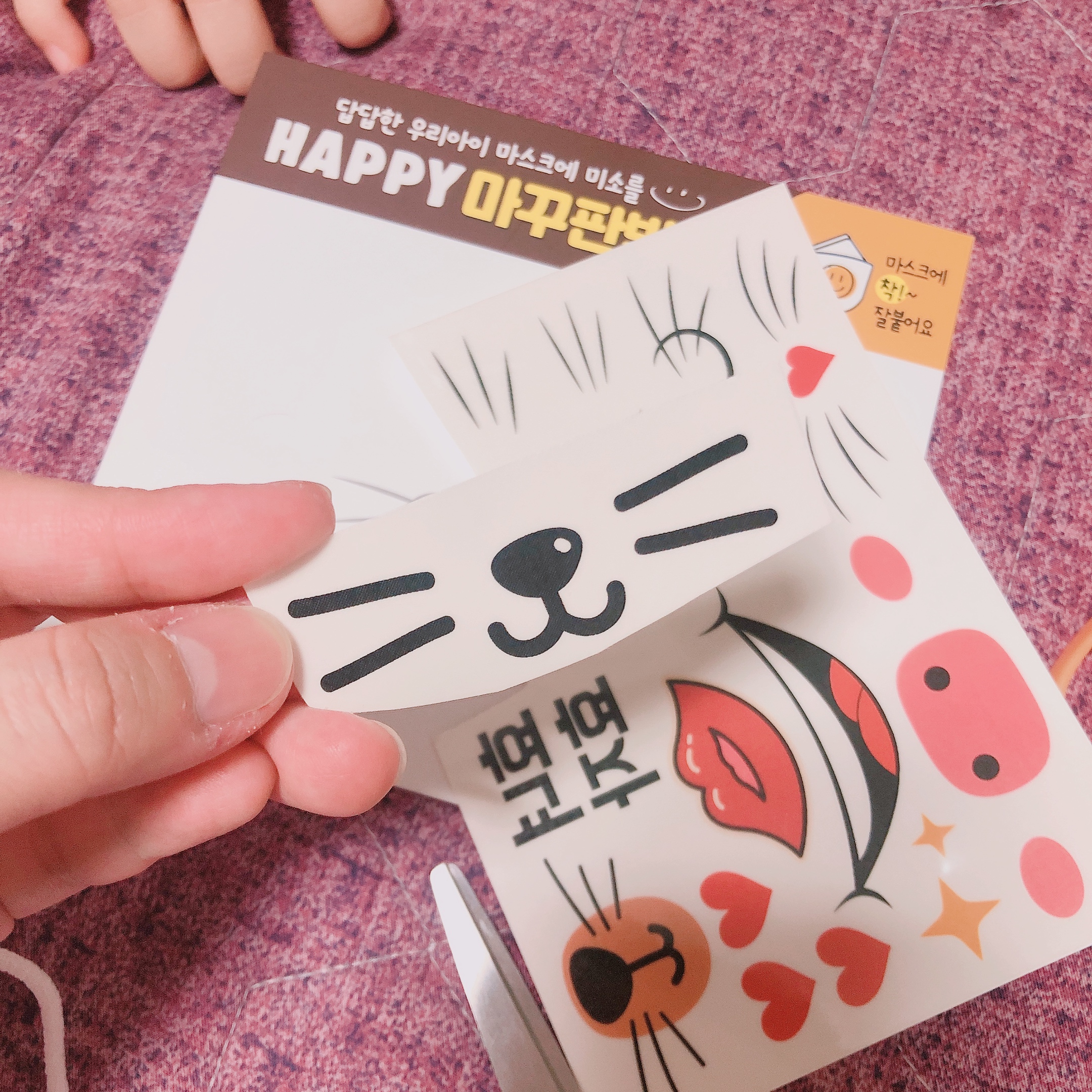얼마 전 방수네임스티커를 구입했는데 HAPPY 마꾸판박이라는 마스크 꾸미기 판박이 스티커를 사은품으로 받았다. 아이들과 놀이하면 재미있을 거 같아서 보관해 두었었는데, 어젯 밤 취침준비를 하다가 갑자기 마꾸판박이가 떠올랐다. 원래 이런 건 떠올랐을 때 바로 해야되는거다. (노는 건 절대 미루지 않는 엄마-_-...)