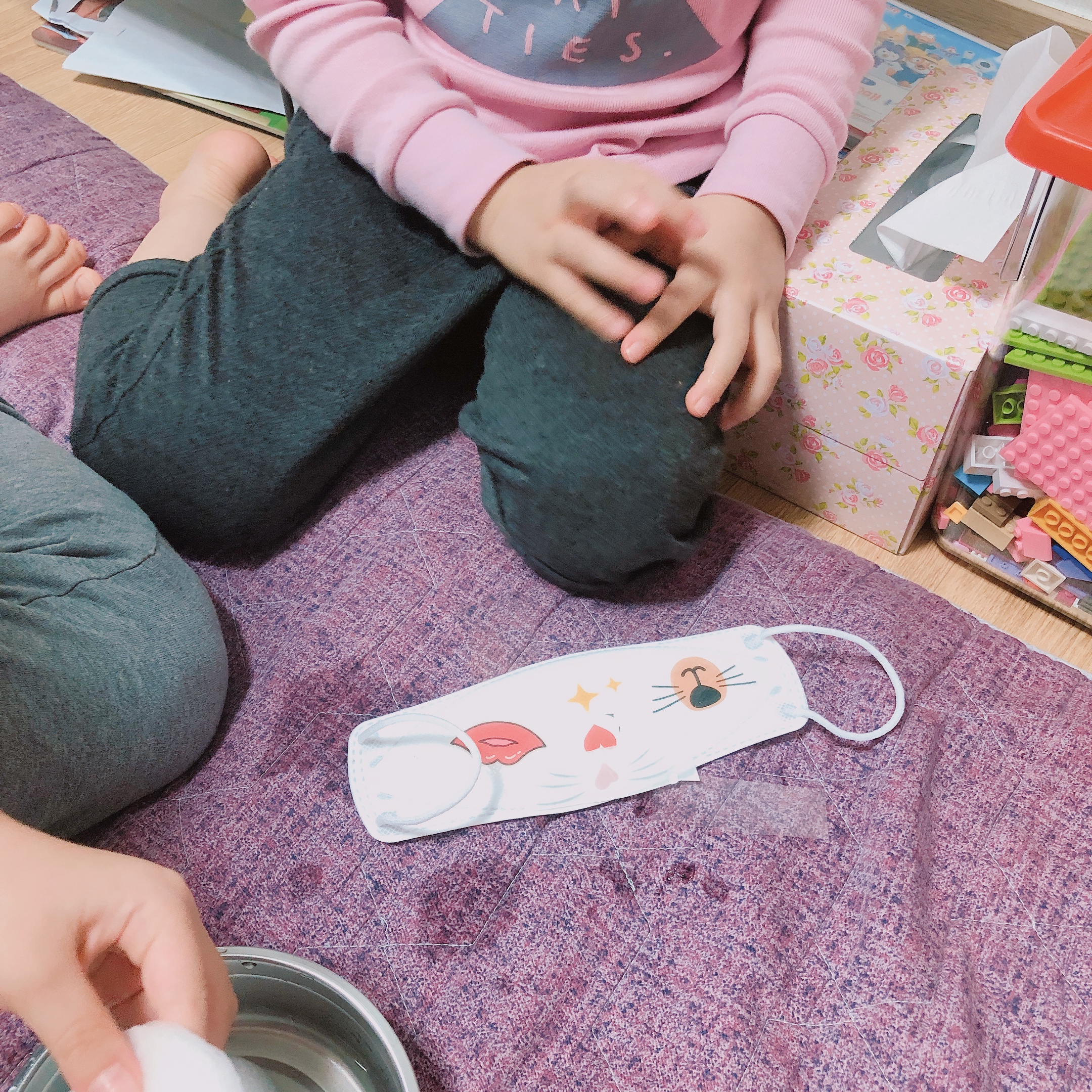 얼마 전 방수네임스티커를 구입했는데 HAPPY 마꾸판박이라는 마스크 꾸미기 판박이 스티커를 사은품으로 받았다. 아이들과 놀이하면 재미있을 거 같아서 보관해 두었었는데, 어젯 밤 취침준비를 하다가 갑자기 마꾸판박이가 떠올랐다. 원래 이런 건 떠올랐을 때 바로 해야되는거다. (노는 건 절대 미루지 않는 엄마-_-...)