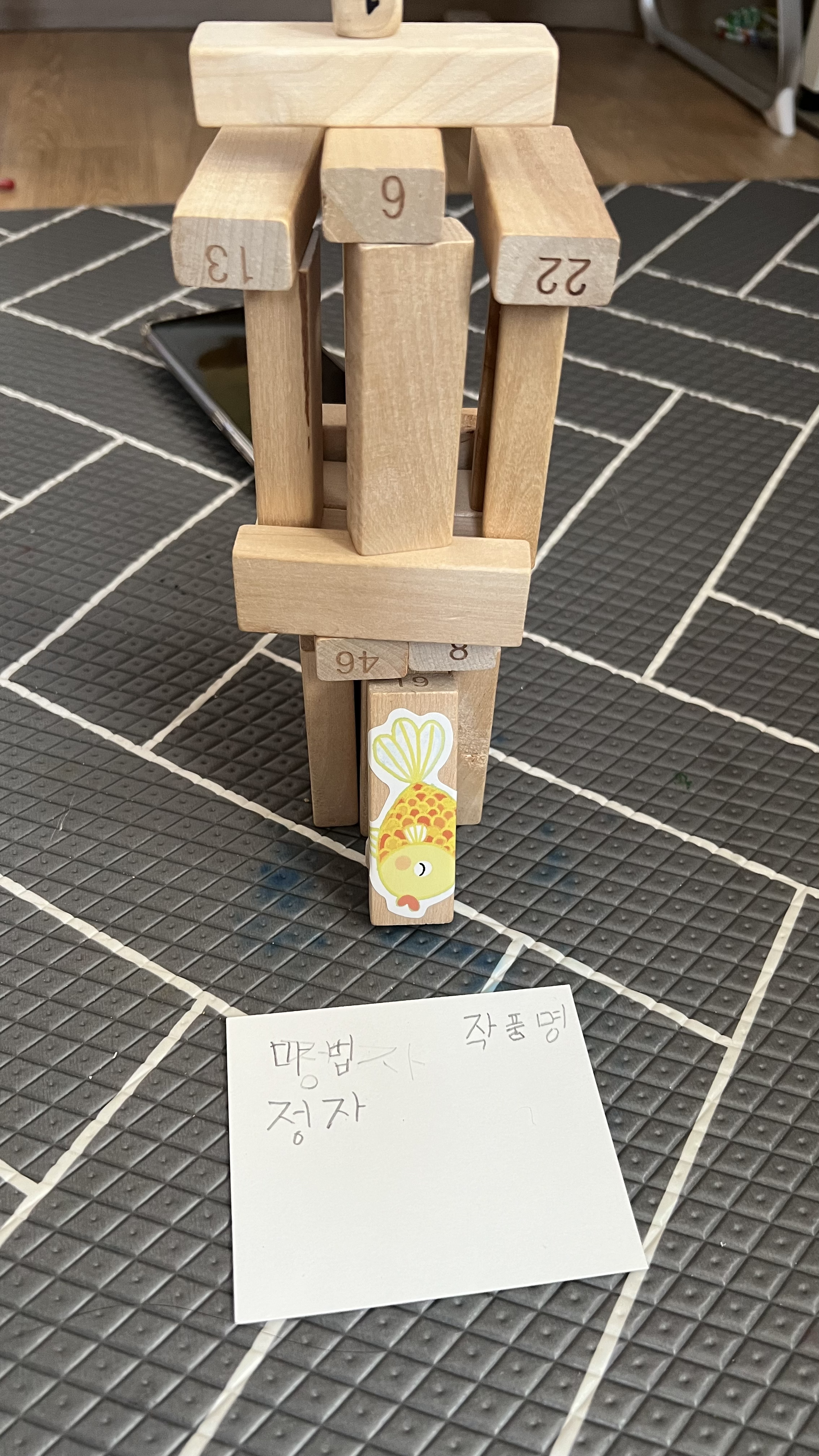 주말에 젠가를 가지고 탑을 쌓고 놀다가 그럴싸한 결과물이 나와서 '이거 전시 하면 좋겠다' 라고 말했다. 잠시 뒤에 둘째 소요미에게 전시장을 열었다는 소식을 받아서, 첫째 하요미와 문어 인형 옥토와 함께 전시 관람을 하러 갔다.