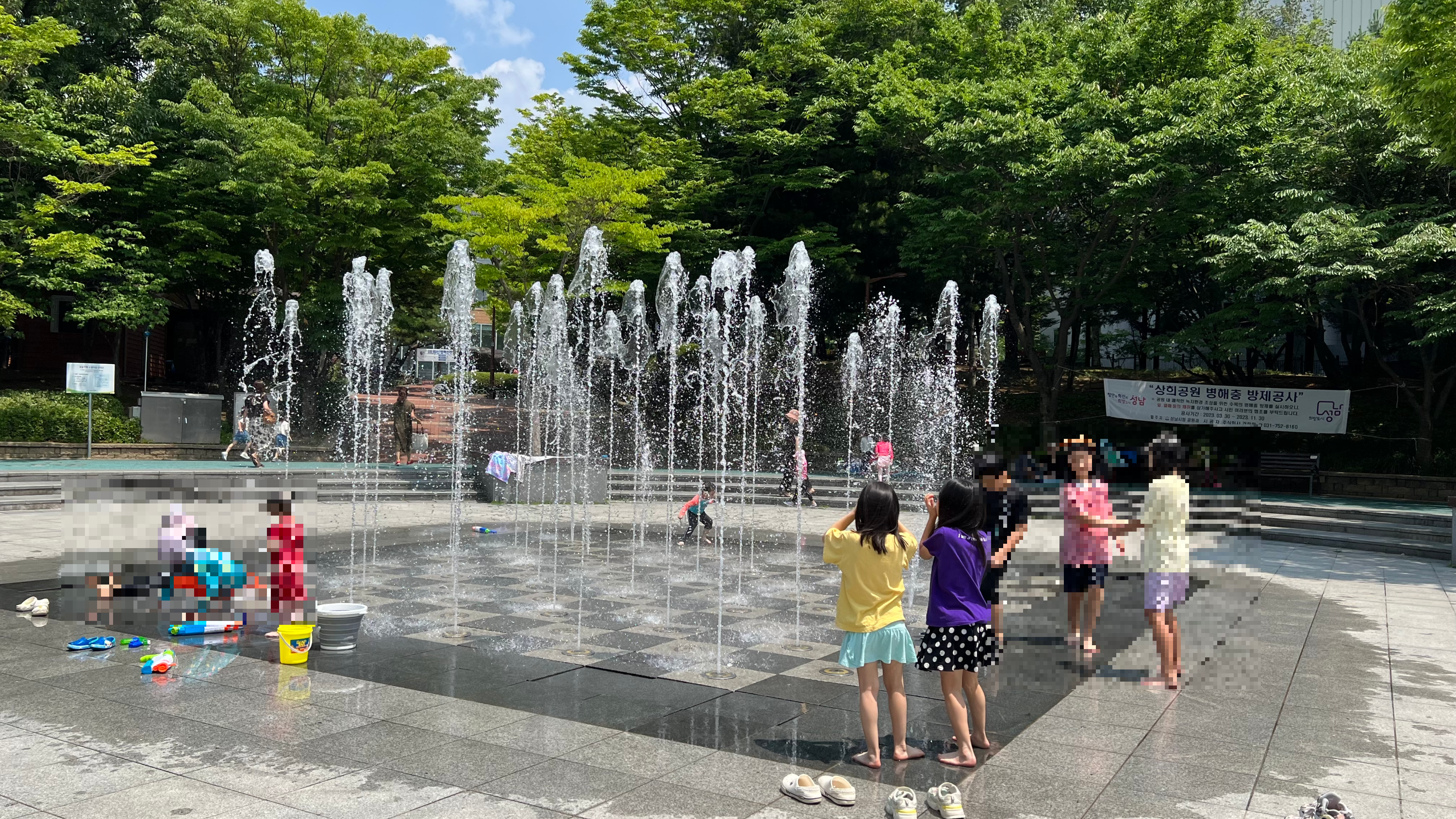 날이 무척 더운 주말이었는데, 놀이터에 가보겠다고 걷다가 상희공원에서 분수를 발견했다. 블럭 바닥에서 나오는 분수였는데 물놀이가 가능했는지 십여명의 아이들이 물놀이를 즐기고 있었다. 아예 수영복을 입고 나온 아이들도 있었고, 부모님들은 그늘 아래 돗자리를 깔고 휴식을 취하고 있었다.