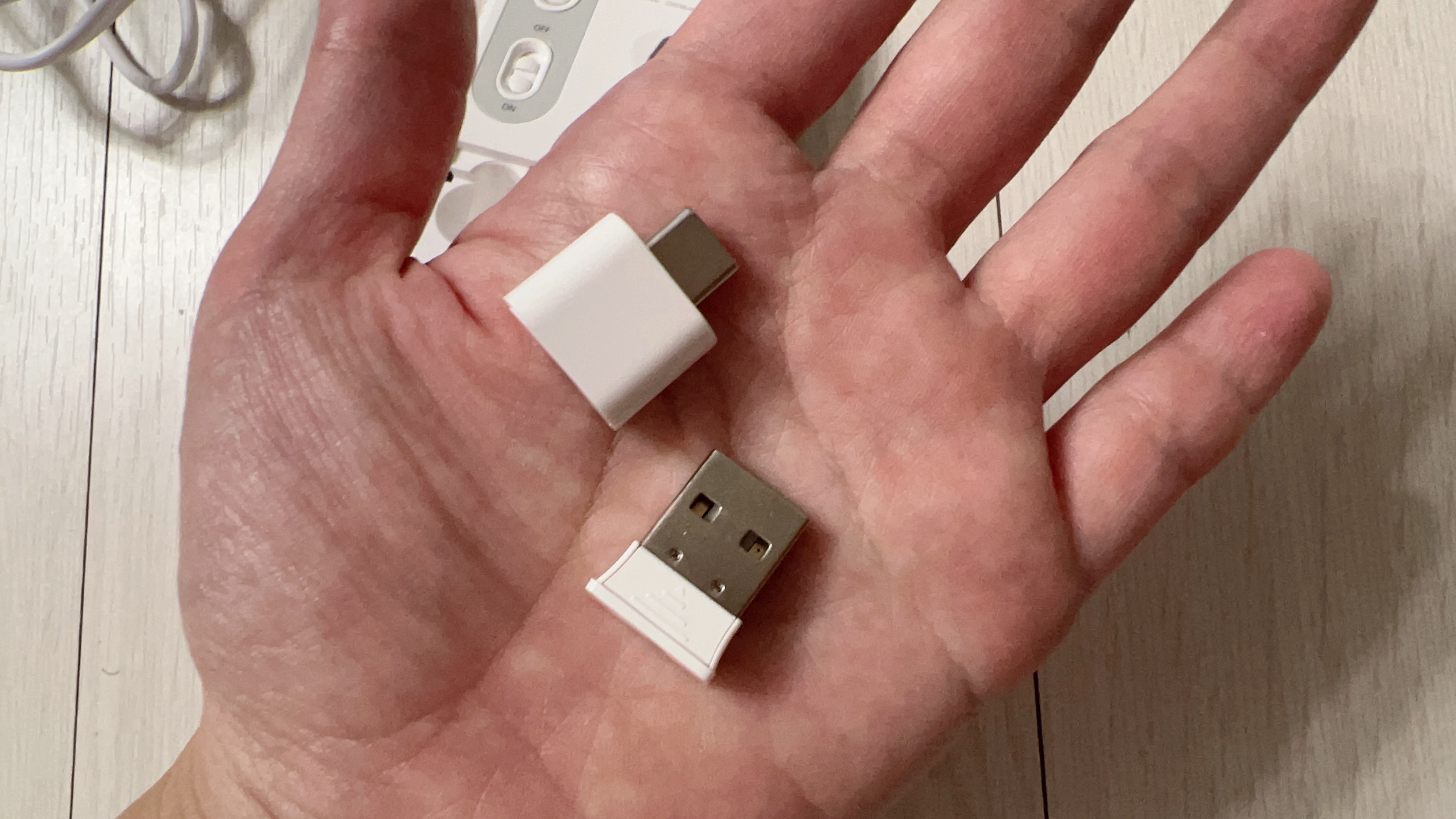 마우스 아래쪽에 리시버가 나란히 들어있다. 레드빈 무소음 마우스의 가장 큰 장점이 듀얼리시버 기능이라고 할 수 있는데, 이 두개의 리시버를 각각 다른 기기에 연결하여 스위칭 버튼으로 전환하여 사용할 수 있다는 점이다. 예를 들어 스마트폰에는 C타입 리시버를 꽂아두고, PC 컴퓨터에는 USB타입 리시버를 꽂아 둔 상태라고 가정해 보자. 스위칭 버튼을 누르면 리시버가 거의 바로 전환되어 하나의 마우스로 두 개의 기기를 동시에 사용할 수 있는 것이다.